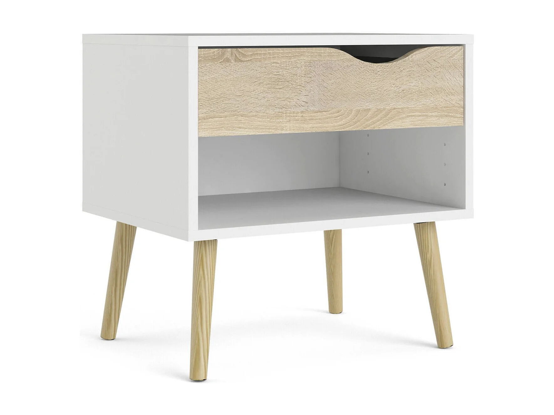 Mesita de noche con un cajón y un compartimento de almacenamiento, color blanco y roble, Medidas 50 x 49 x 39 cm