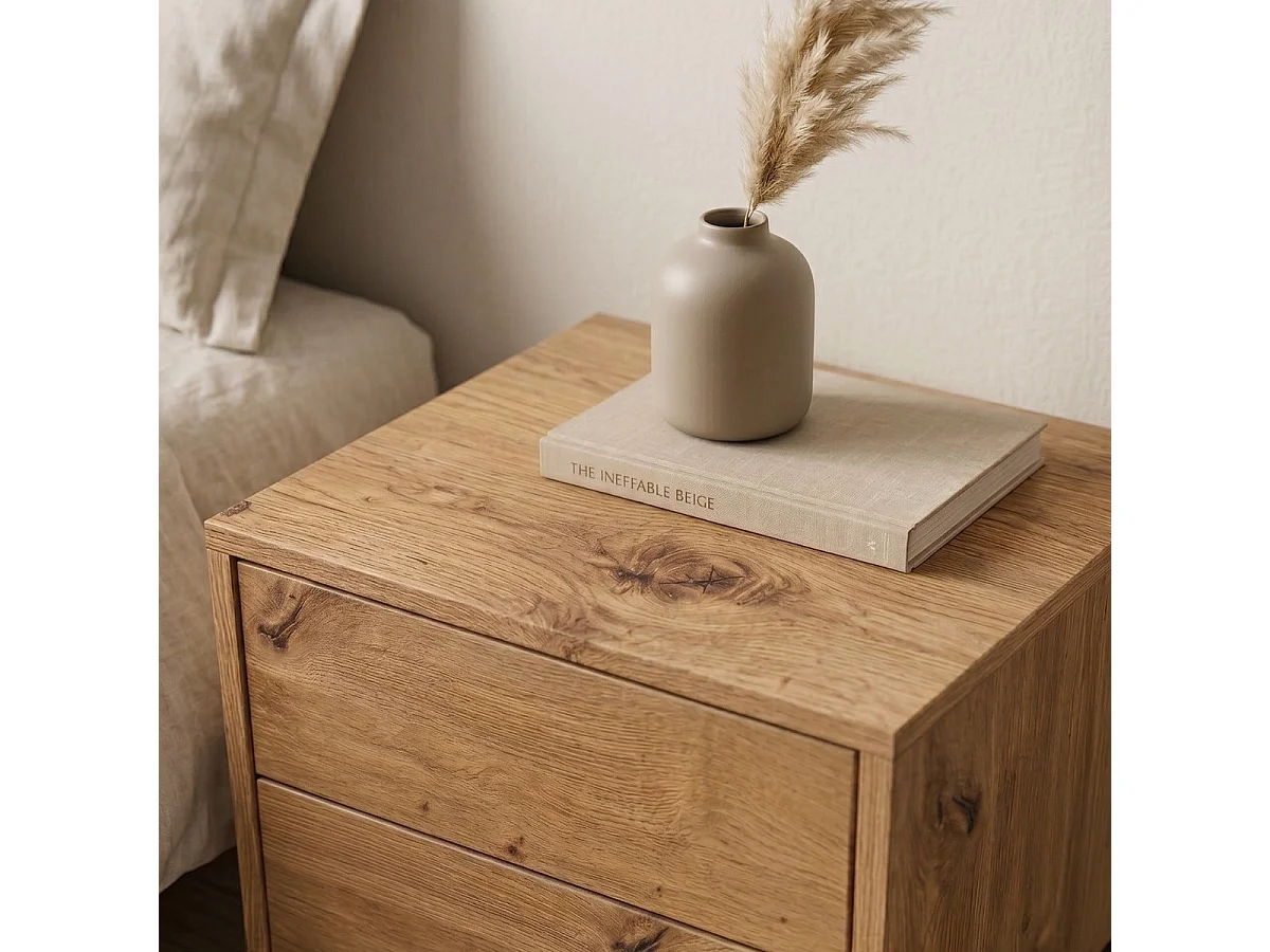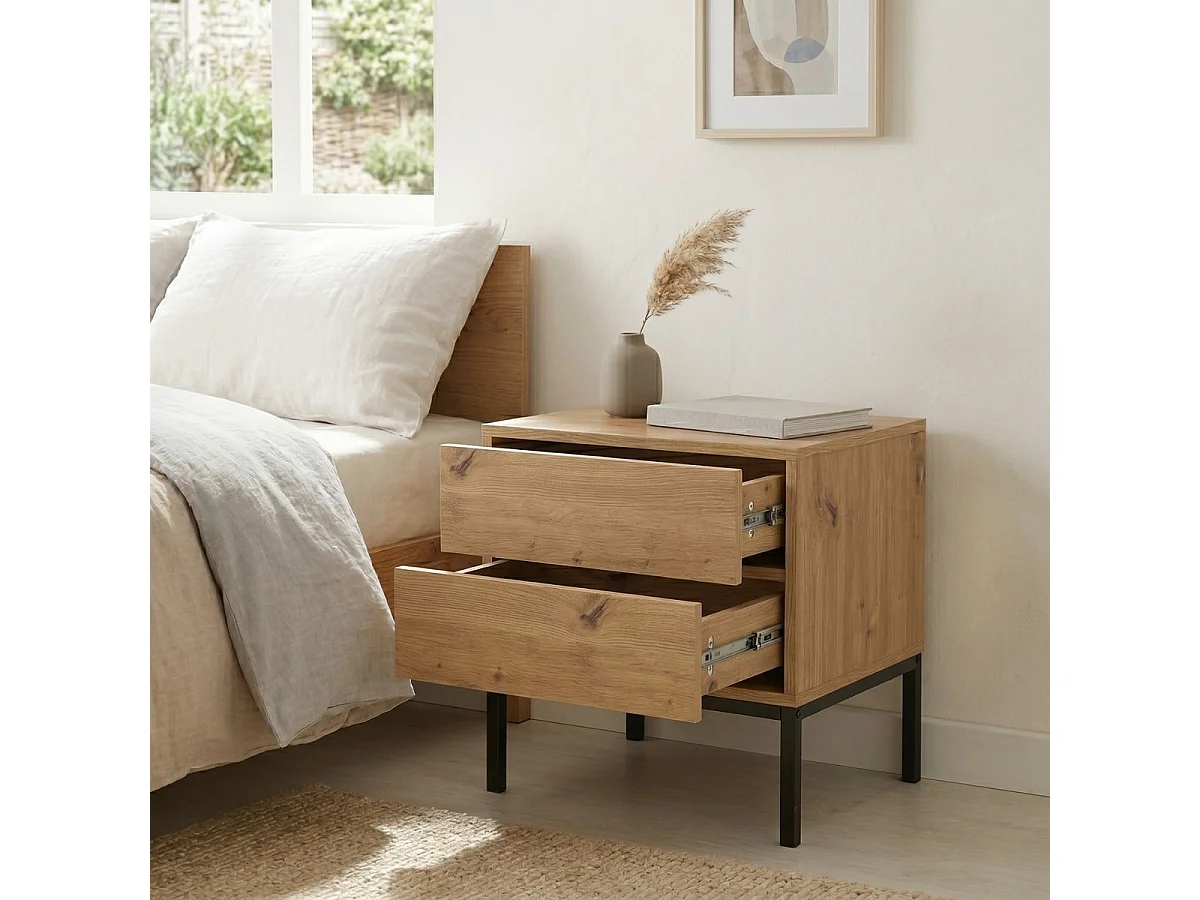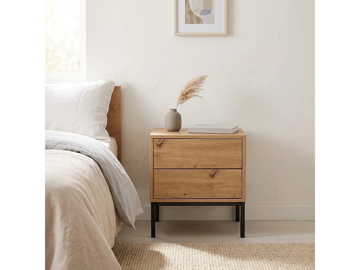 Mesita de noche con 2 cajones, acabado en roble, altura 50 cm - LENNY