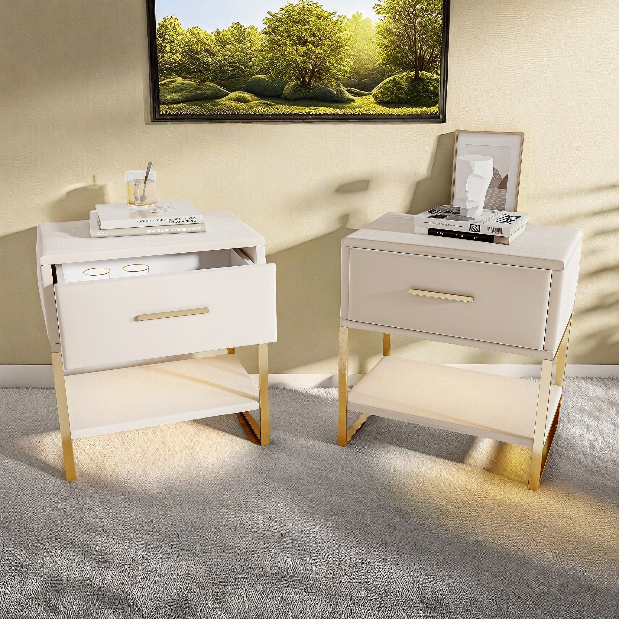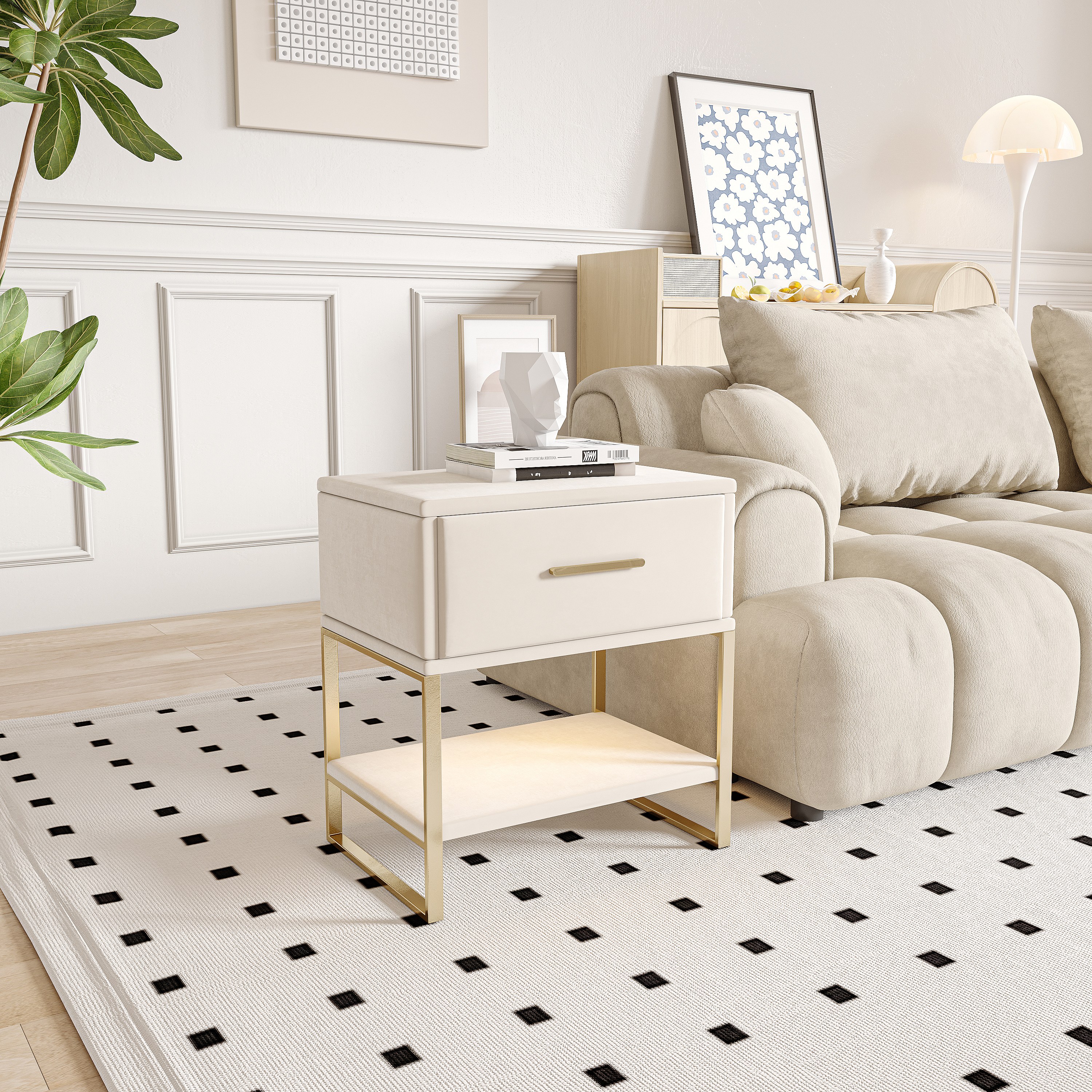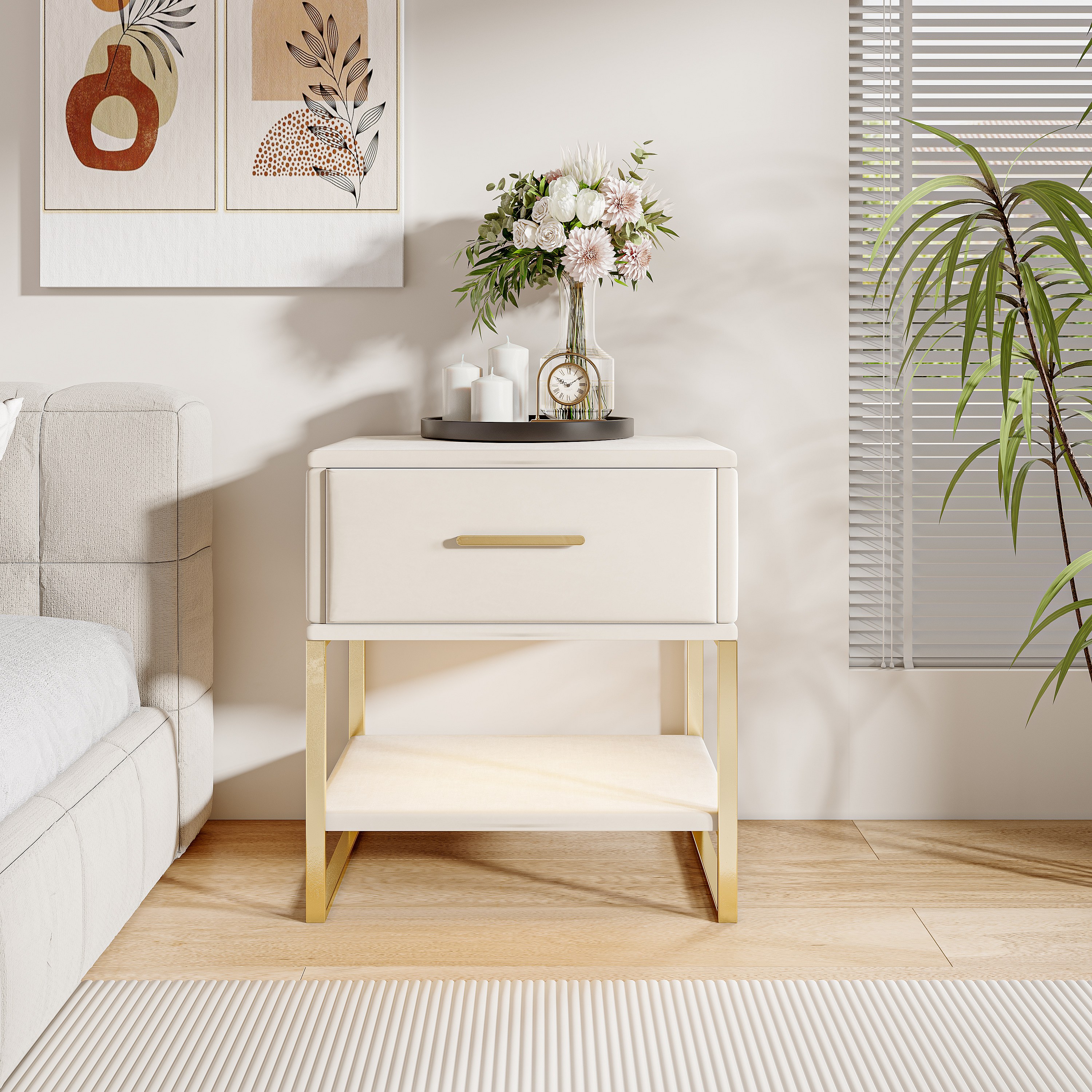 Moderna mesita de noche beige con dos cajones y patas de metal dorado, tapizada en terciopelo.