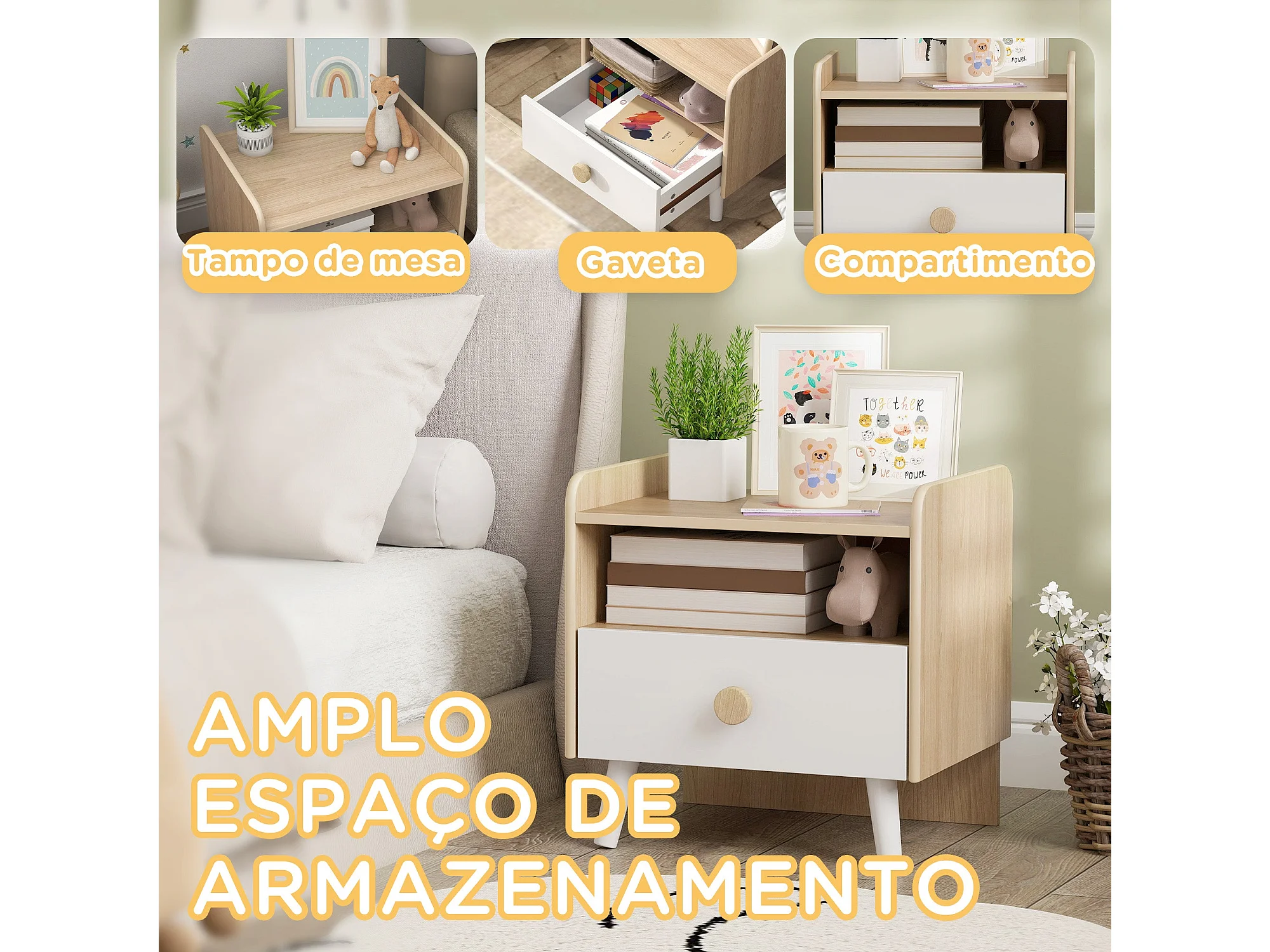 Mesita de noche infantil Drácena Aiyaplay 1 compartimento + cajón +3A blanco/natural 40x40x32,5 cm