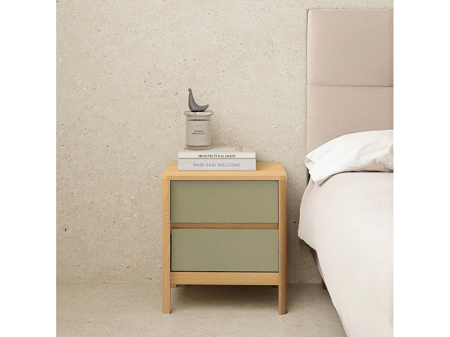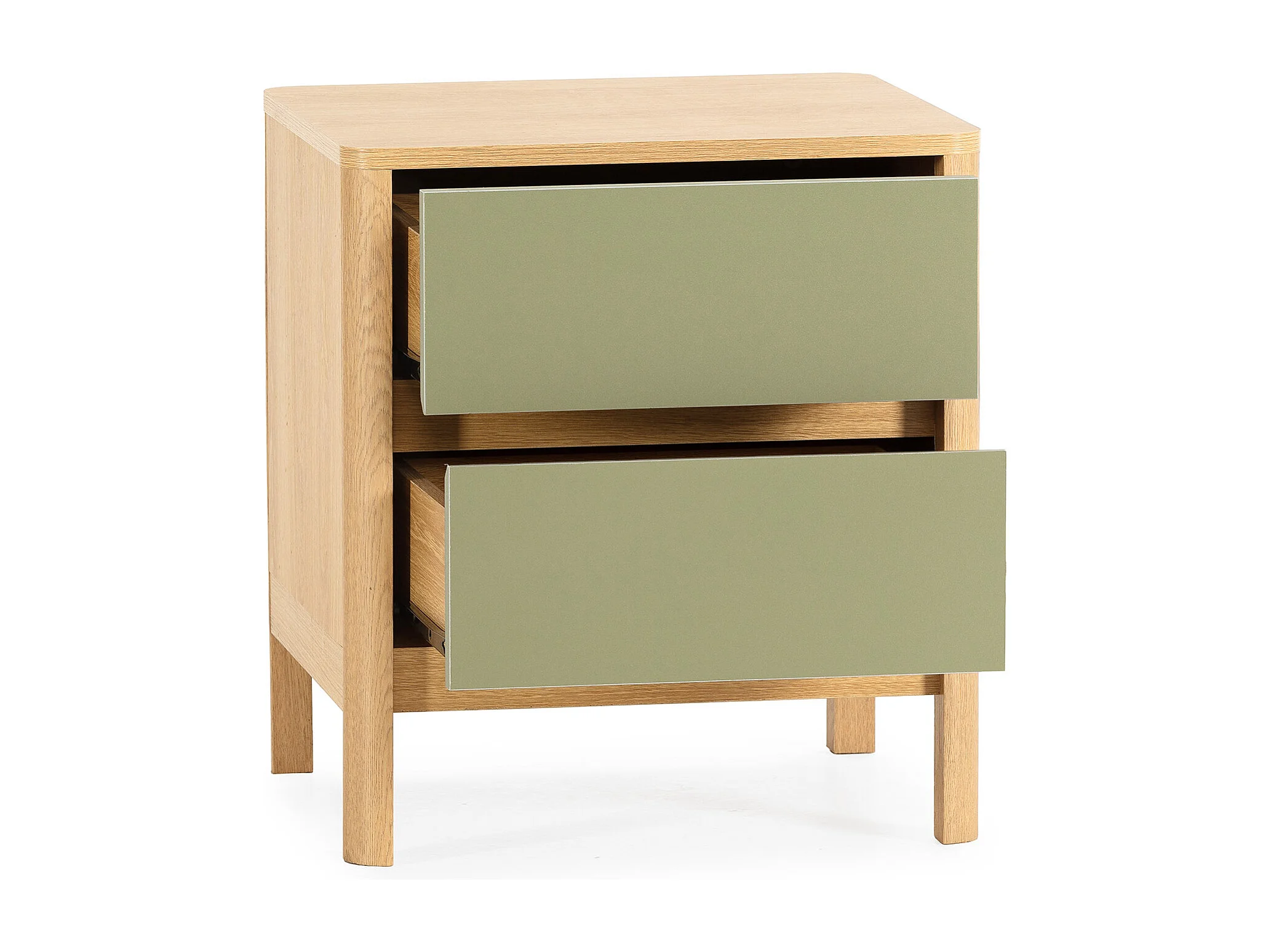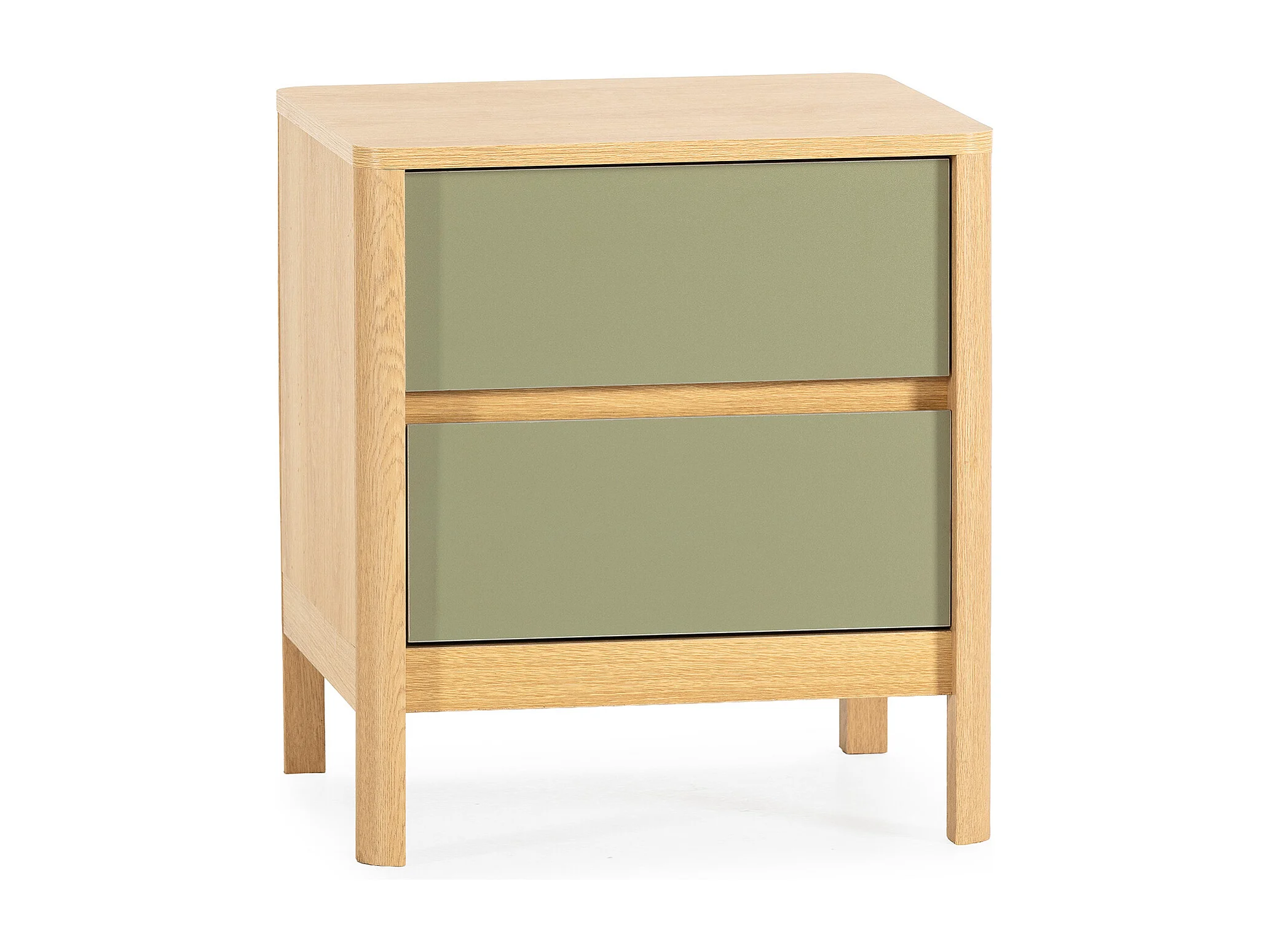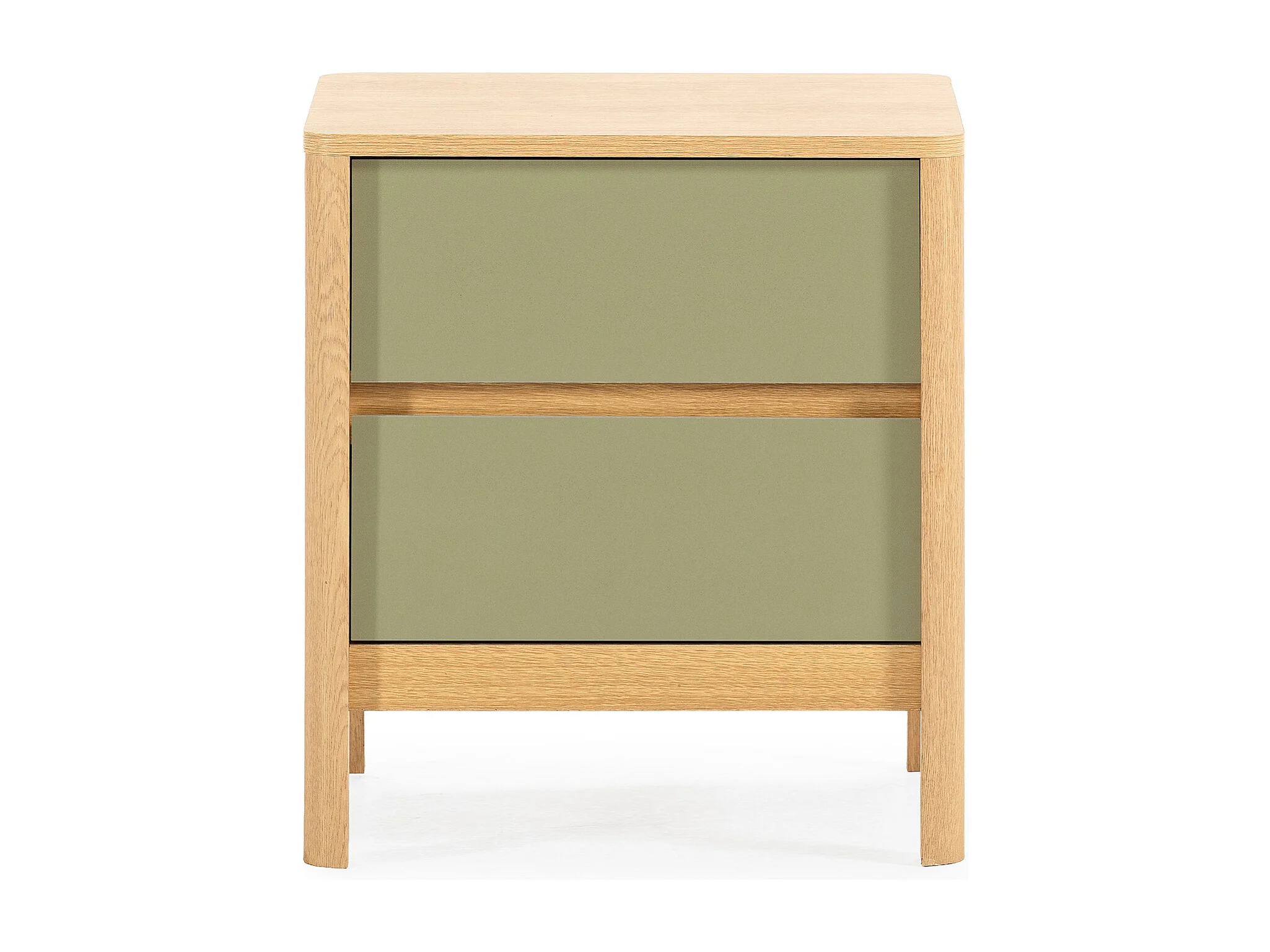 Mesita de noche para dormitorio Estela 2 cajones acabado verde kaki/cera blanca, 40cm(anch