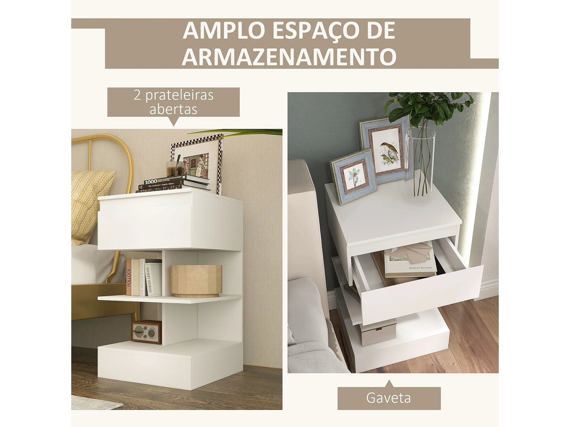 Mesita de noche Onís Homcom 1 cajón + 2 estantes blanco 65x39x39 cm