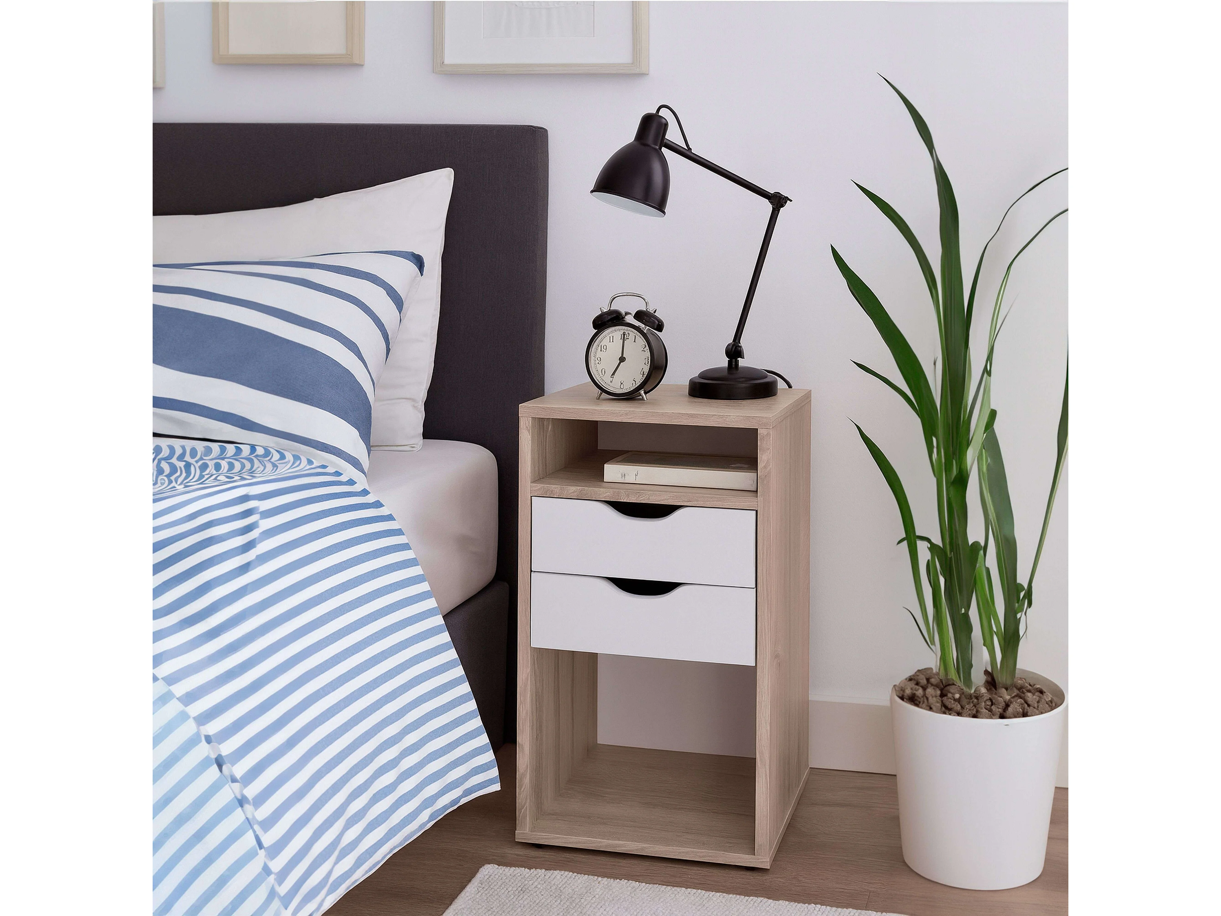 Mesita de noche Parc 2 cajones y huecos en roble Sonoma y blanco 36x71 cm