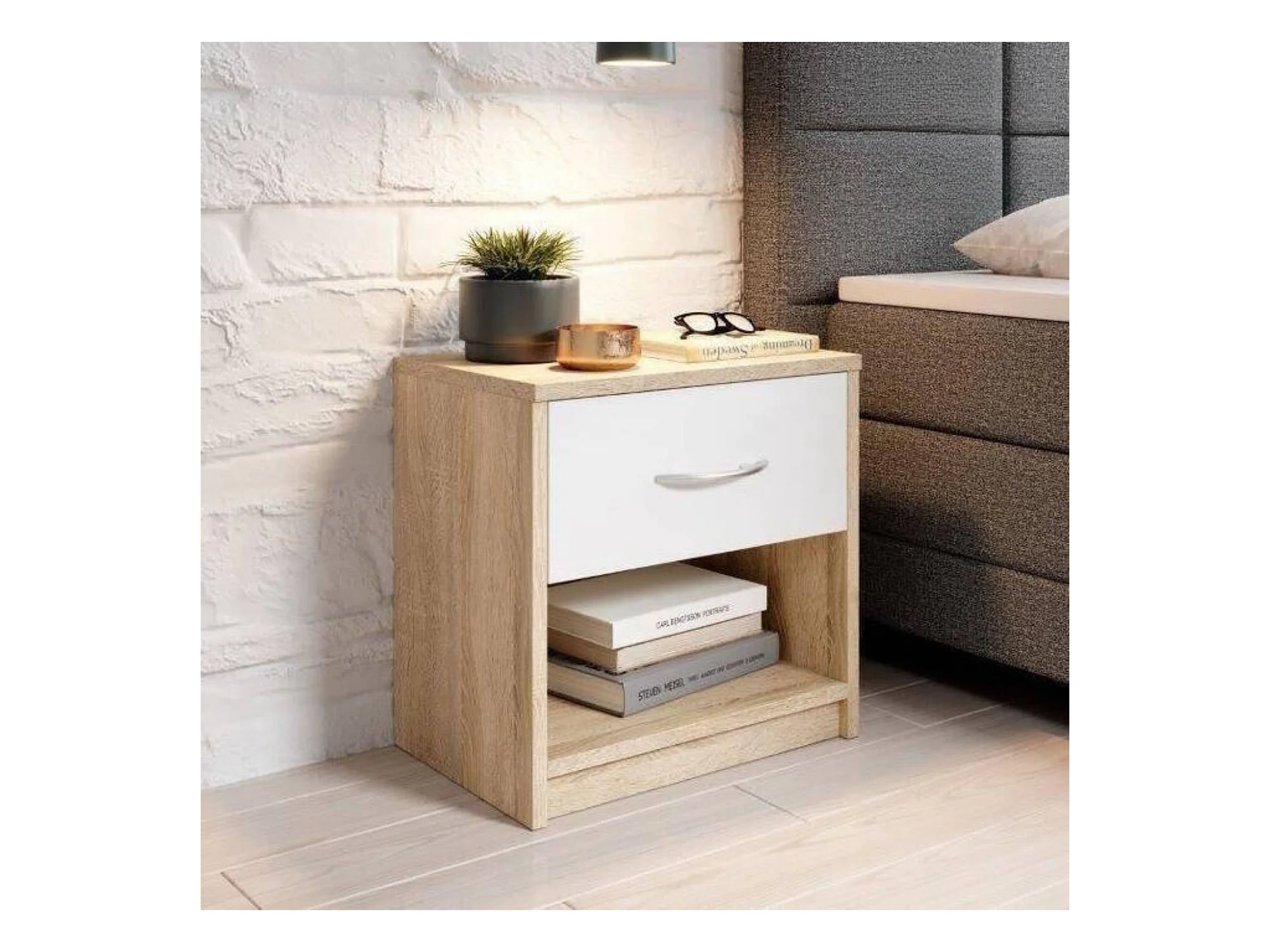 Mesita de noche sencilla con un cajón adecuada para cualquier cama y dormitorio, Color Blanco y Roble, 38,5 x 28 x 39,5 cm (ancho x fondo x alto)