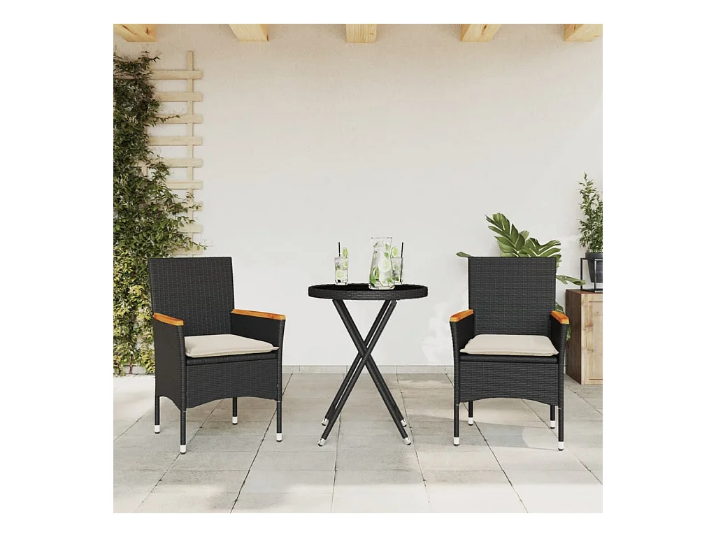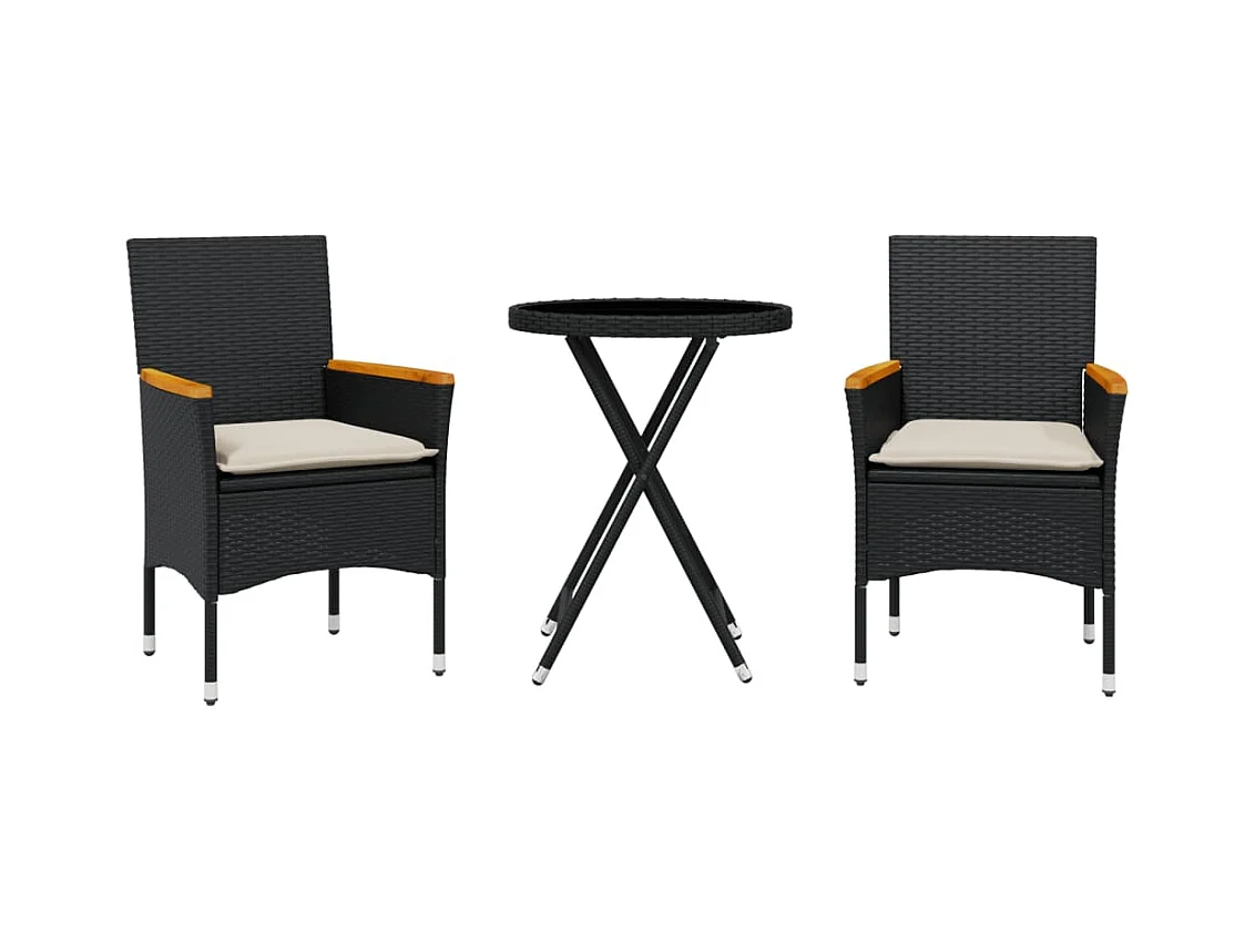 Mesita y sillas con cojines 3 pzas ratán sintético vidrio negro ES697487