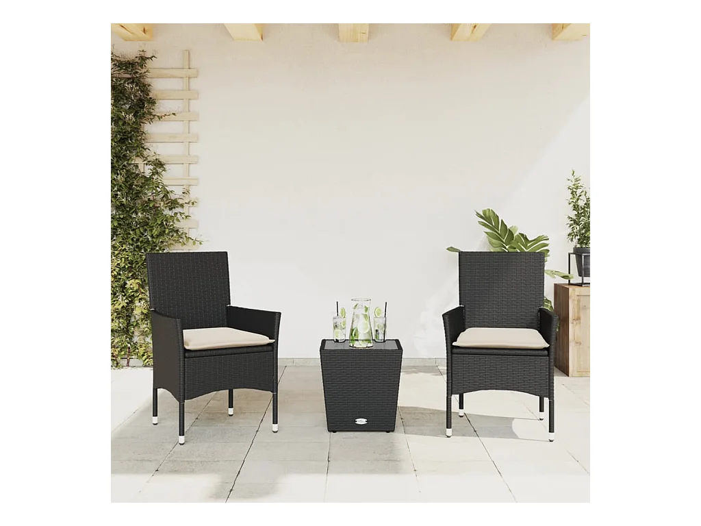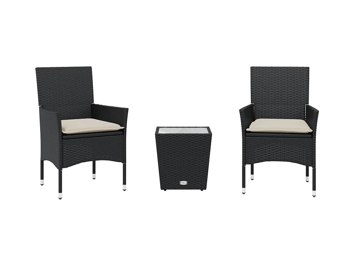 Mesita y sillas con cojines 3 pzas ratán sintético vidrio negro ES374933