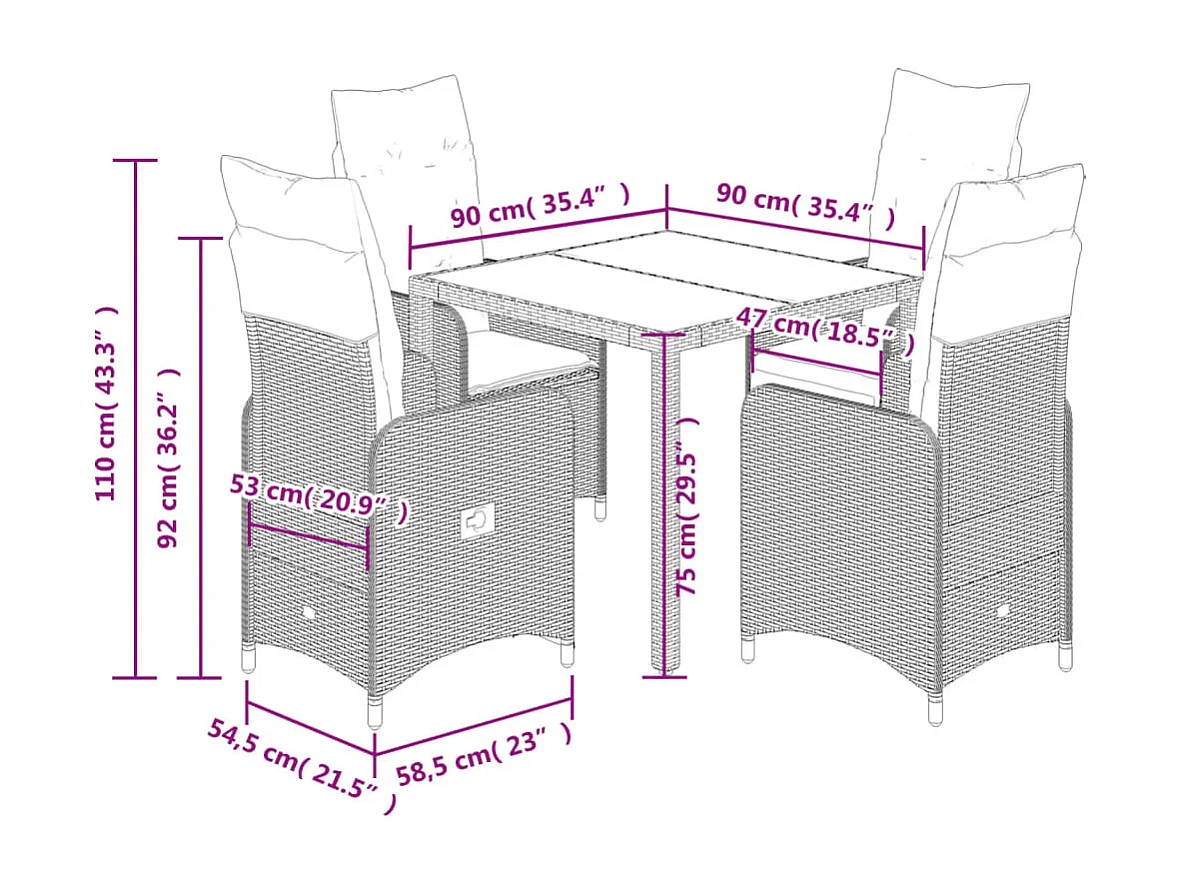 Set de mesa y sillas de jardín 9 pzas y cojines ratán PE negro