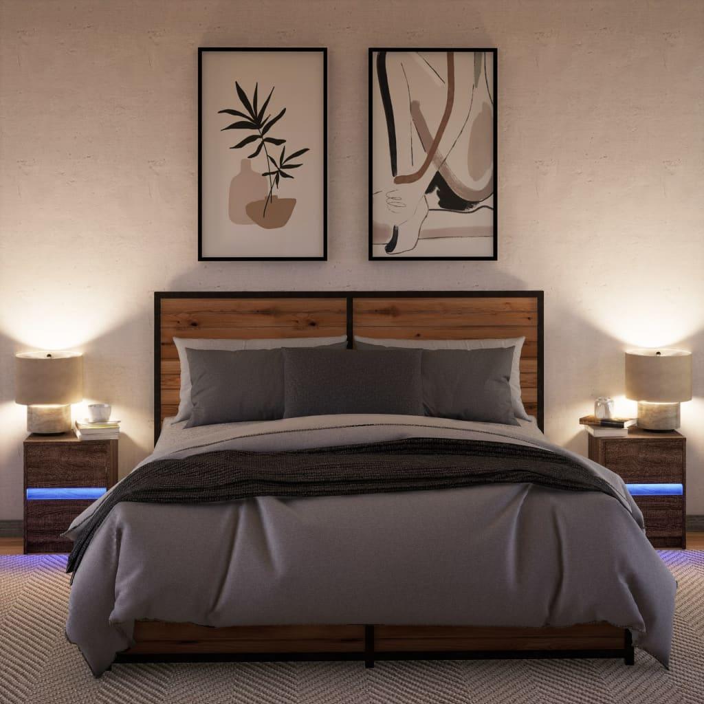 Mesita de noche con luces LED madera ingeniería roble ahumado