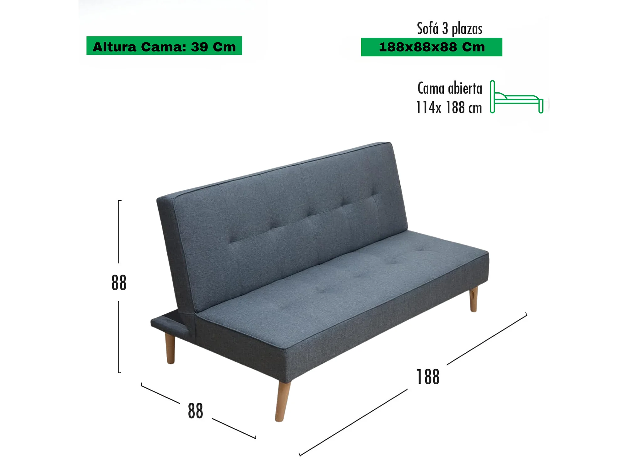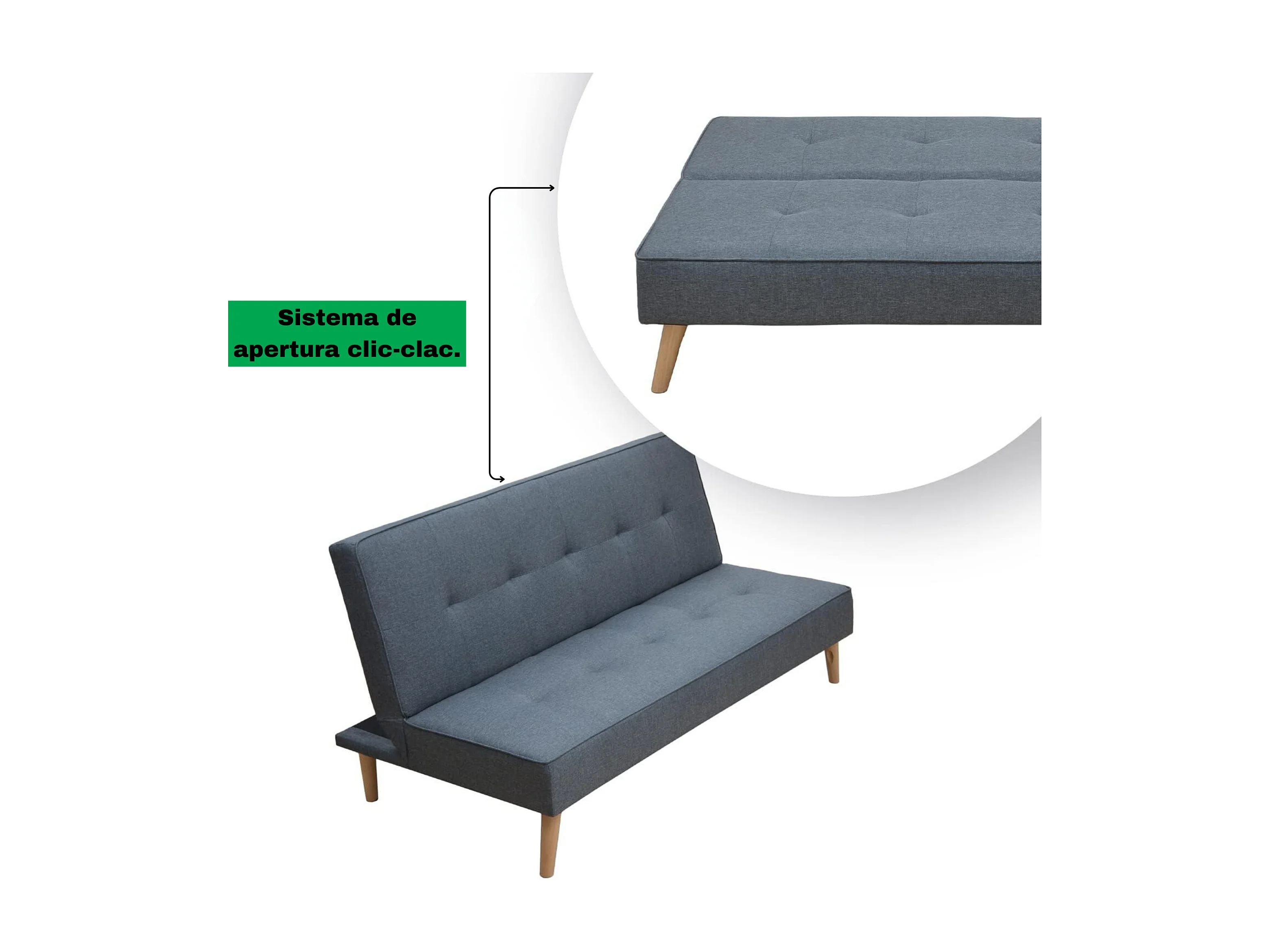 Meyvaser Sofá Cama de 2 Plazas - 188 x 88 x 88 cm - Apertura Clic-Clac - Máximo Relax, Confort y Resistencia Color gris-Azul