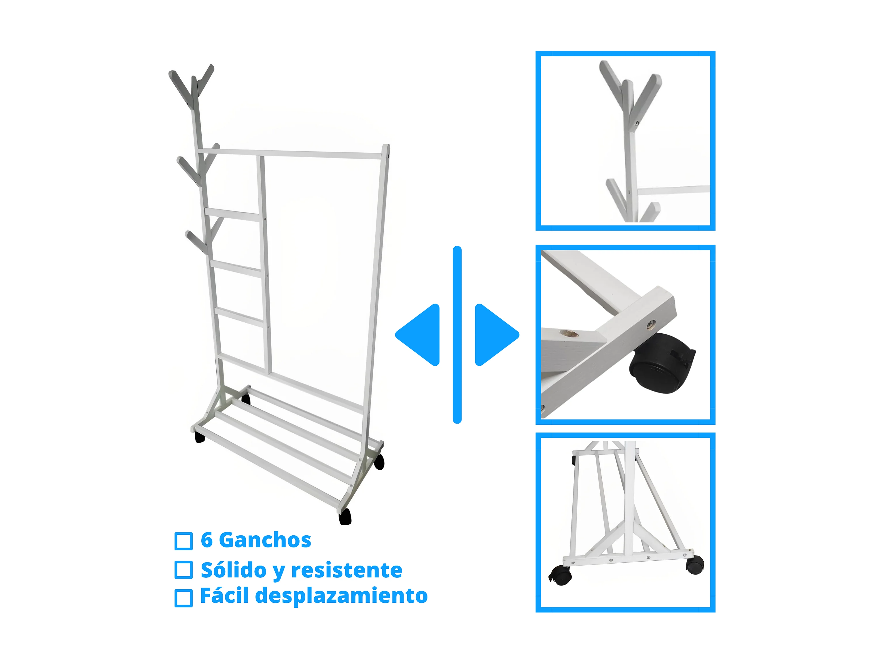 Meyvaser - Vestidor portatil, Perchero portátil con ruedas de 180x100x35 Cm y 6 Ganchos en madera color blanco.