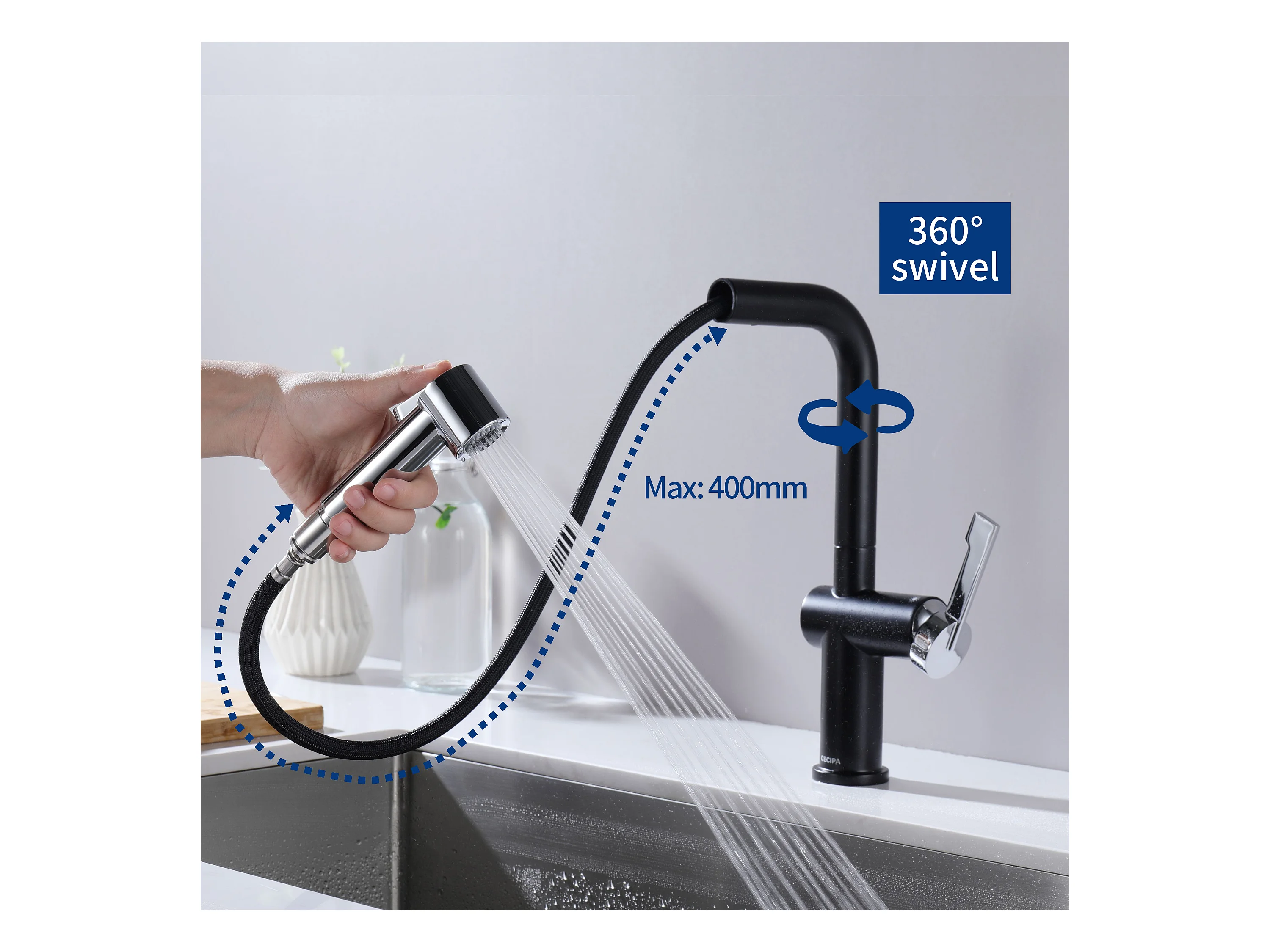 Mezclador de Cocina con Ducha Extraíble Cecipa max - Grifo Giratorio 360° de Acero Inoxidable Grifo con Ducha Extraíble Grifo de Ducha Extraíble, Modelo UE