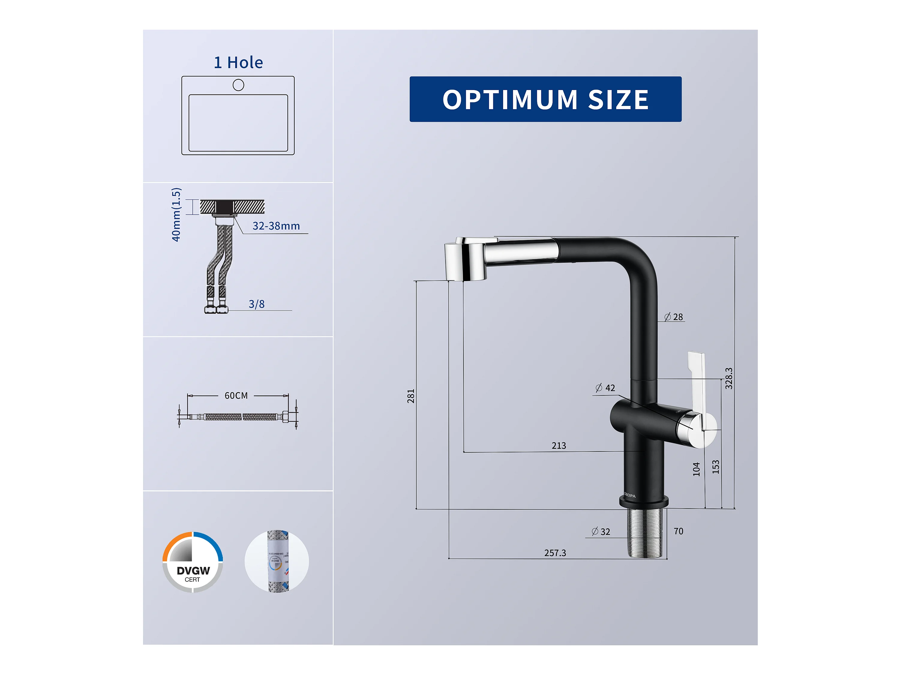 Fregadero de 1 cubeta de cuarzo y resina, 3 opciones de montaje, 40*44*20cm + Mezclador de cocina plegable negro