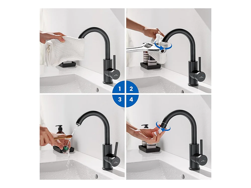 Mezclador De Lavabo, Grifo De BañoNegro Giratorio 360°, Aireador Desmontable+Conjunto De Baño Accesorio 6 Piezas,Autoadhesivo/perforar,Inox,Negro