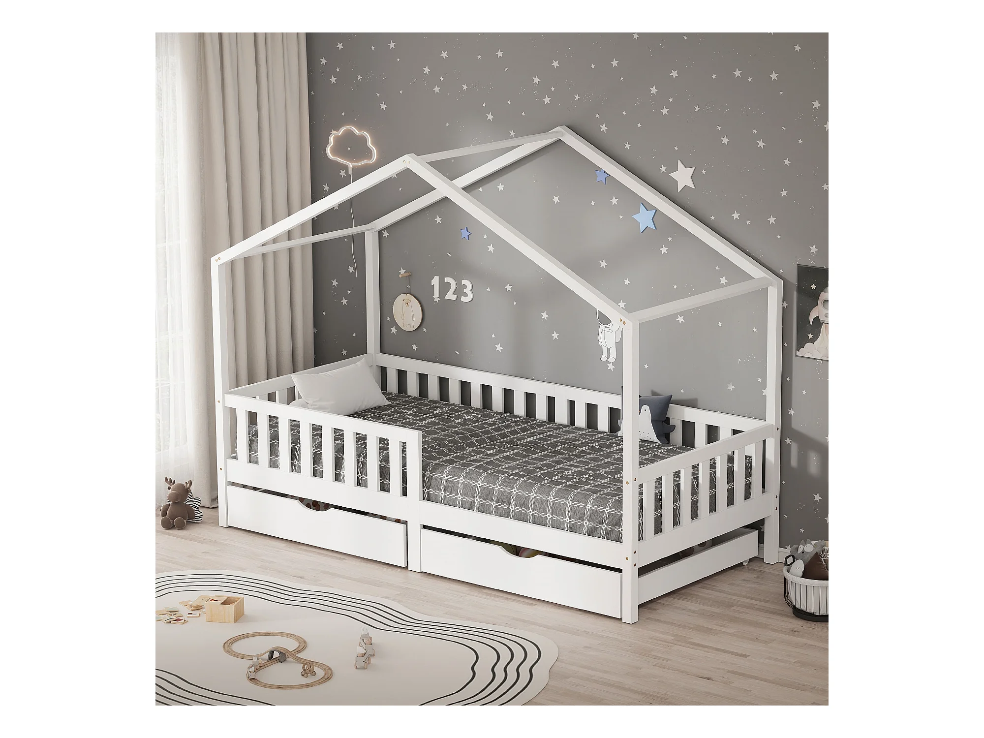 ML-Design Cama infantil forma casa 90x200cm madera blanca maciza de pino litera junior con 2 cajones, somier de láminas, techo y protección anticaída