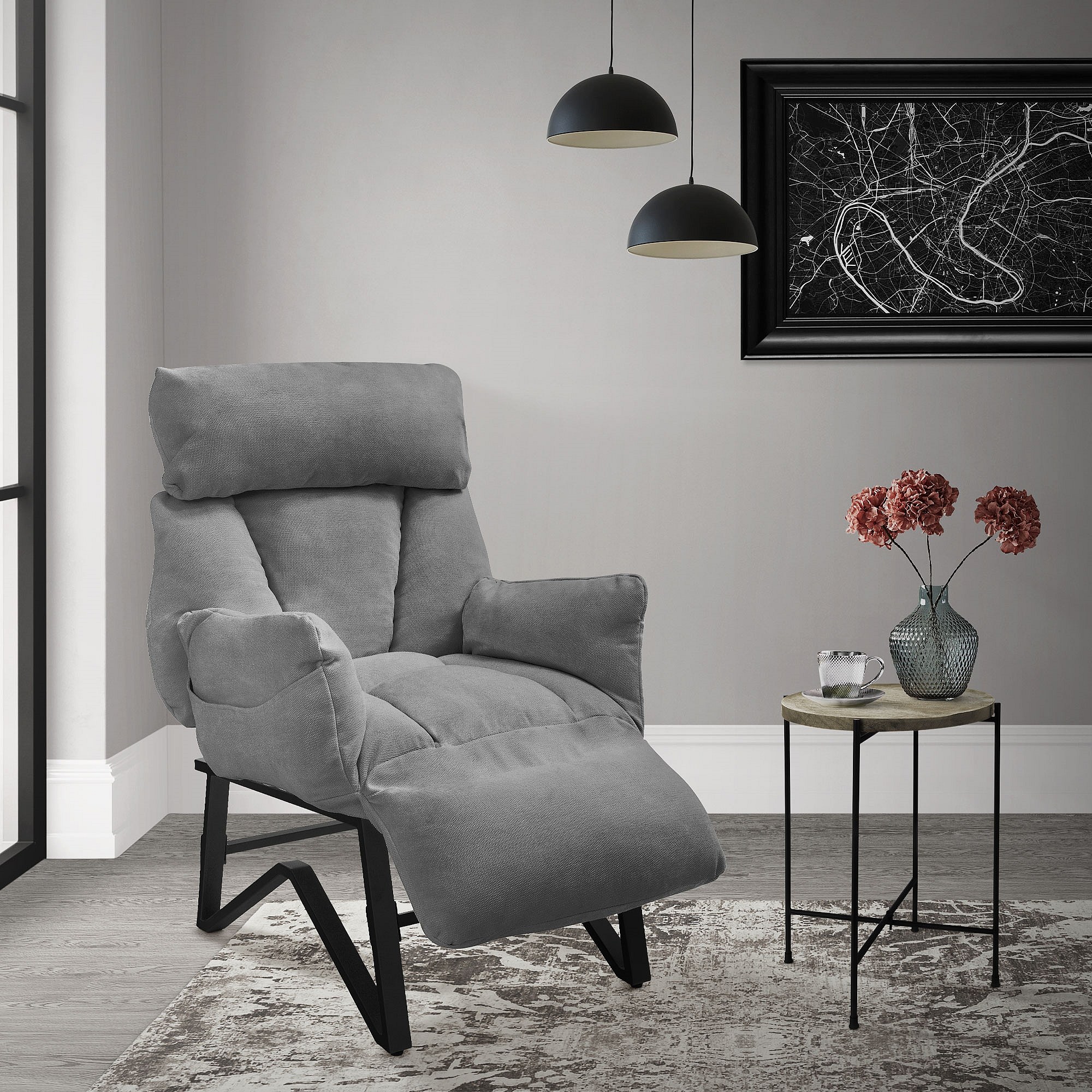 El robusto armazón de acero con recubrimiento de polvo garantiza la estabilidad, mientras que los protectores de fieltro protegen el suelo de arañazos. Con su elegante diseño y alto nivel de confort, este sillón reclinable es el complemento perfecto para su salón, rincón de lectura u oficina en casa.