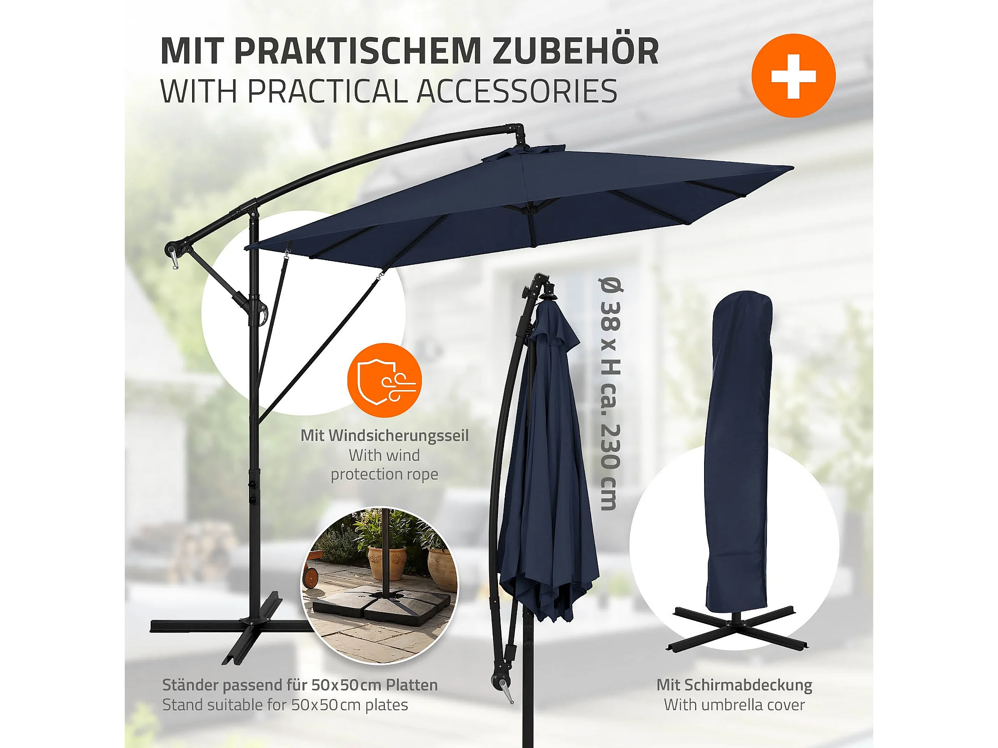 ML-Design Sombrilla de jardín Ø330cm de aluminio azul marino parasol volafiza de terraza con soporte, giratoria 360° e inclinable con manivela