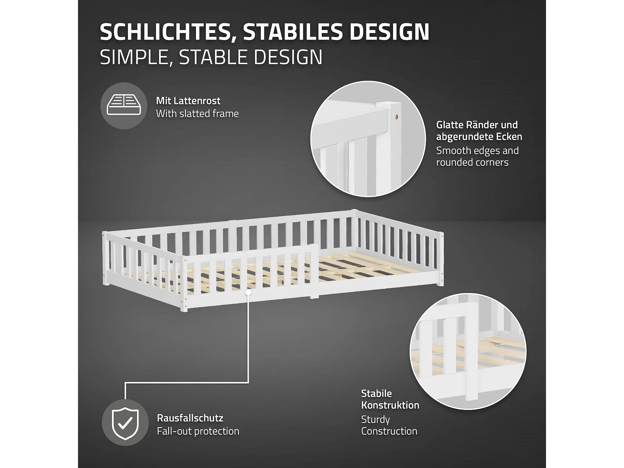ML-Desing Cama de suelo infantil 120x200cm con colchón 16cm blanco madera maciza de pino, somier de láminas cuna anticaída doble para niños