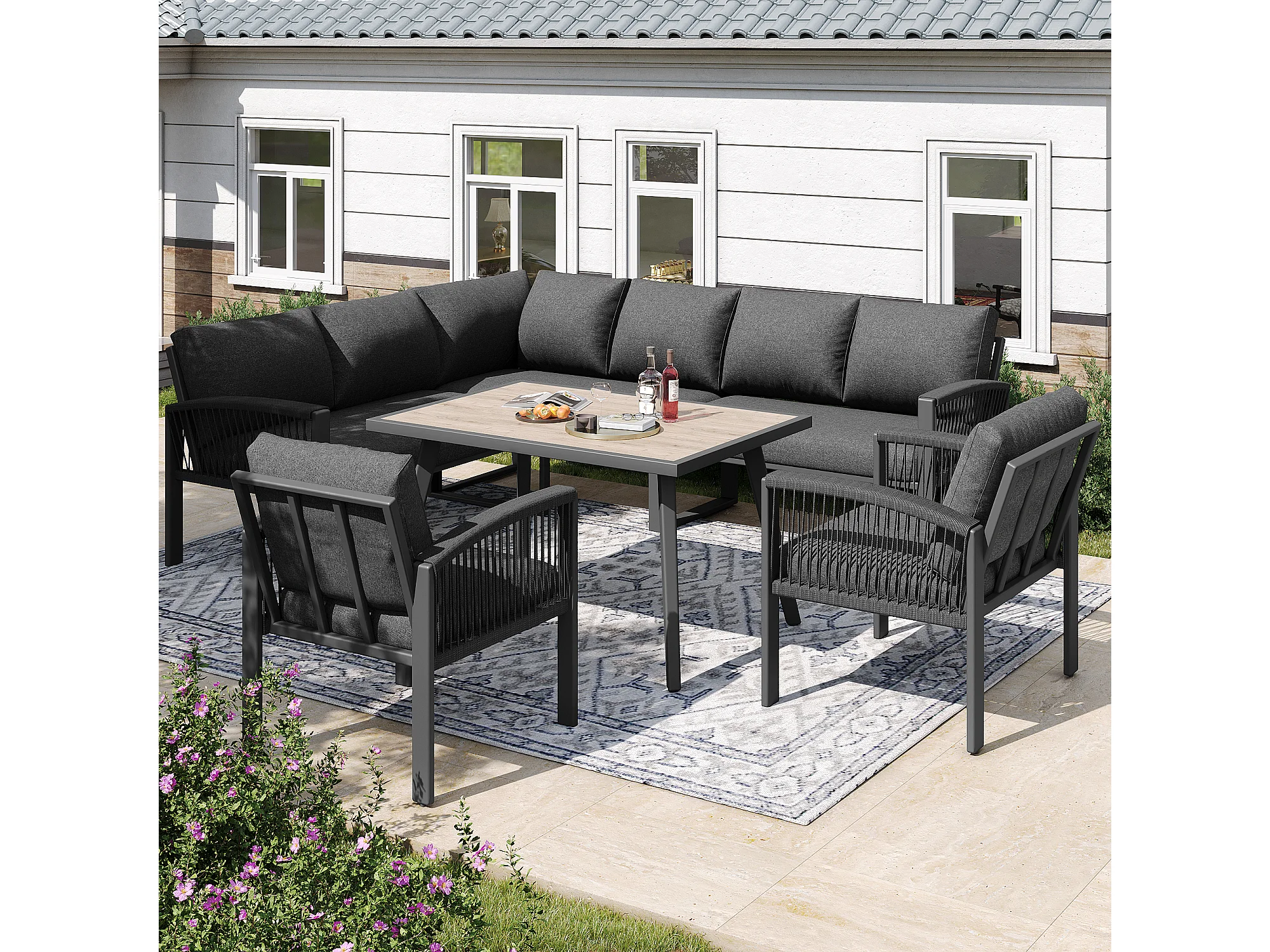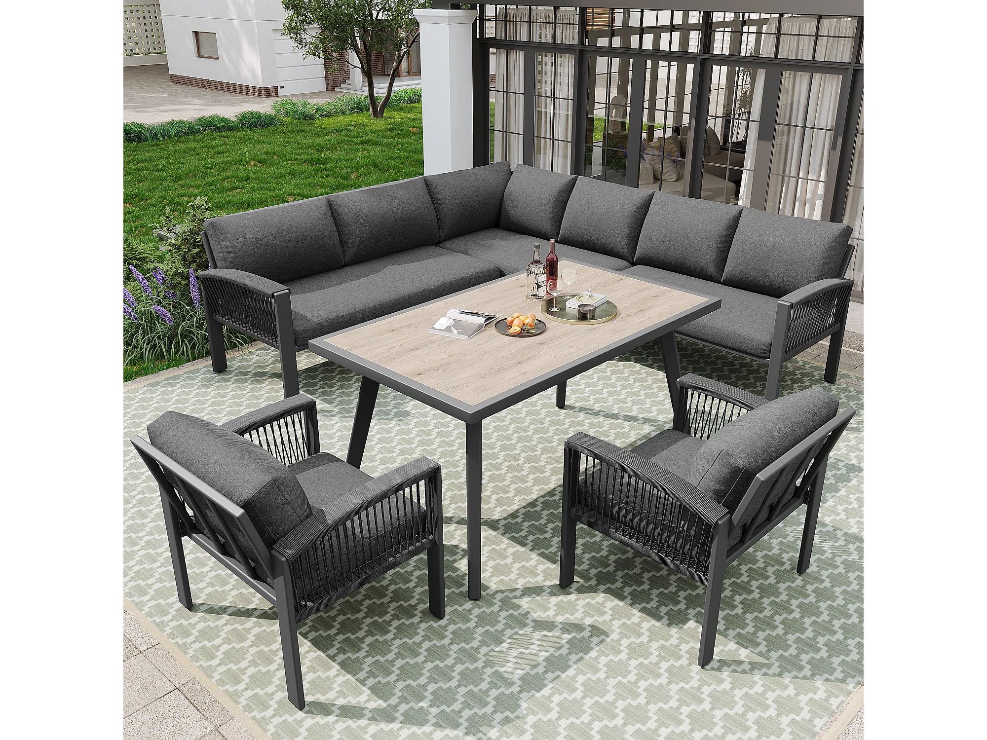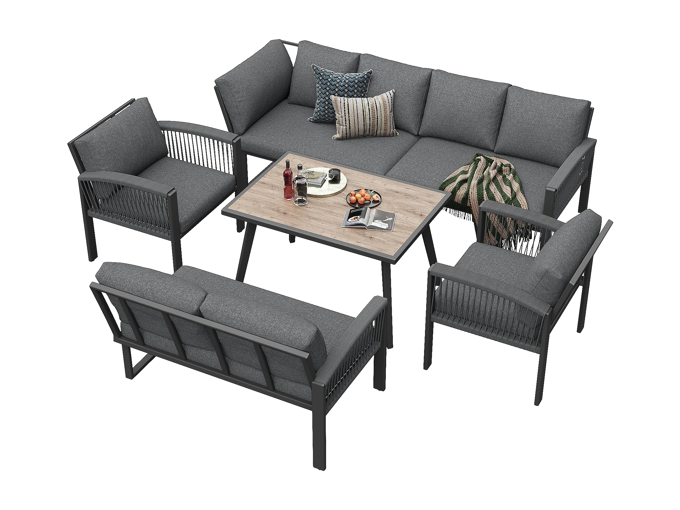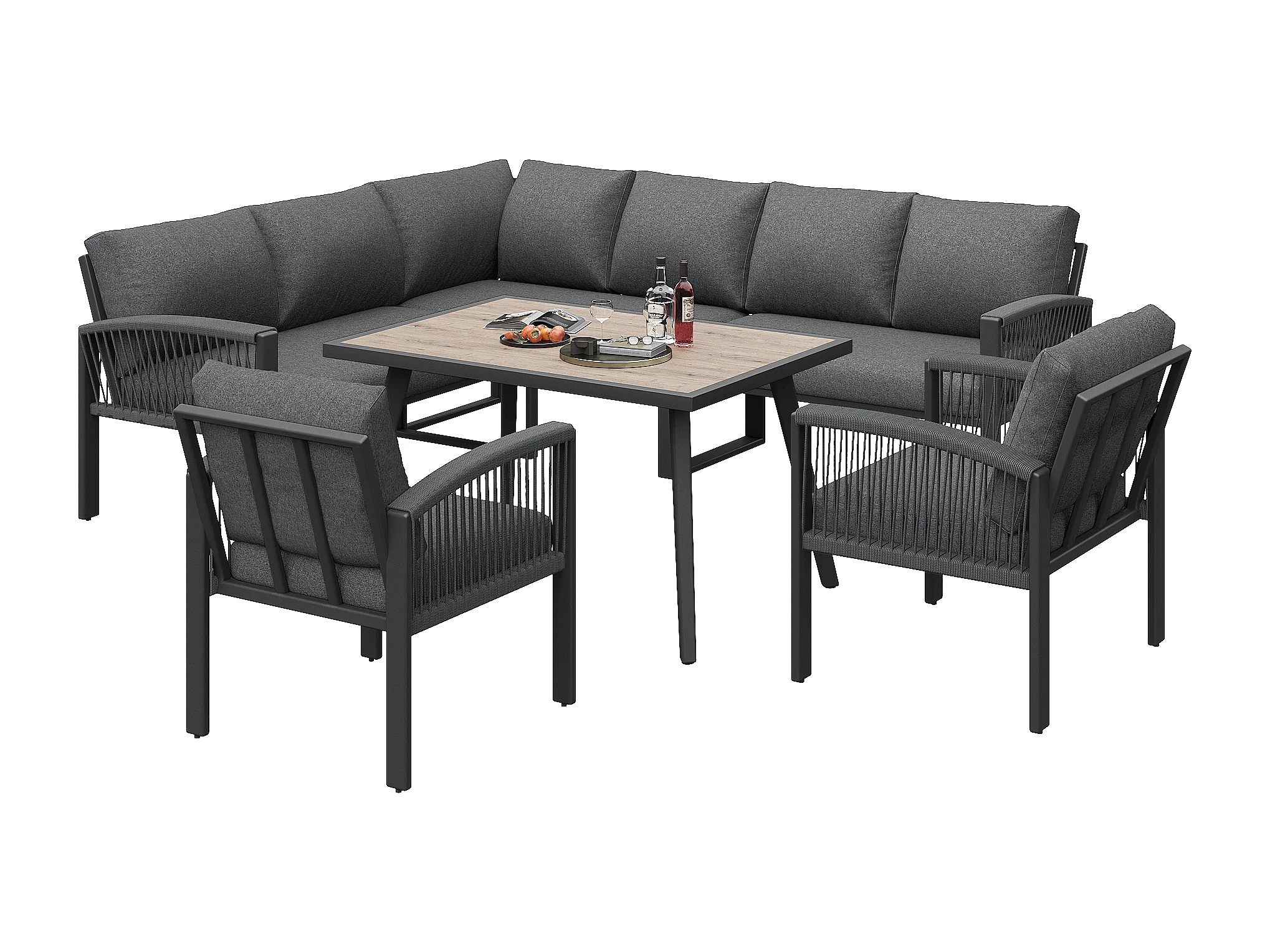 Mobiliario de jardín con acabado en madera, incluye cojines para el asiento y el respaldo, gris