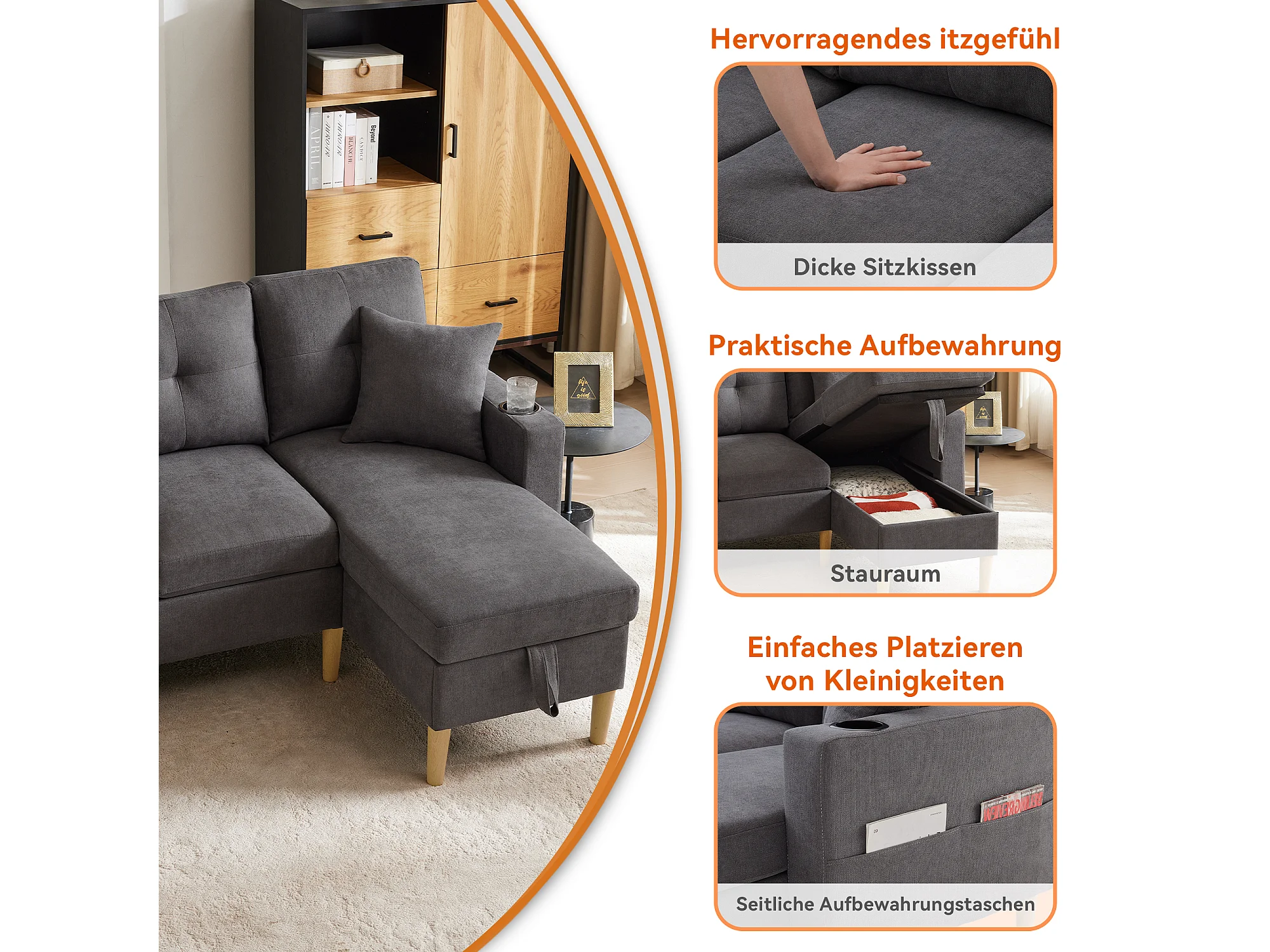 Sofá cama en forma de U, sofá con almacenaje, algodón y lino, gris (270x130x86 cm)