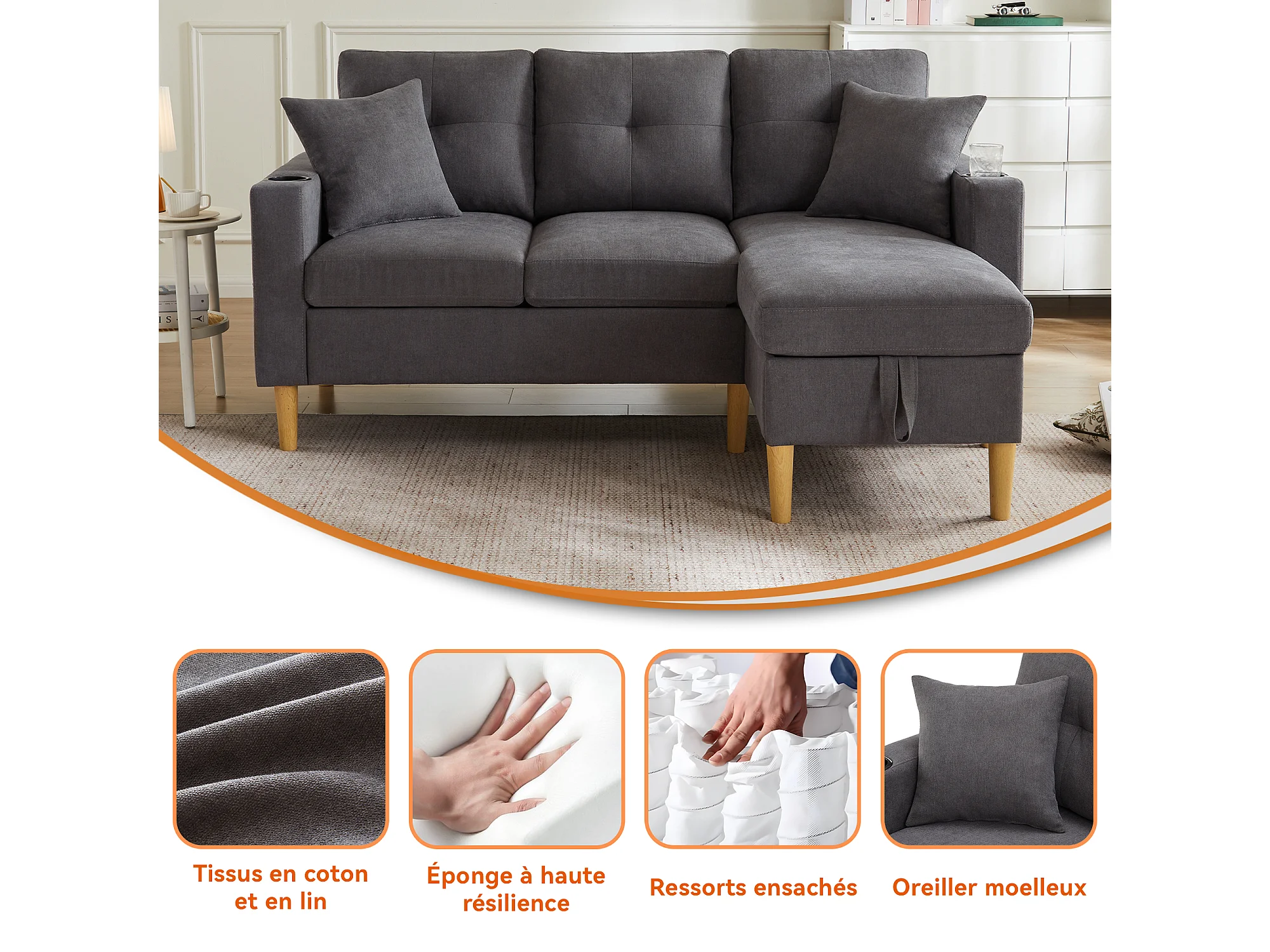 Sofá cama en L, con función cama, en algodón, con portavasos y almacenaje, gris (211x129,5x86 cm)