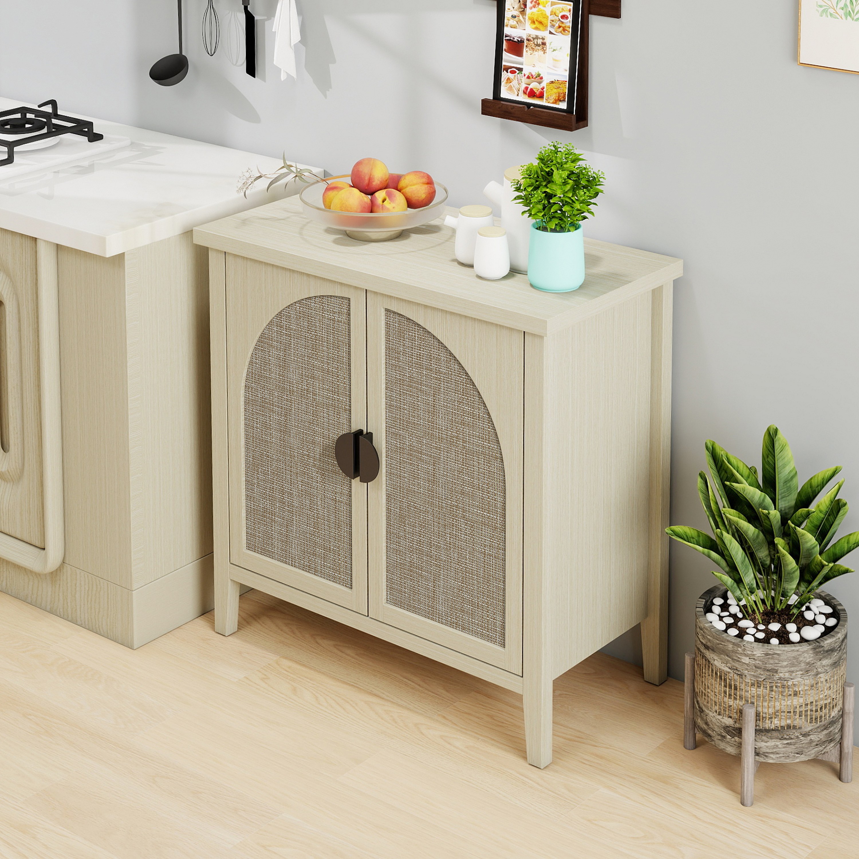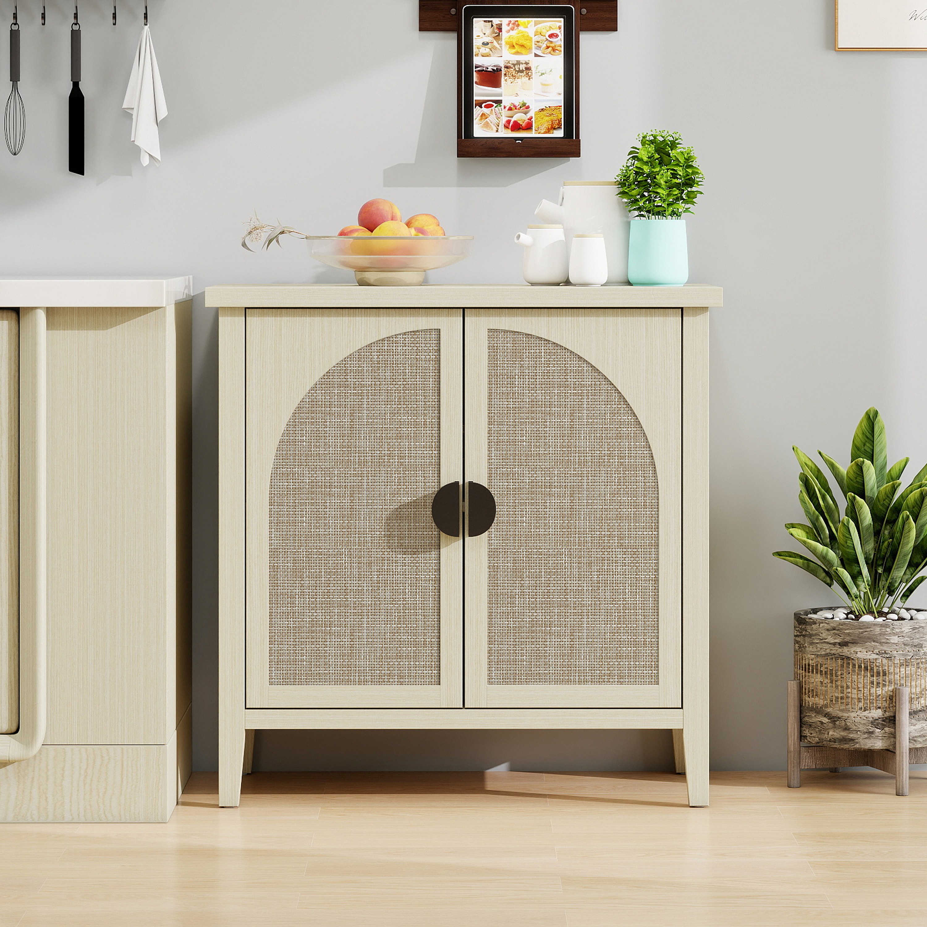 Módulo de almacenaje de dos puertas de ratán natural, moderno aparador o cómoda, ideal para salón, recibidor y cocina.
