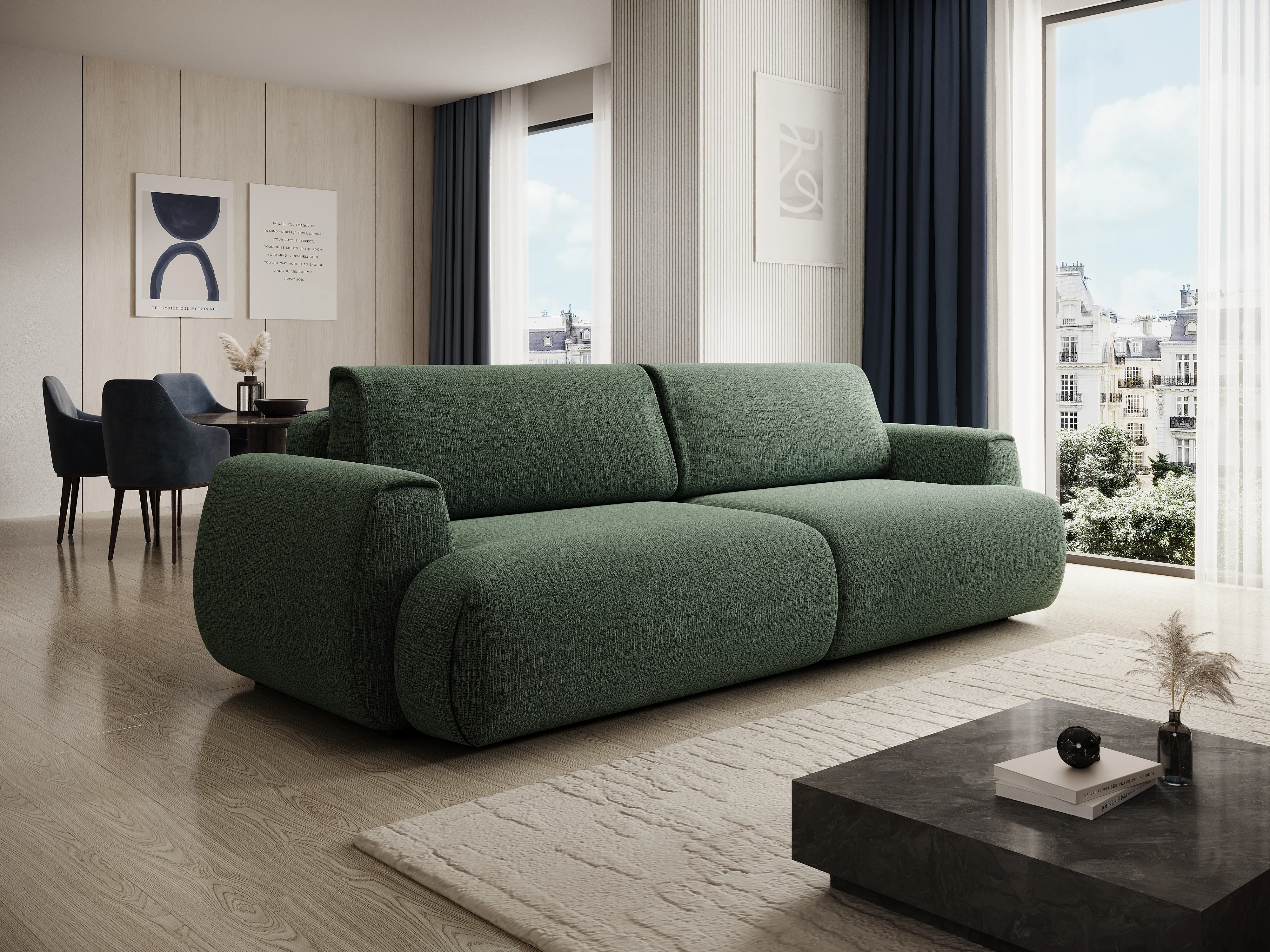 Sofá cama de 4 plazas en chenilla verde abeto MONELIA