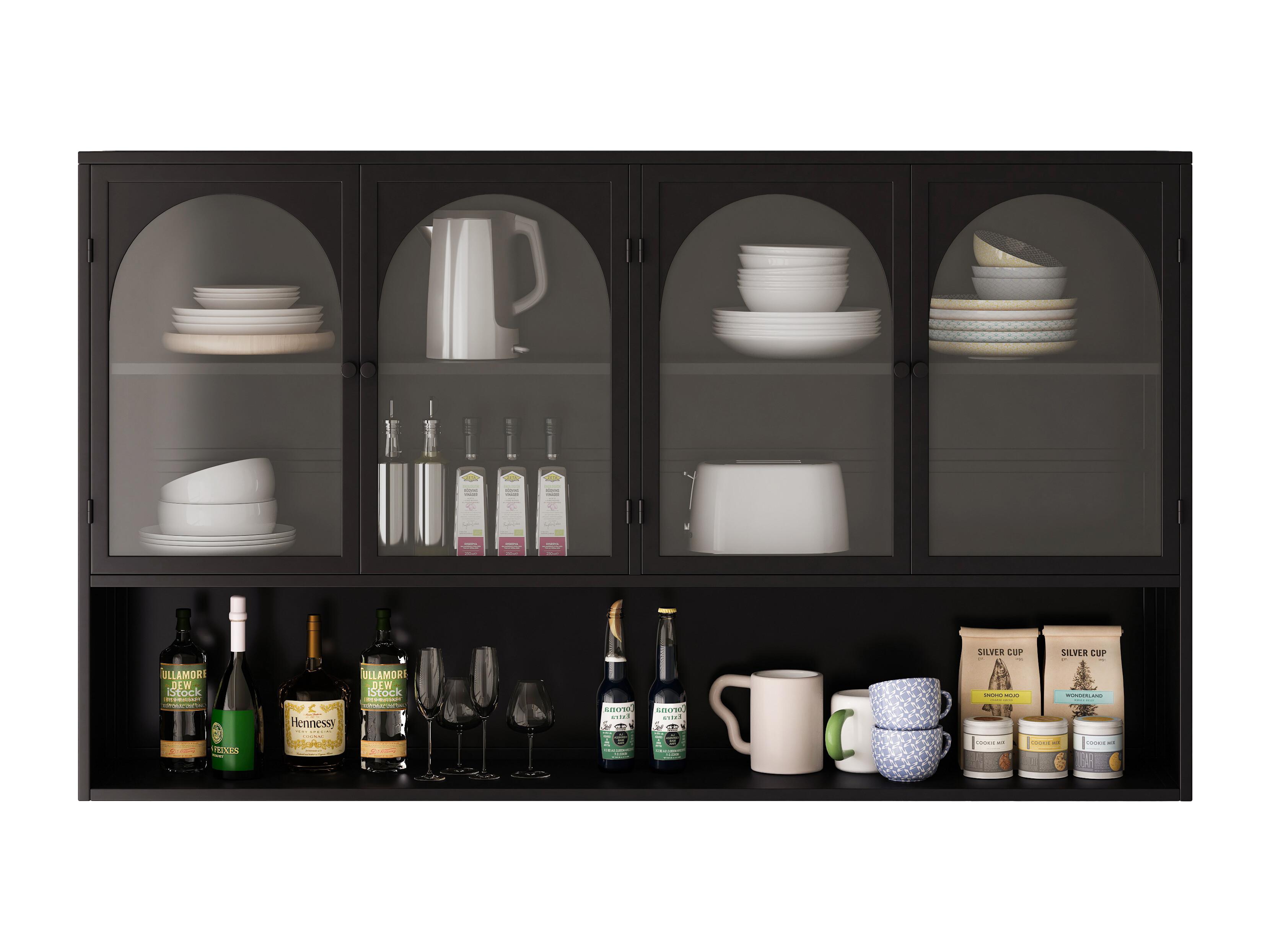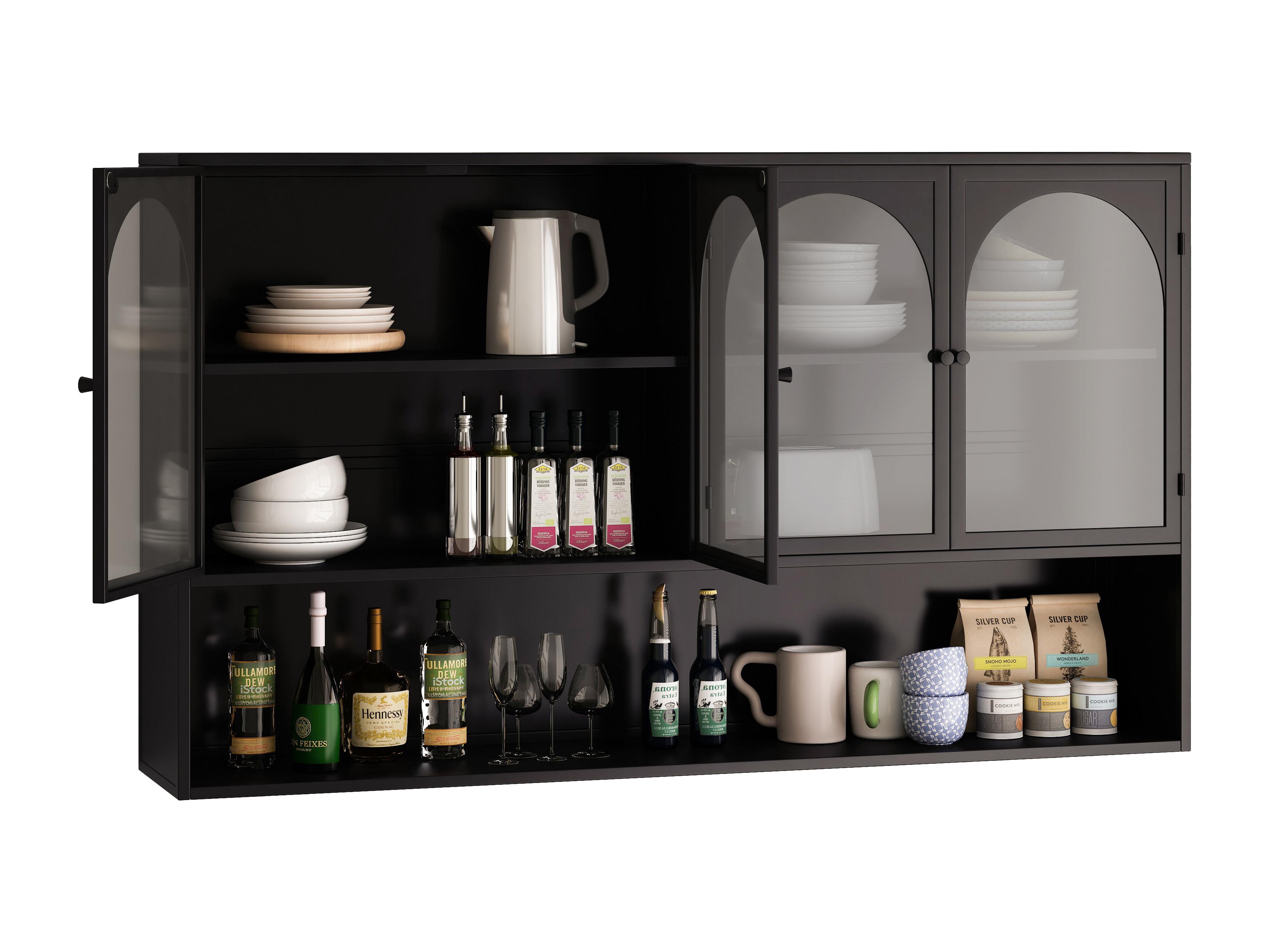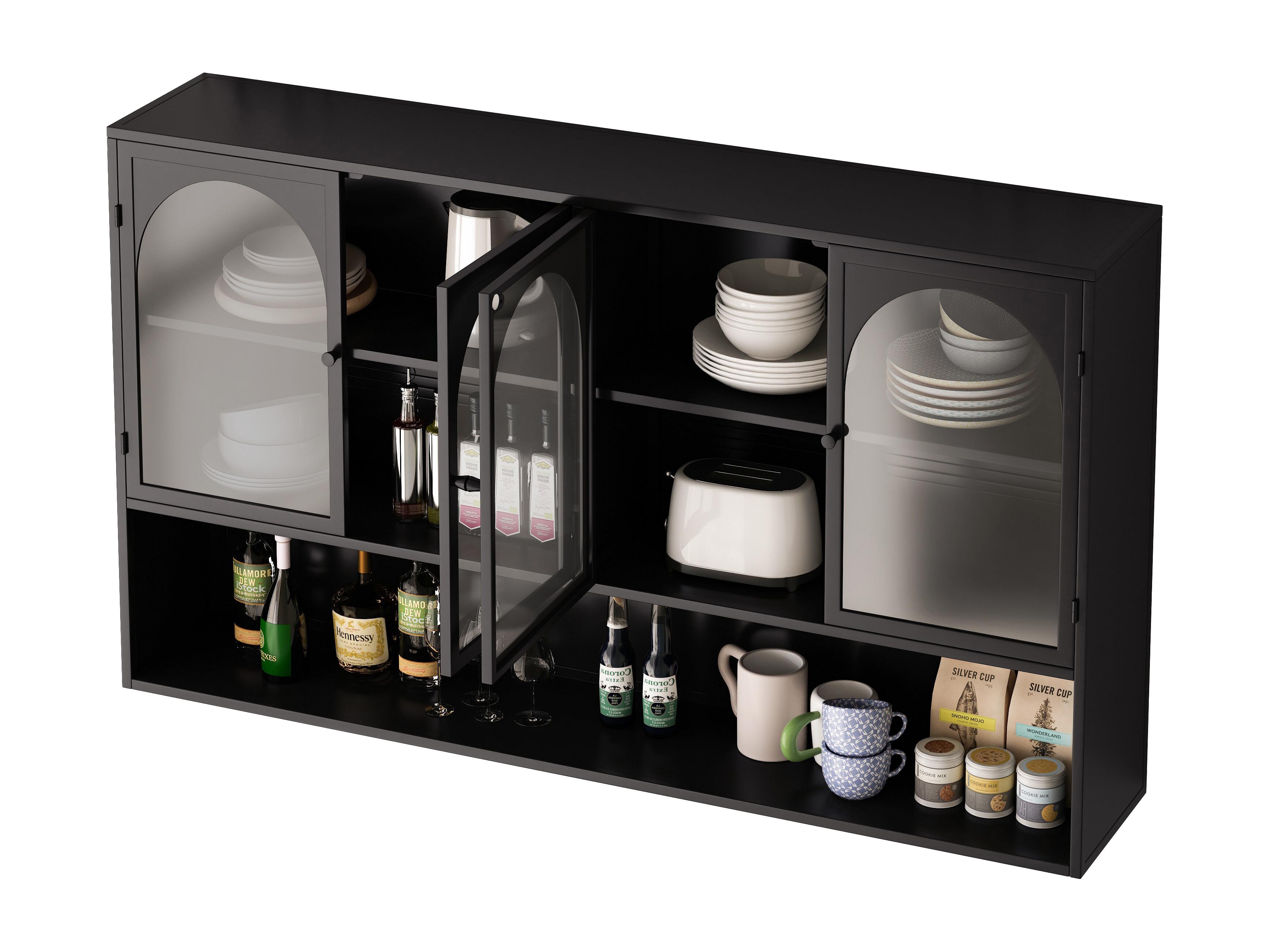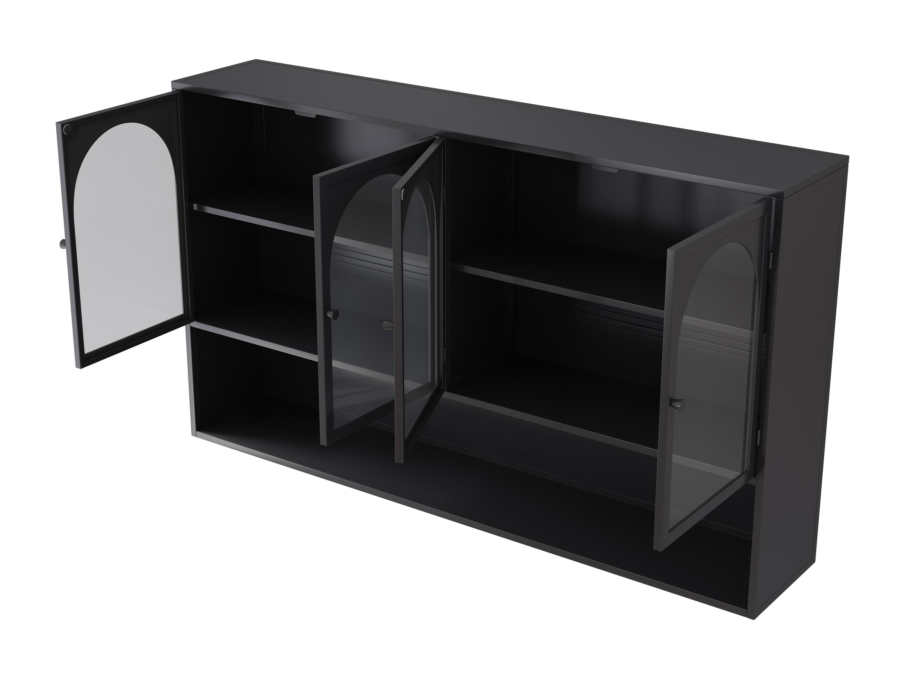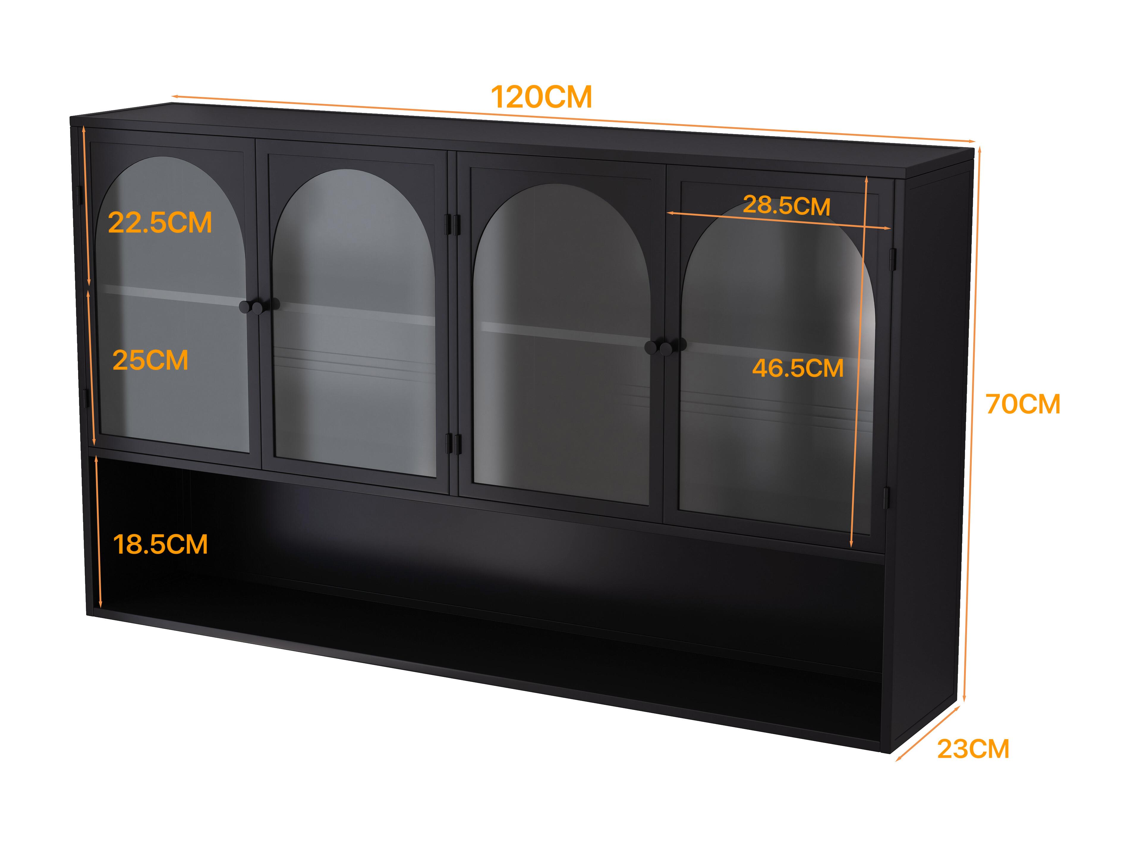 Mueble alto de 4 puertas, cristal templado, metal, almacenaje para cocina, salón, baño, negro, 120 x 23 x 70 cm