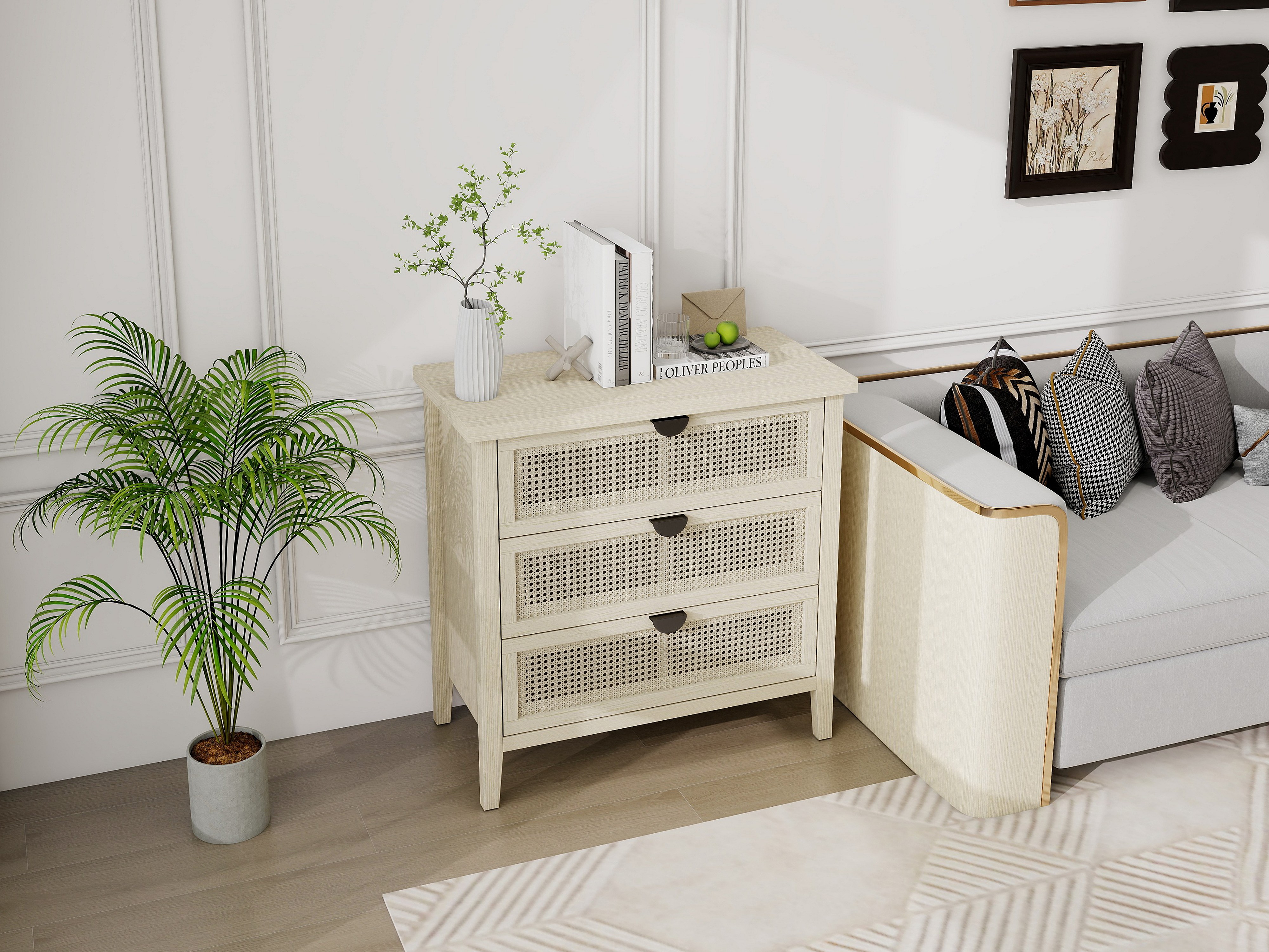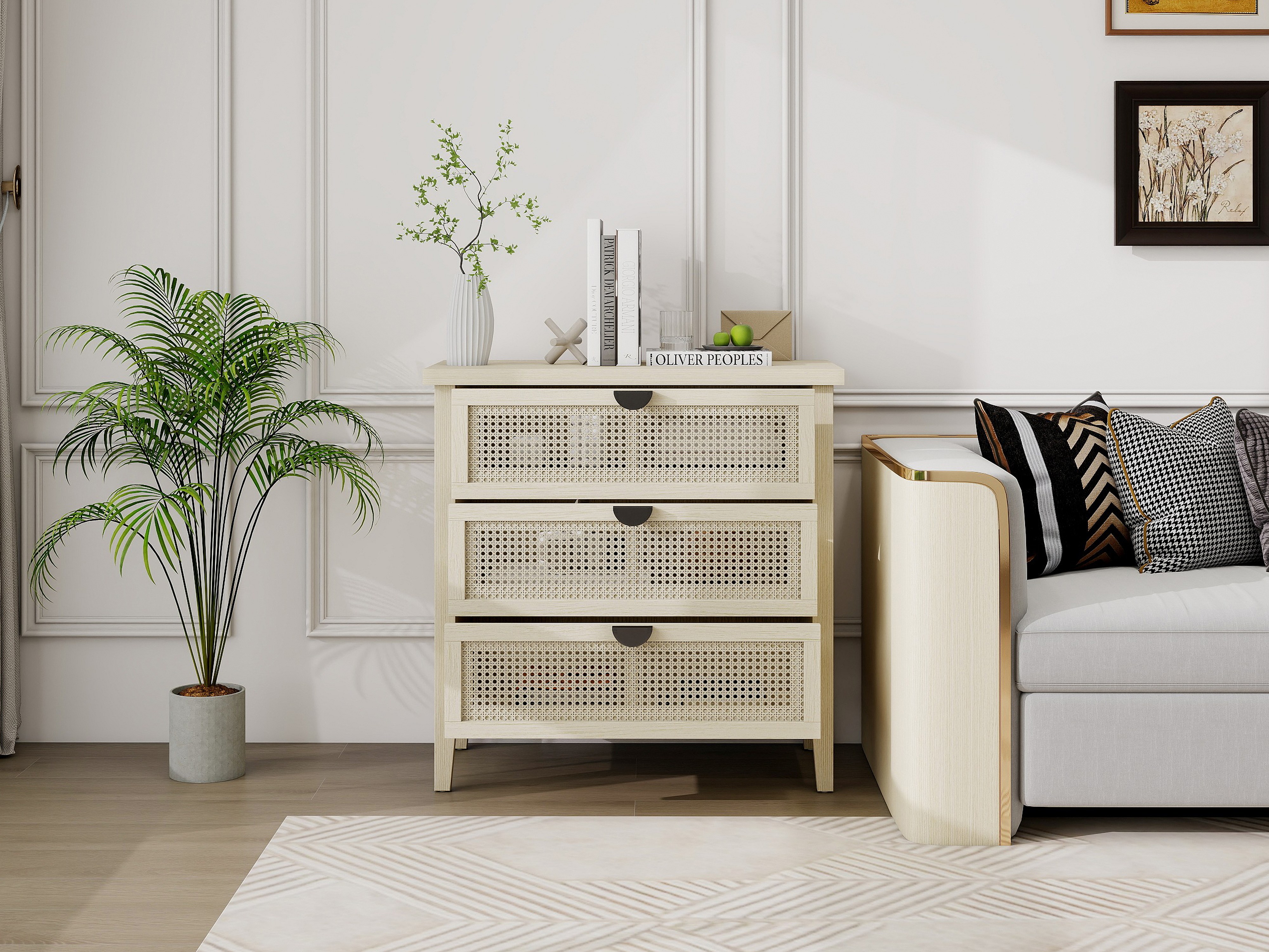 Mueble auxiliar de 80 cm de largo, madera natural, 3 cajones con frentes intercambiables de ratán alveolado. Ideal para salón, oficina o espacio de trabajo.