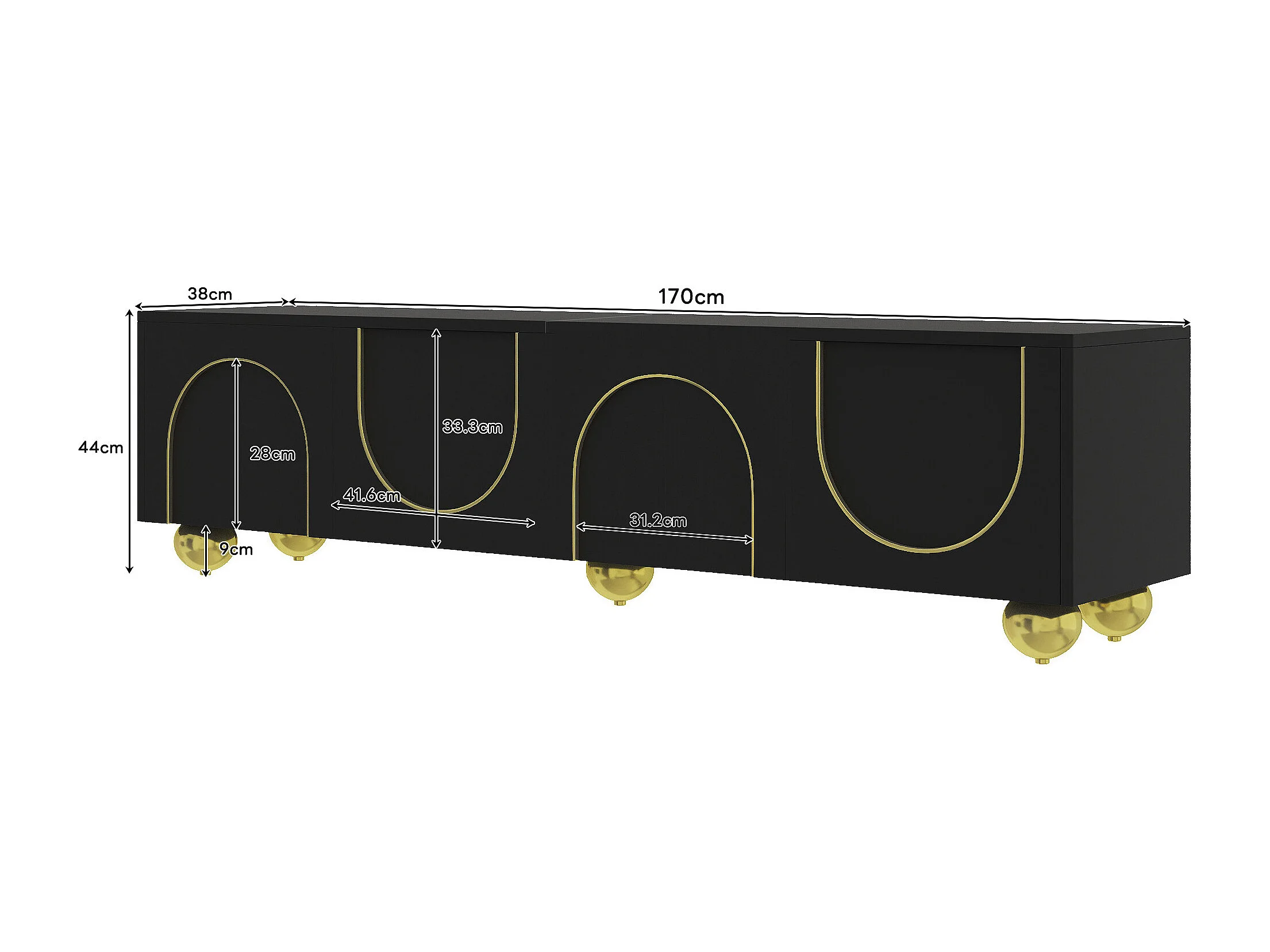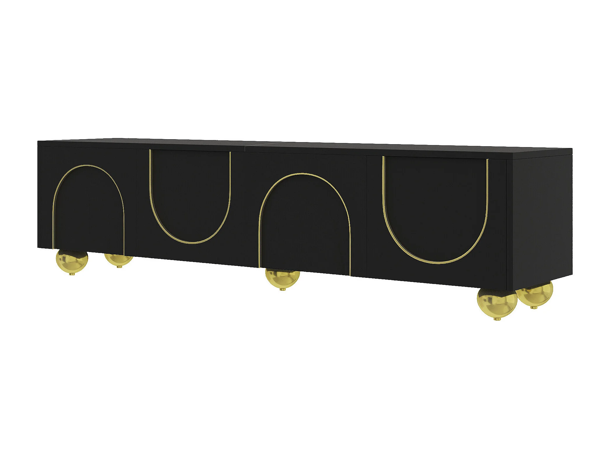 Mueble bajo de TV con puertas texturizadas, cajones y estantes abiertos, tiradores y patas dorados, color negro.