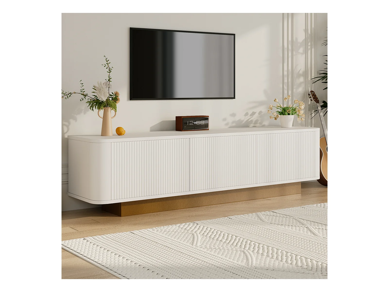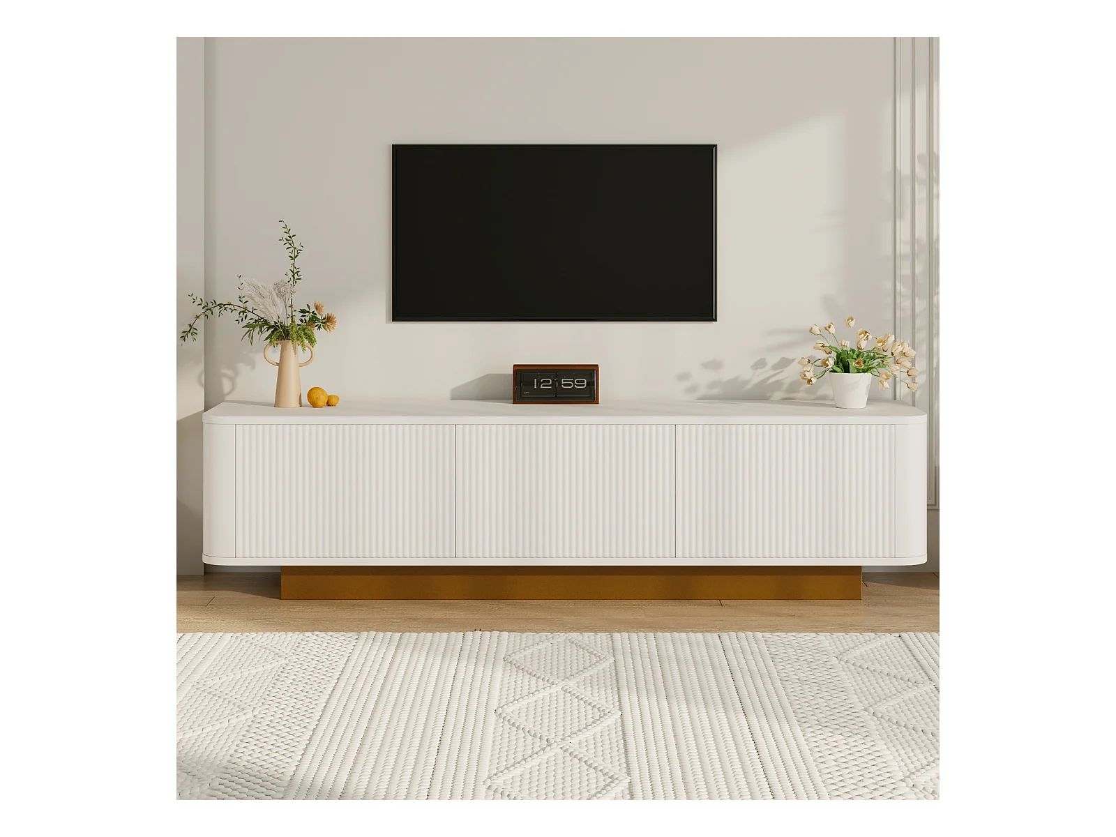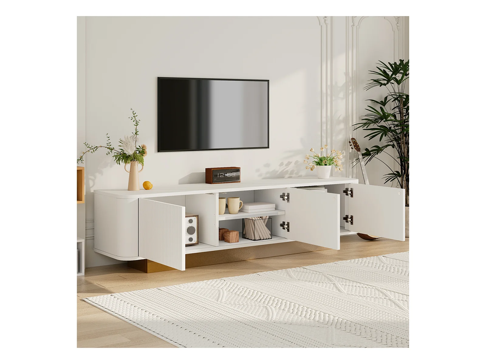 Mueble bajo para TV moderno con diseño redondeado y frente blanco texturizado. Consola multimedia de MDF con práctico espacio de almacenamiento.
