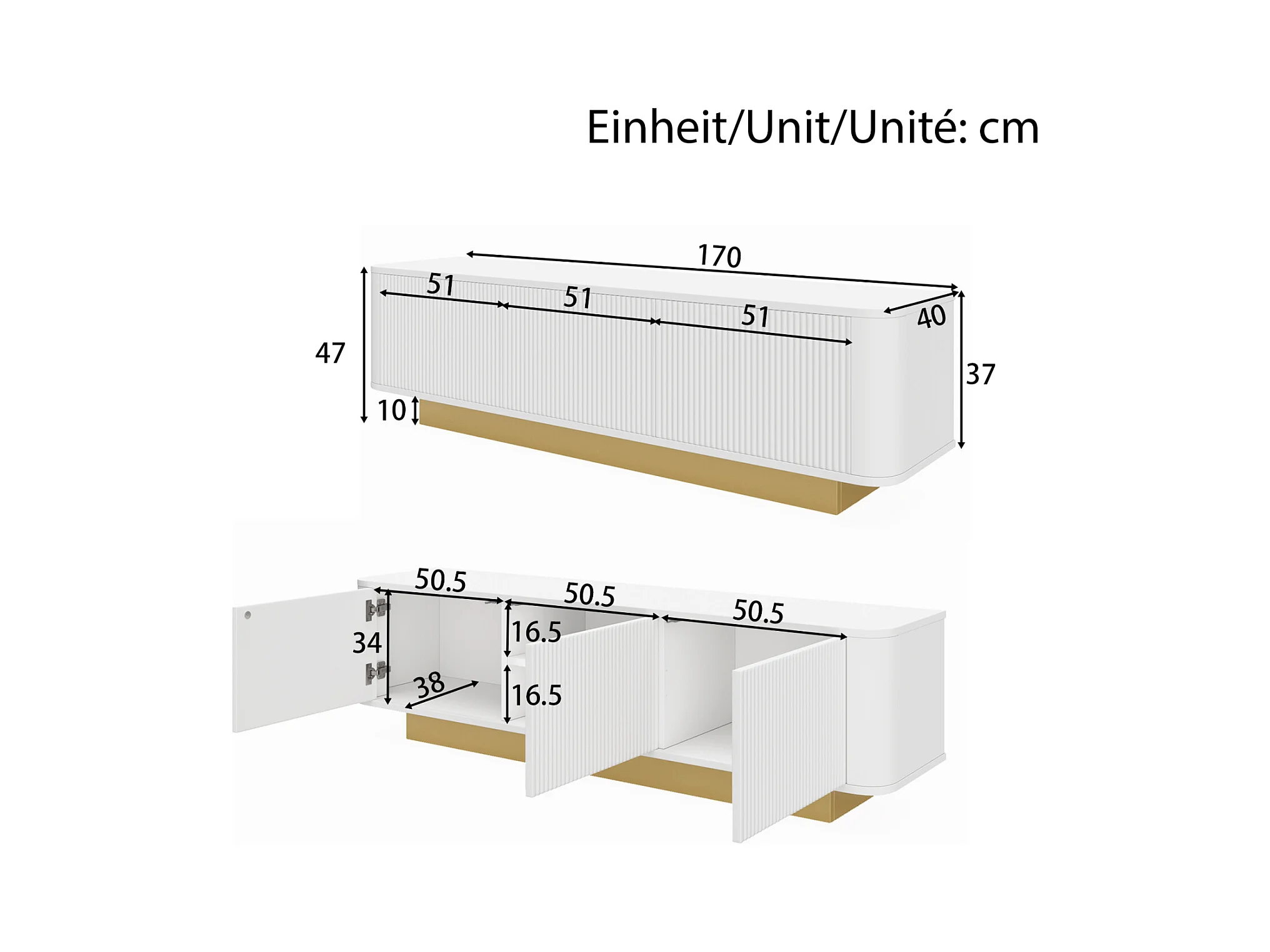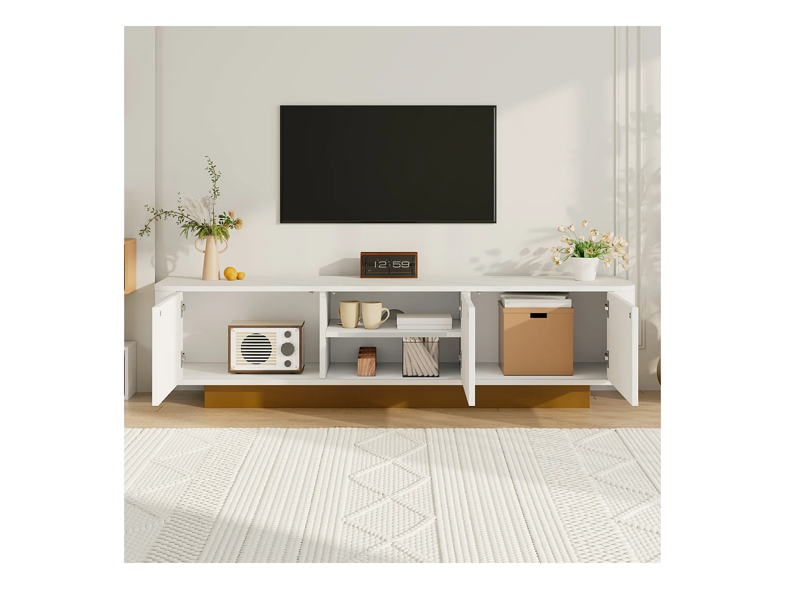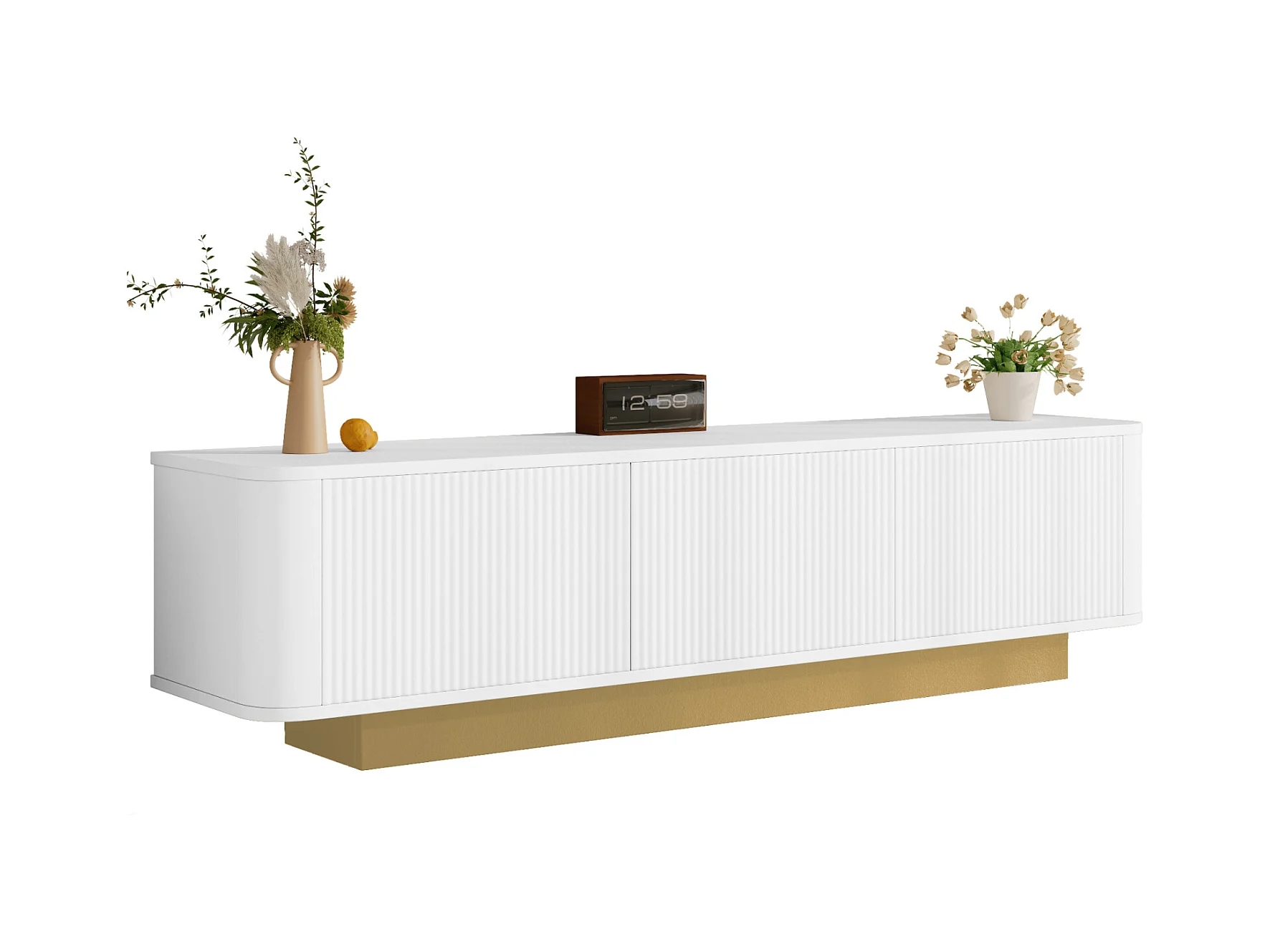 Mueble bajo para TV moderno con diseño redondeado y frente blanco texturizado. Consola multimedia de MDF con práctico espacio de almacenamiento.