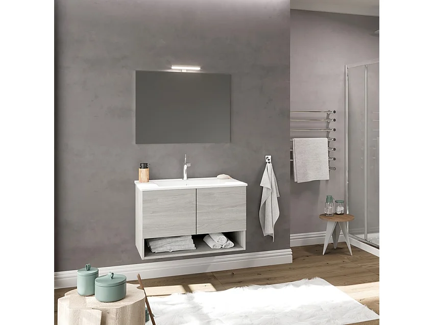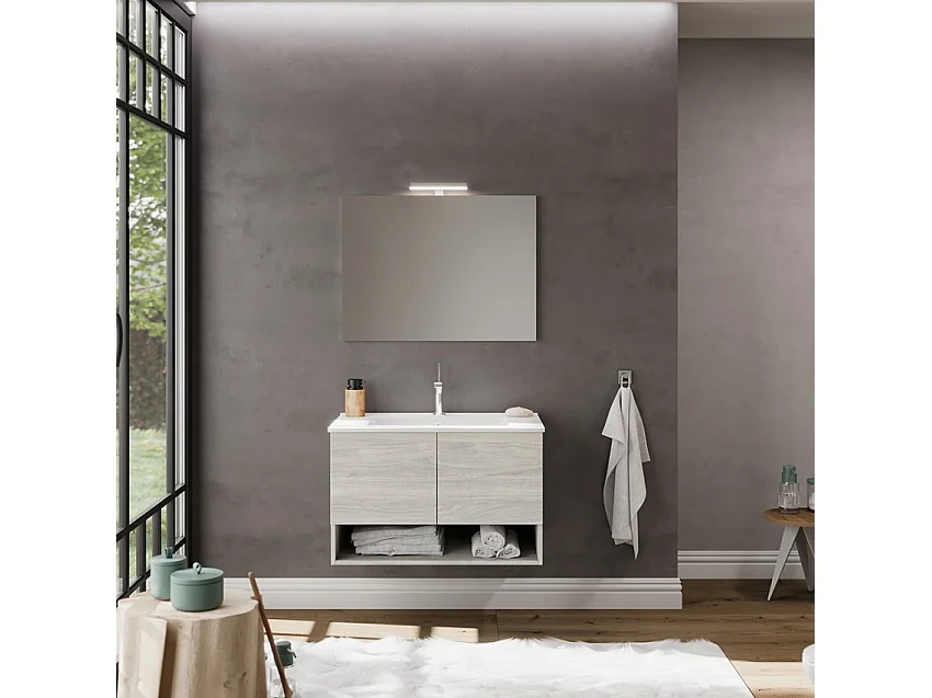 Mueble baño de diseño suspendido con puertas lavabo 80cm y espejo luz led Oslo 80 - Gris