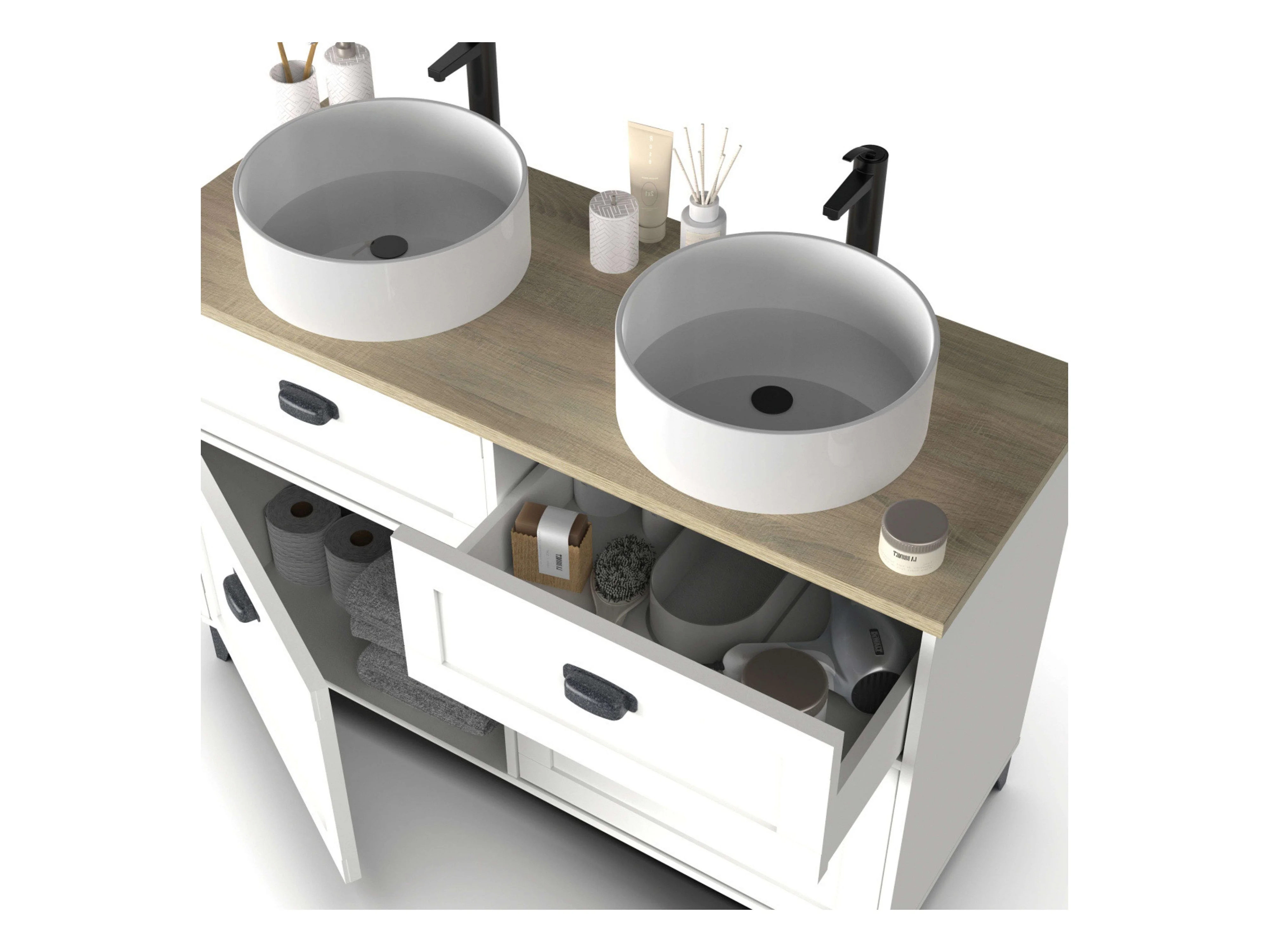 Mueble Baño Doble Toscana 120cm 2 Cajones Puertas Lavabos Blanco Roble