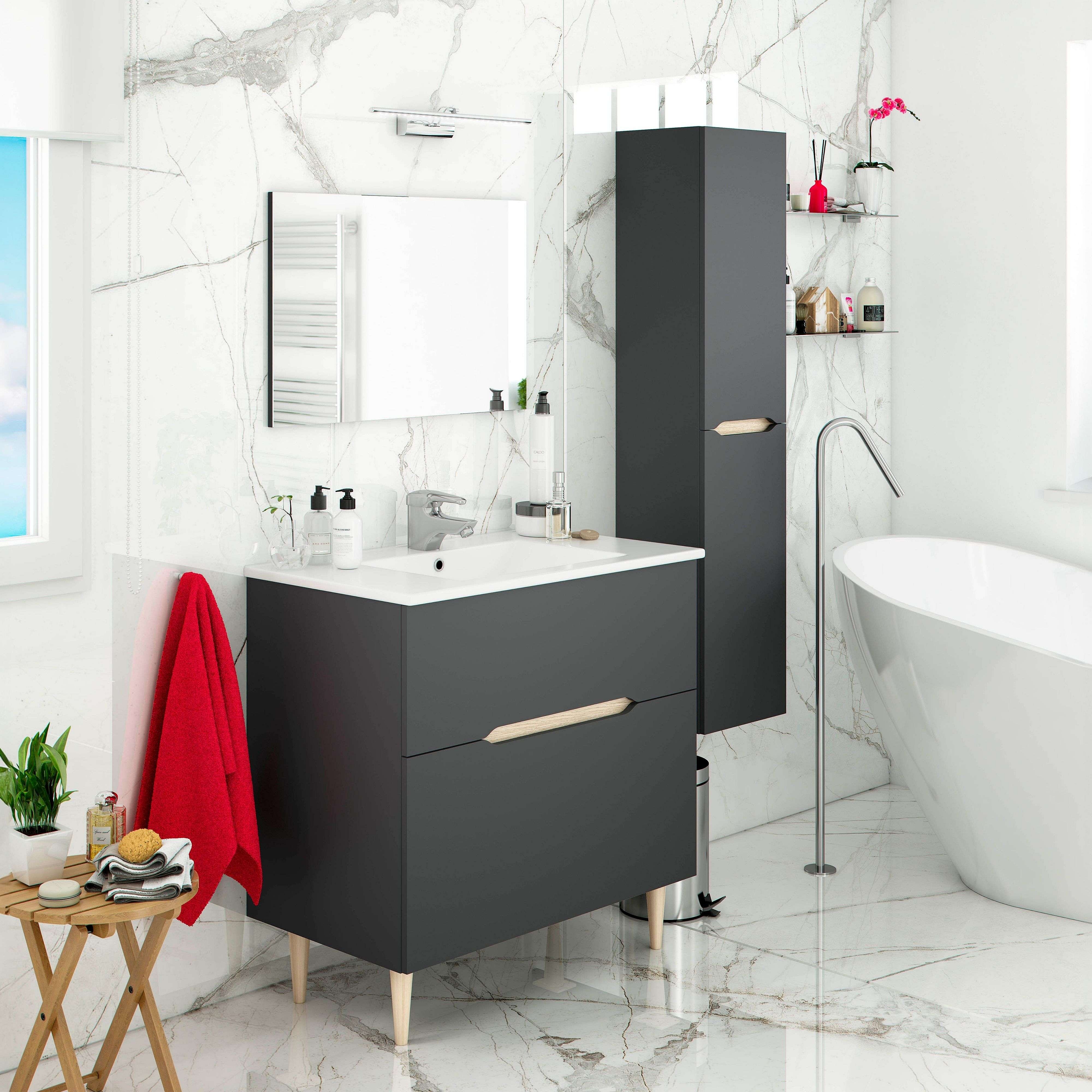Mueble de baño de pie "Figi" de 80 cm de resina gris con lavabo gris y espejo rectangular con retroiluminación LED.