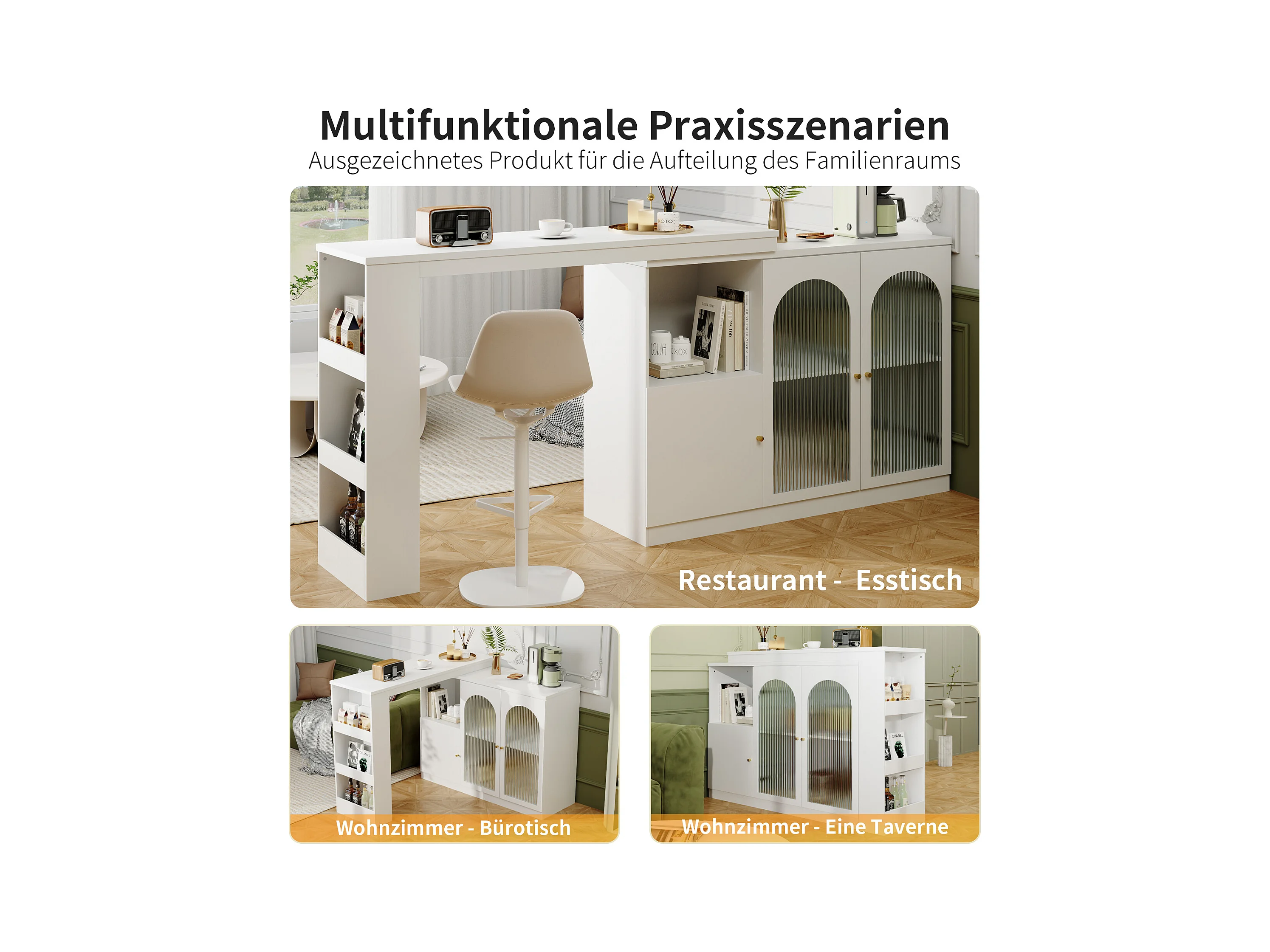 Mueble de bar giratorio y abatible 360° - 204×39×105 cm - 3 puertas - estantes abiertos - blanco