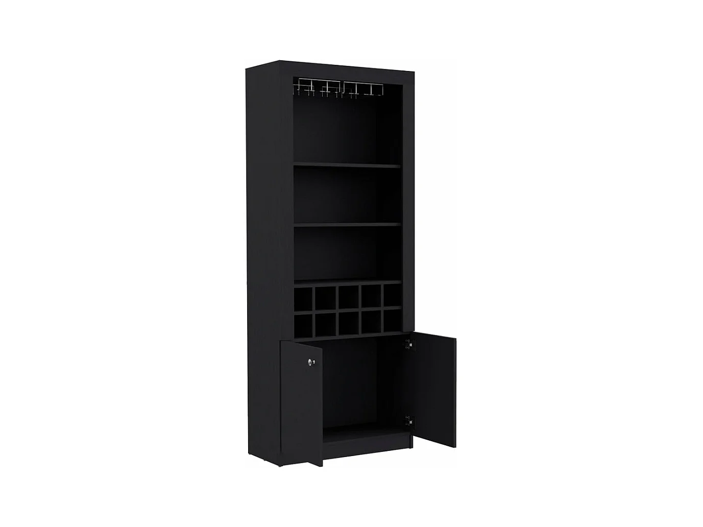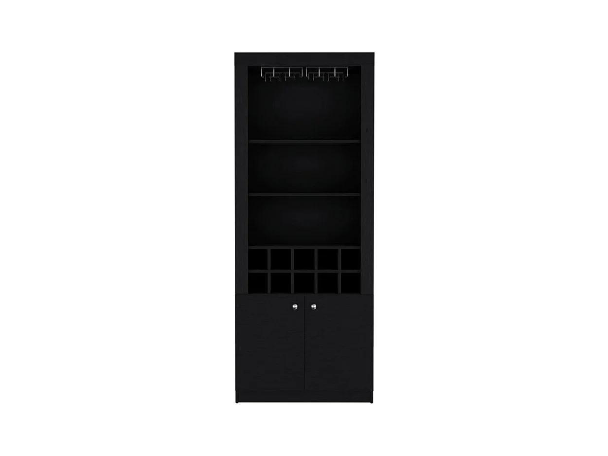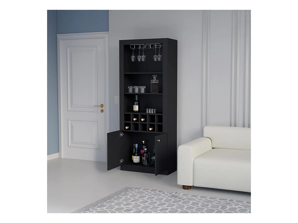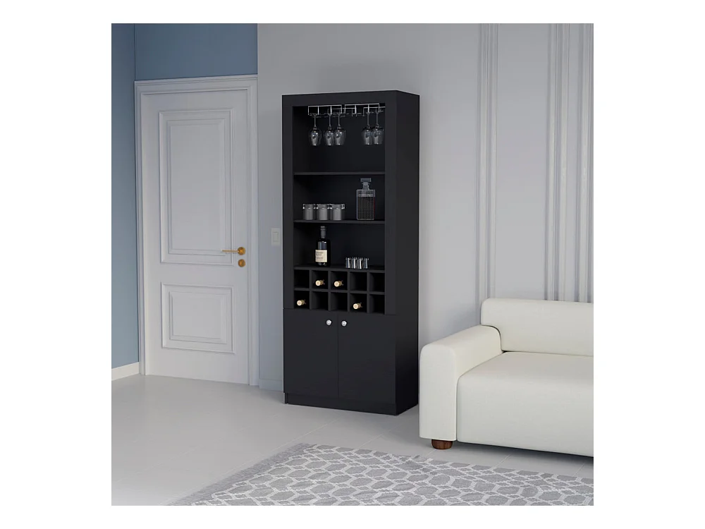 Mueble Bar Nebo en melamina con 4 estantes , 2 puertas , 10 portabotellas y 8 portacopas , negro , 190 cm X 75 cm X 36.5 cm