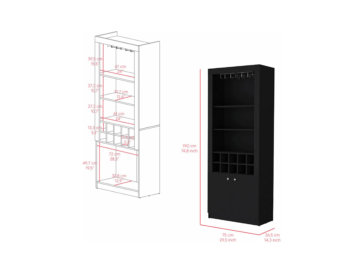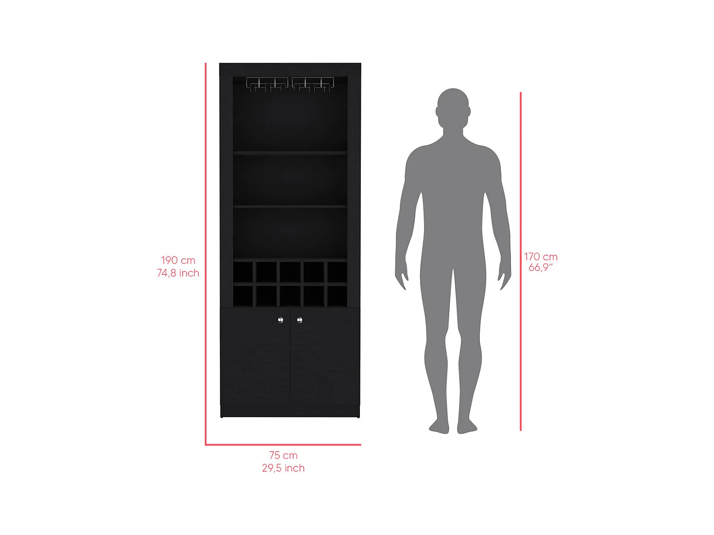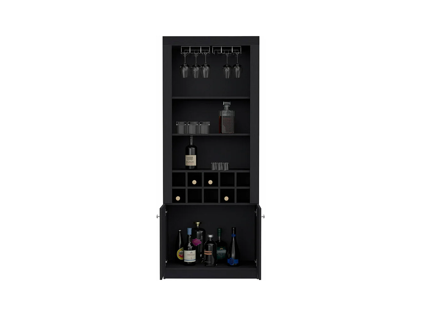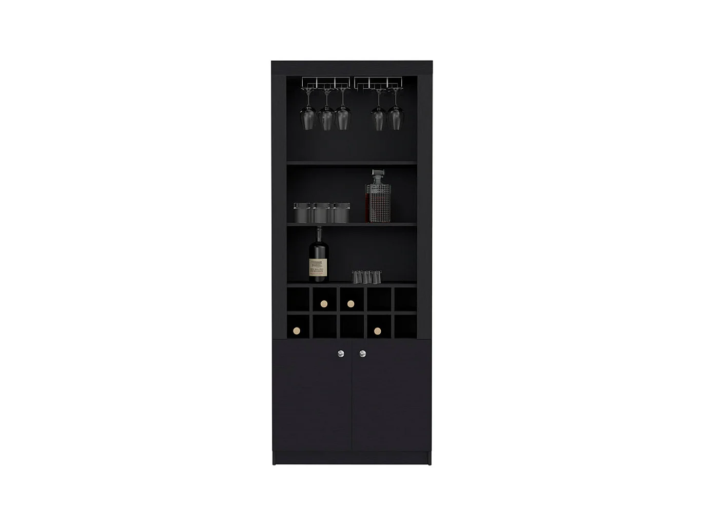 Mueble Bar Nebo en melamina con 4 estantes , 2 puertas , 10 portabotellas y 8 portacopas , negro , 190 cm X 75 cm X 36.5 cm