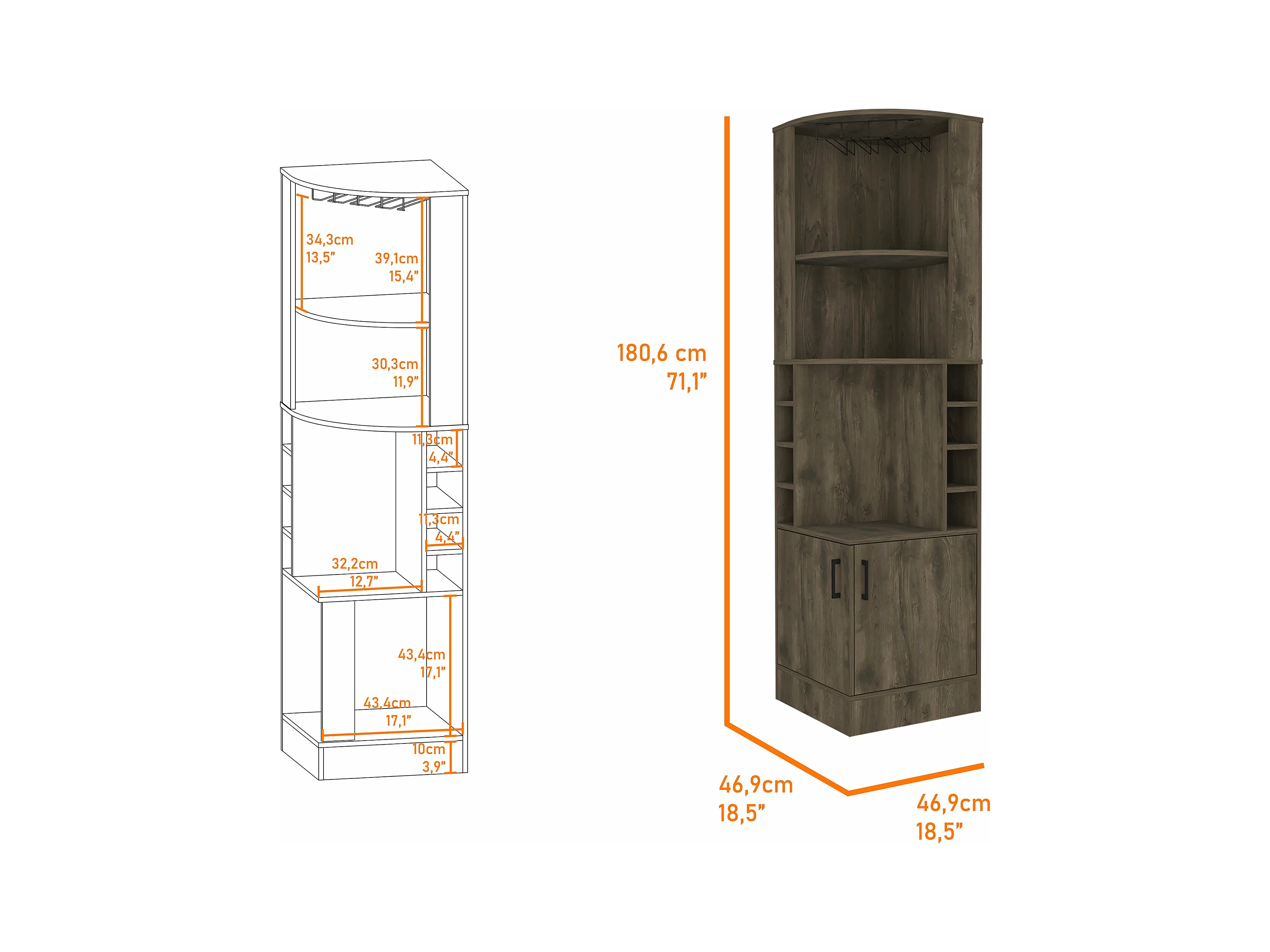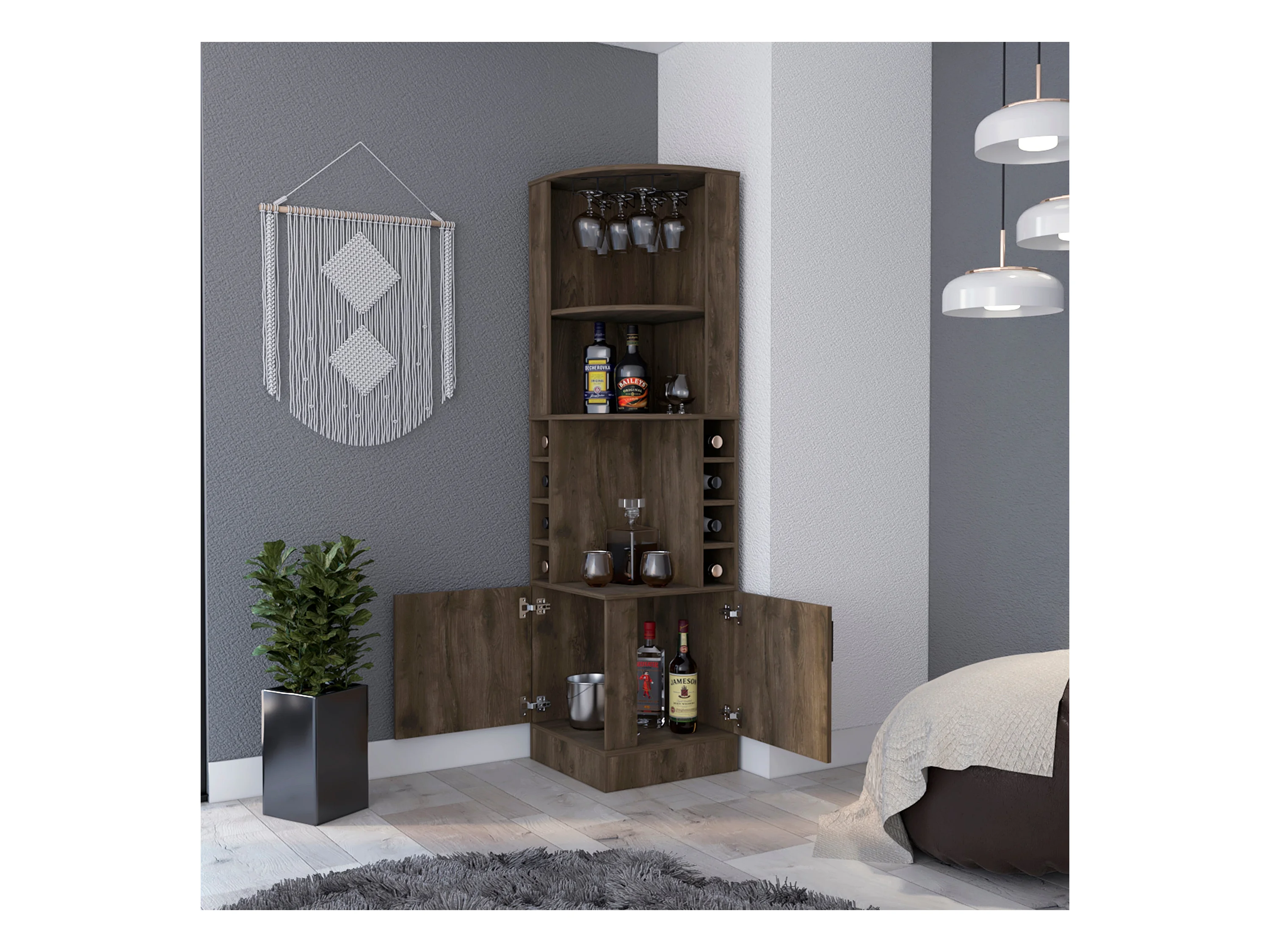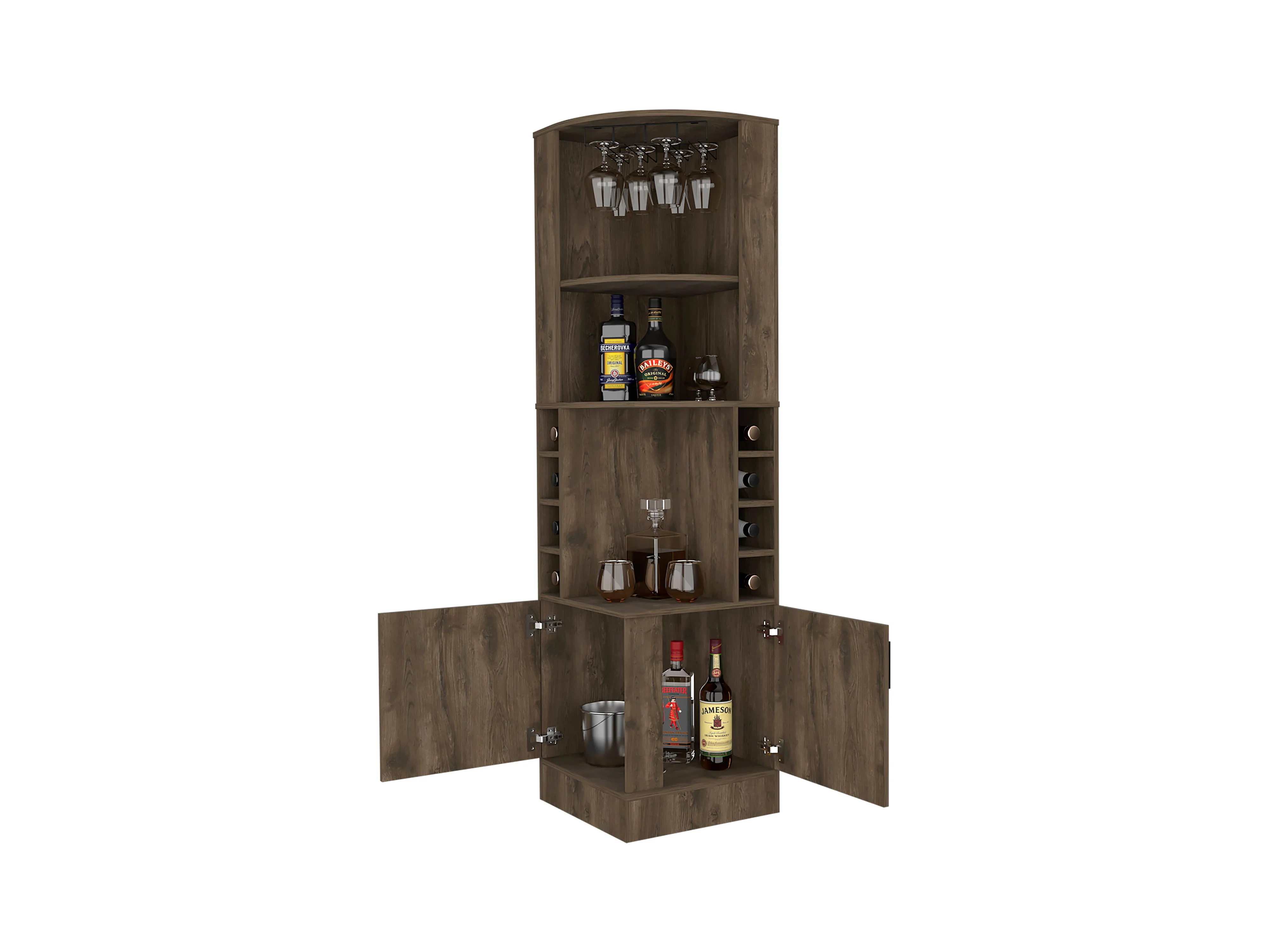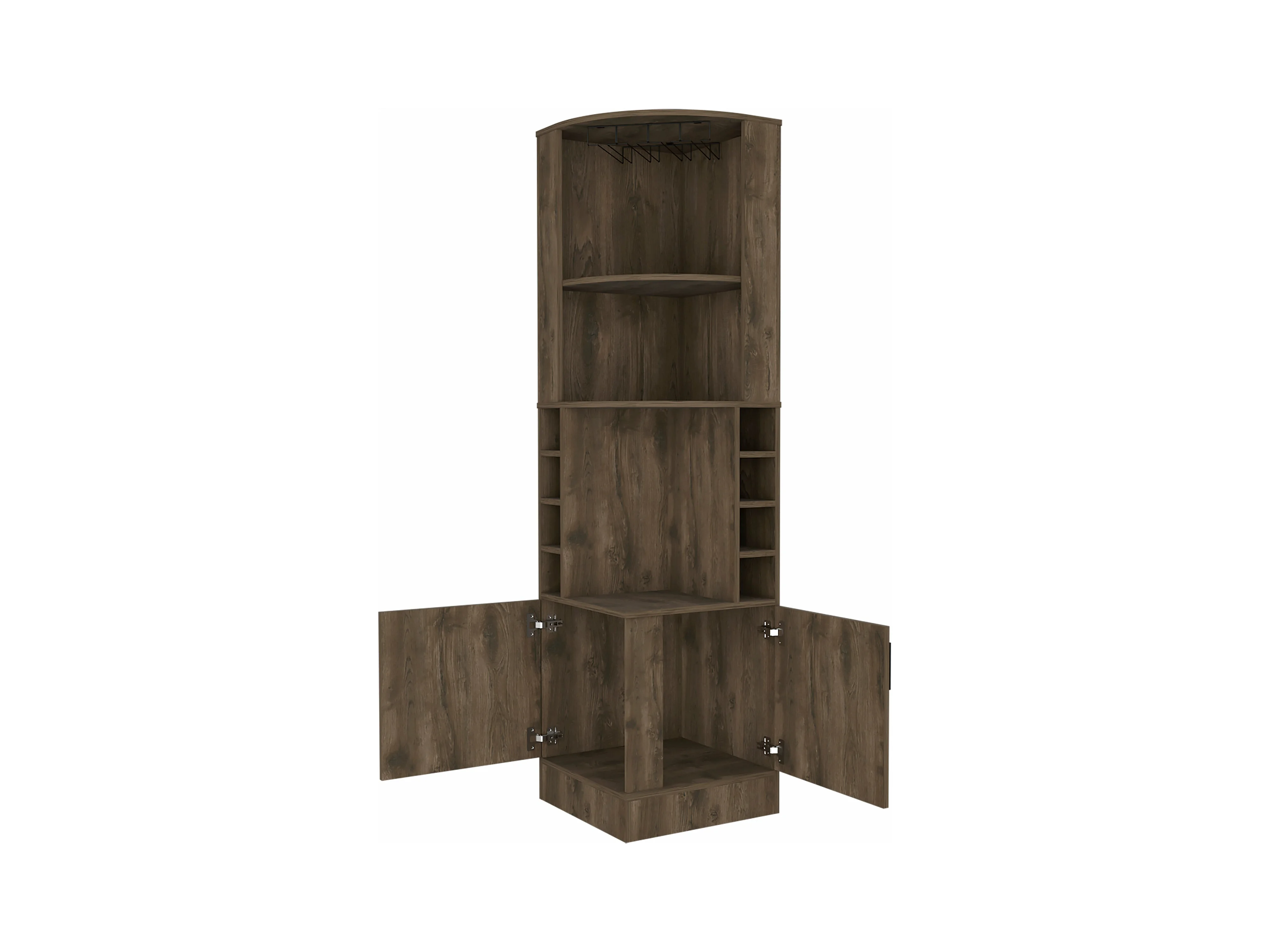 Mueble Bar Syrah en melamina con 4 estantes , 2 puertas 4 portacopas y 4 portacopas , marron , 180.6 cm X 46.9 cm X 46.9 cm
