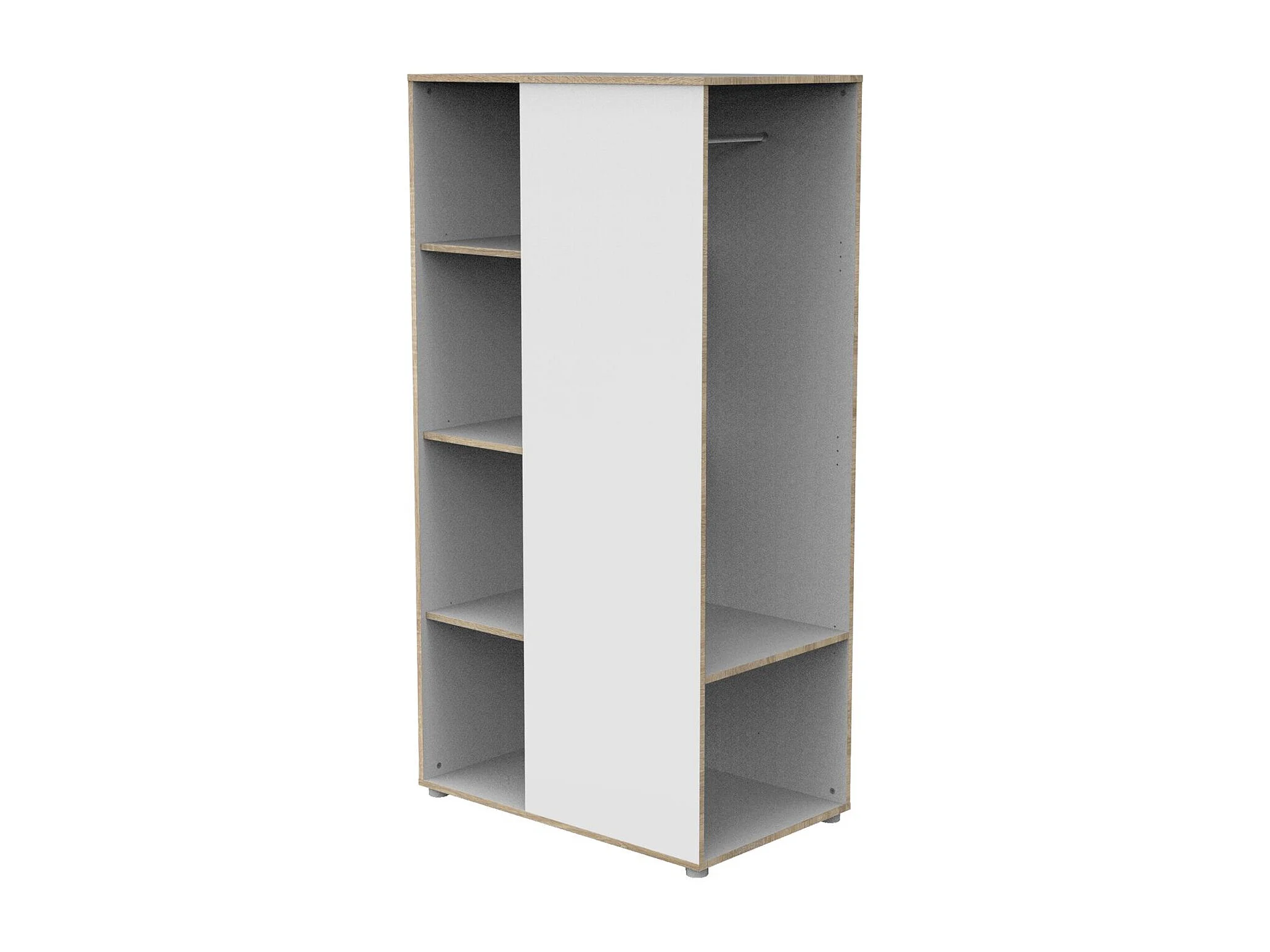 Mueble con estantes y espacio para colgar en madera blanca y cantos de madera