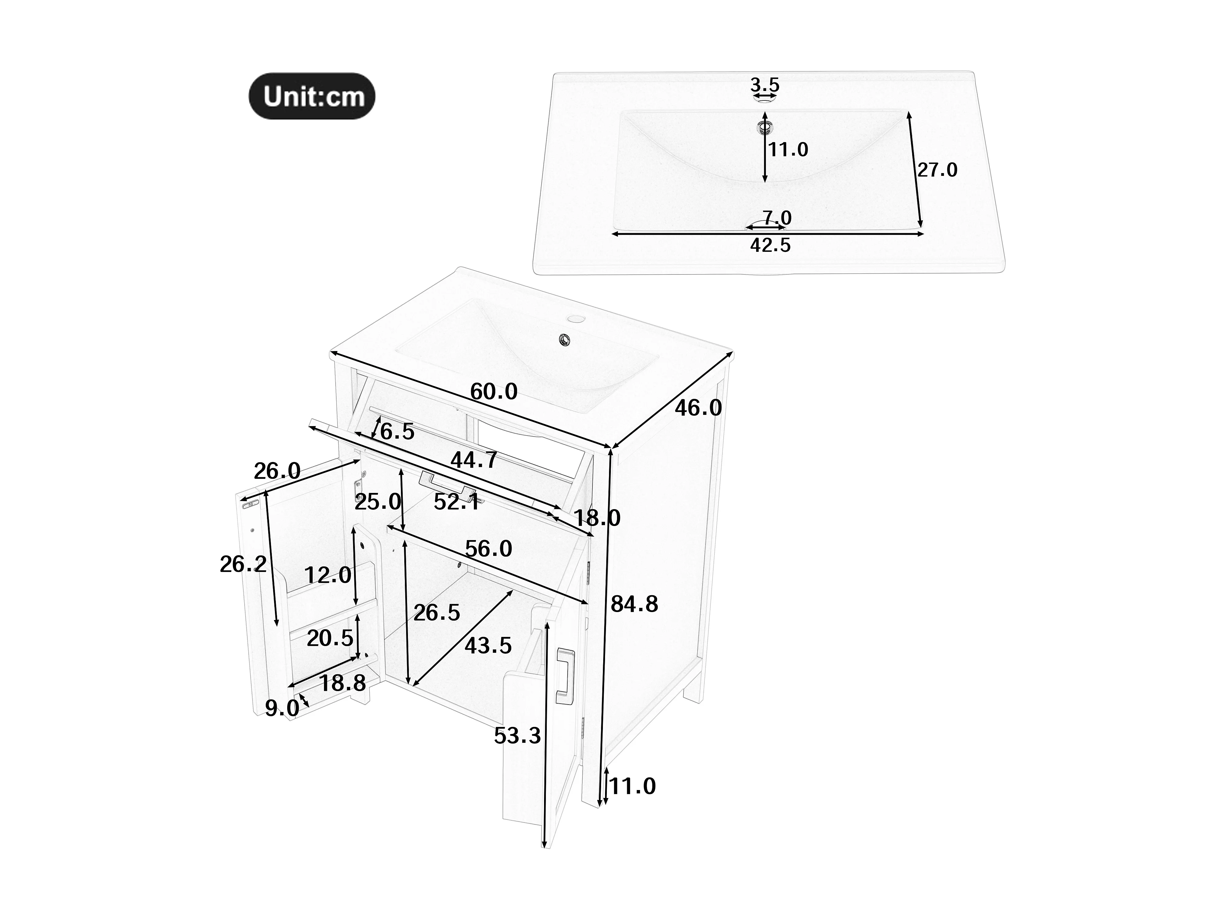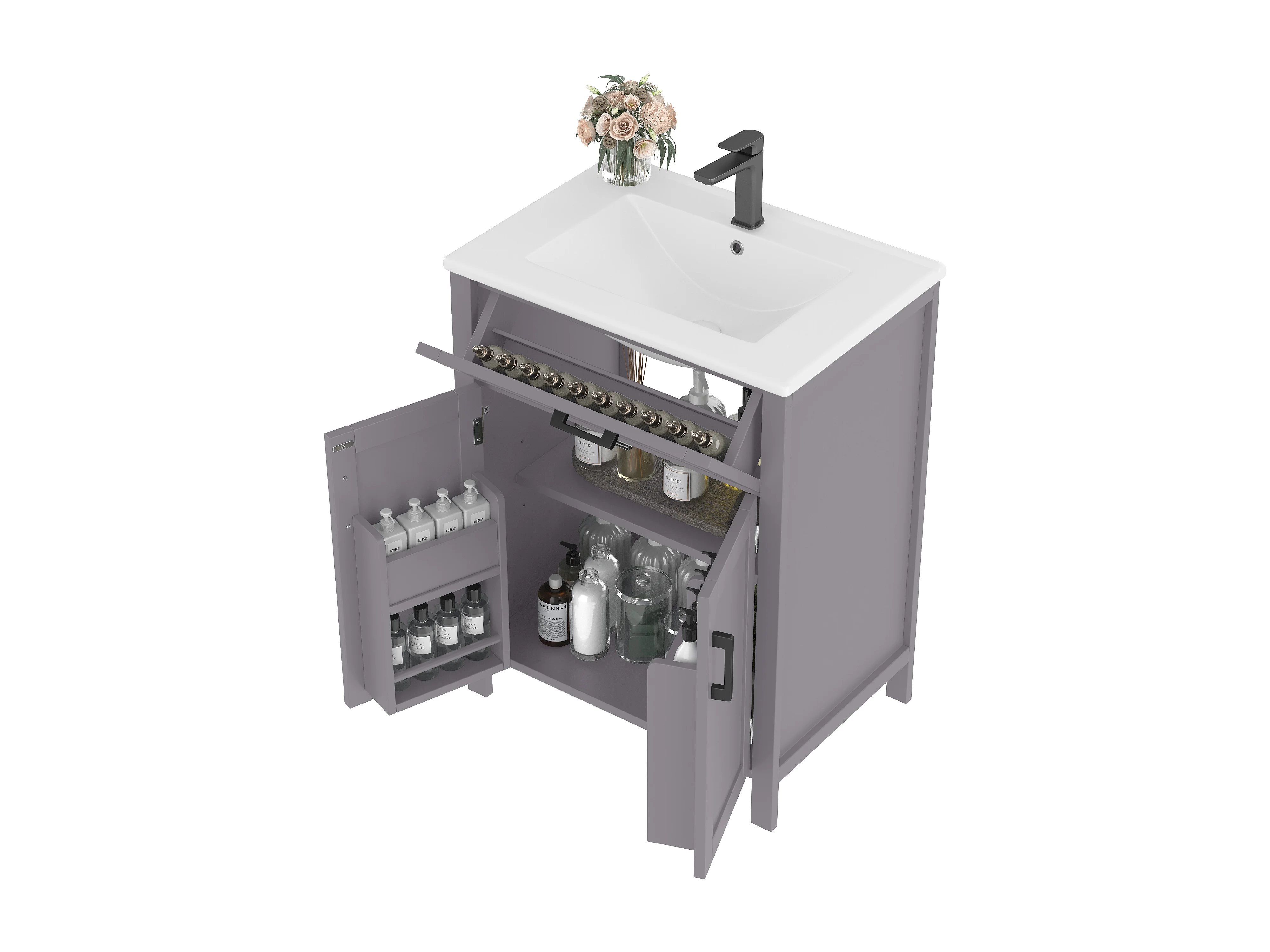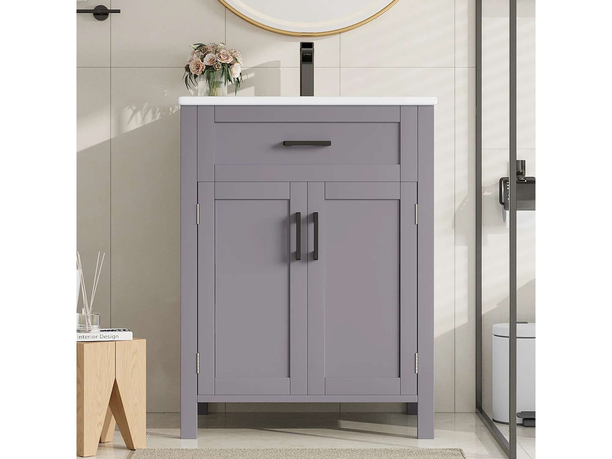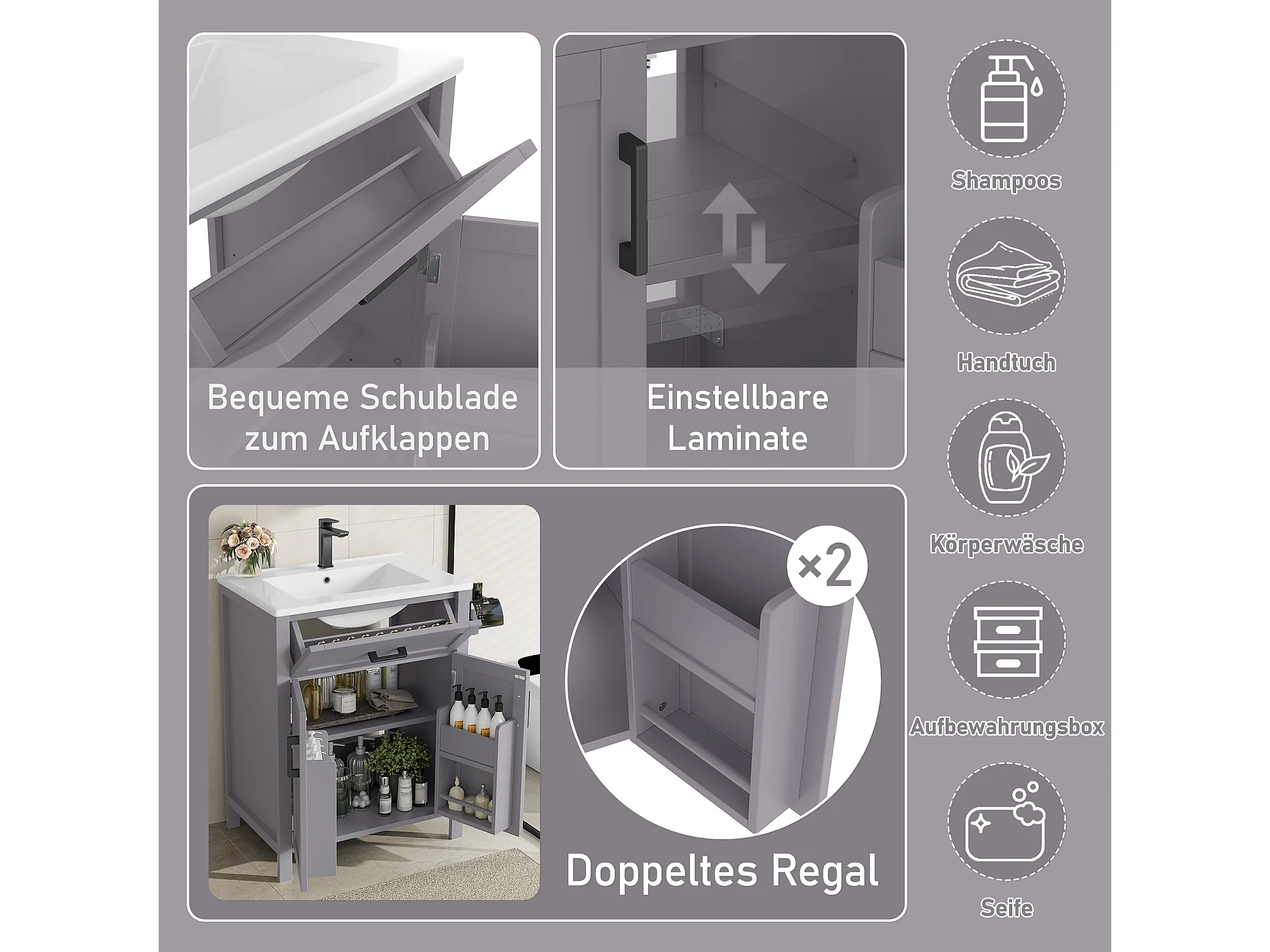 Mueble de baño con lavabo, puerta con estantes, diseño moderno, MDF, gris (60x46x84,8 cm)