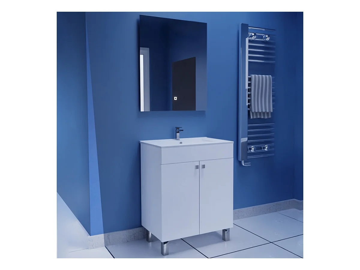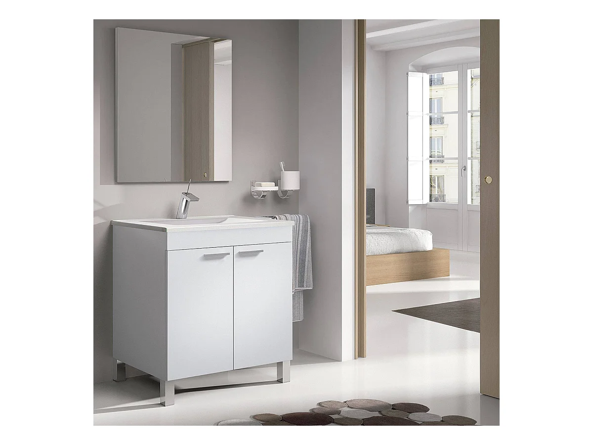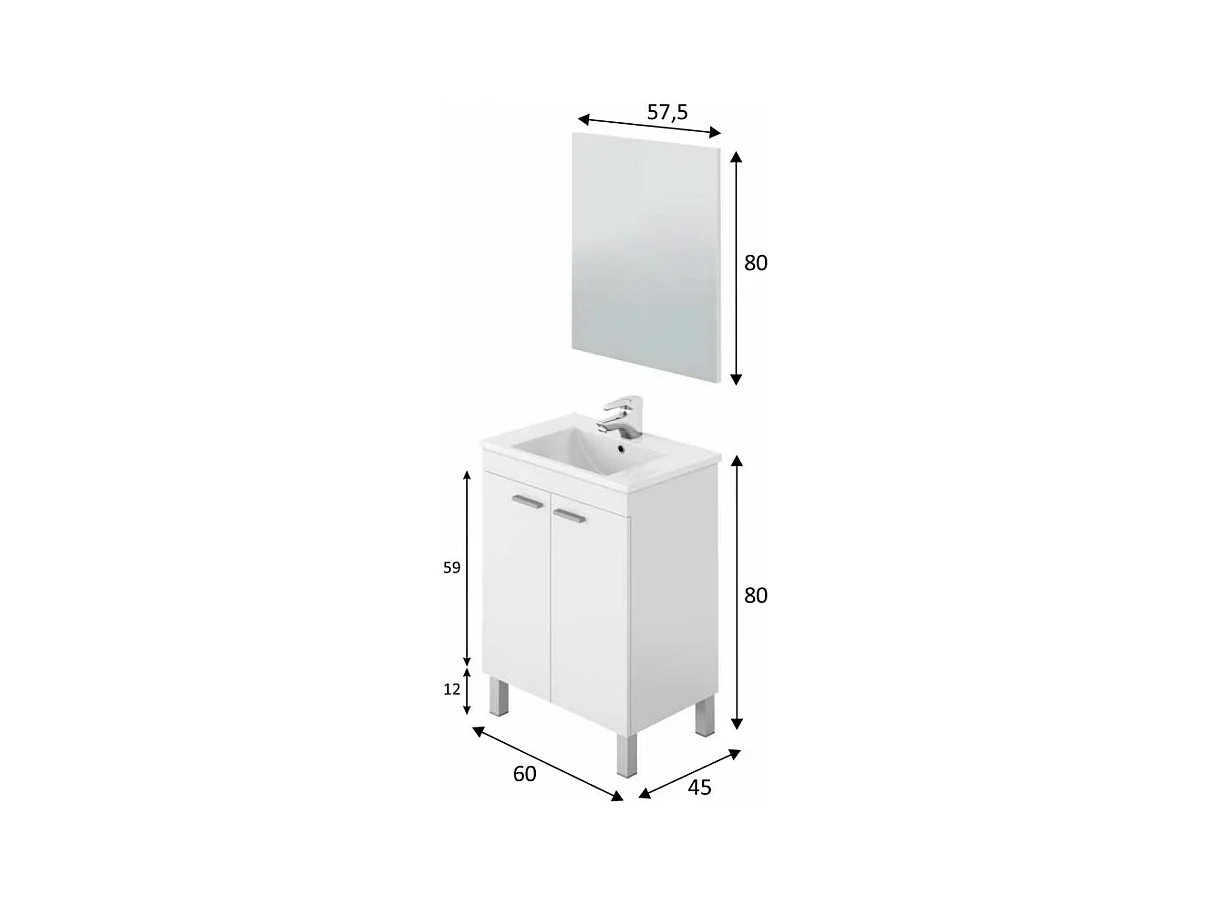 Mueble de Baño o Aseo con Patas, 2 Puertas y Espejo, Acabado en Blanco Brillo - Dim: 60 cm (Ancho) x 80 cm (Alto) x 45 cm (Fondo)