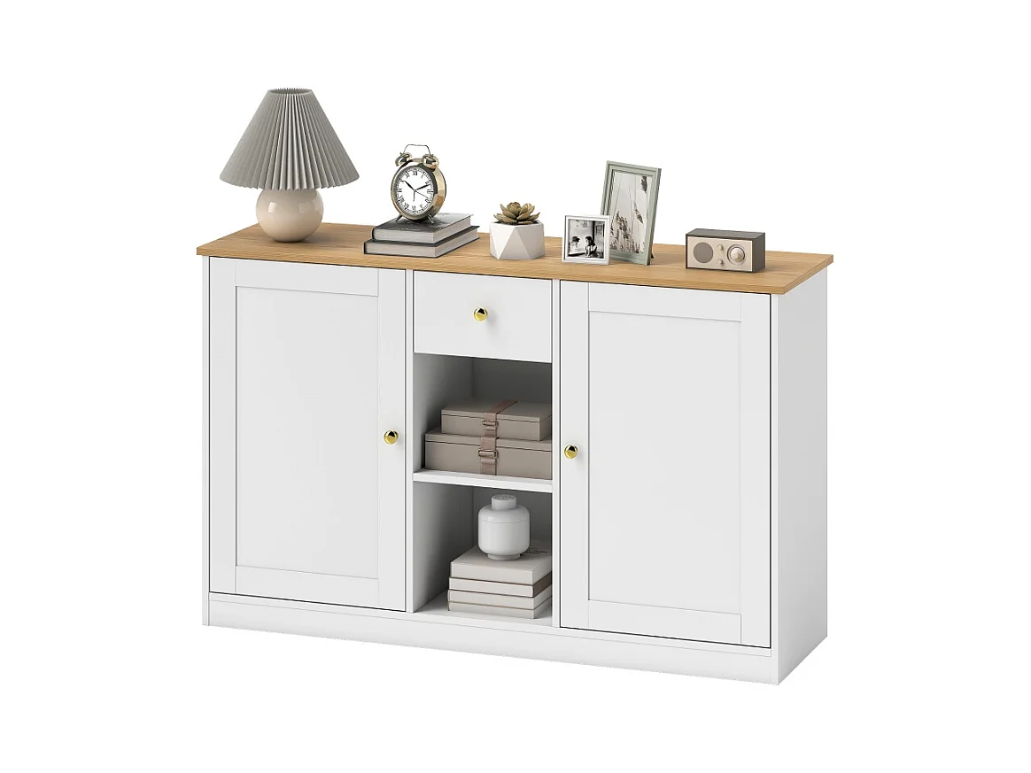 Aparador microondas madera blanca con almacenaje, 3 puertas, cajón, balda regulable 80x35x72cm