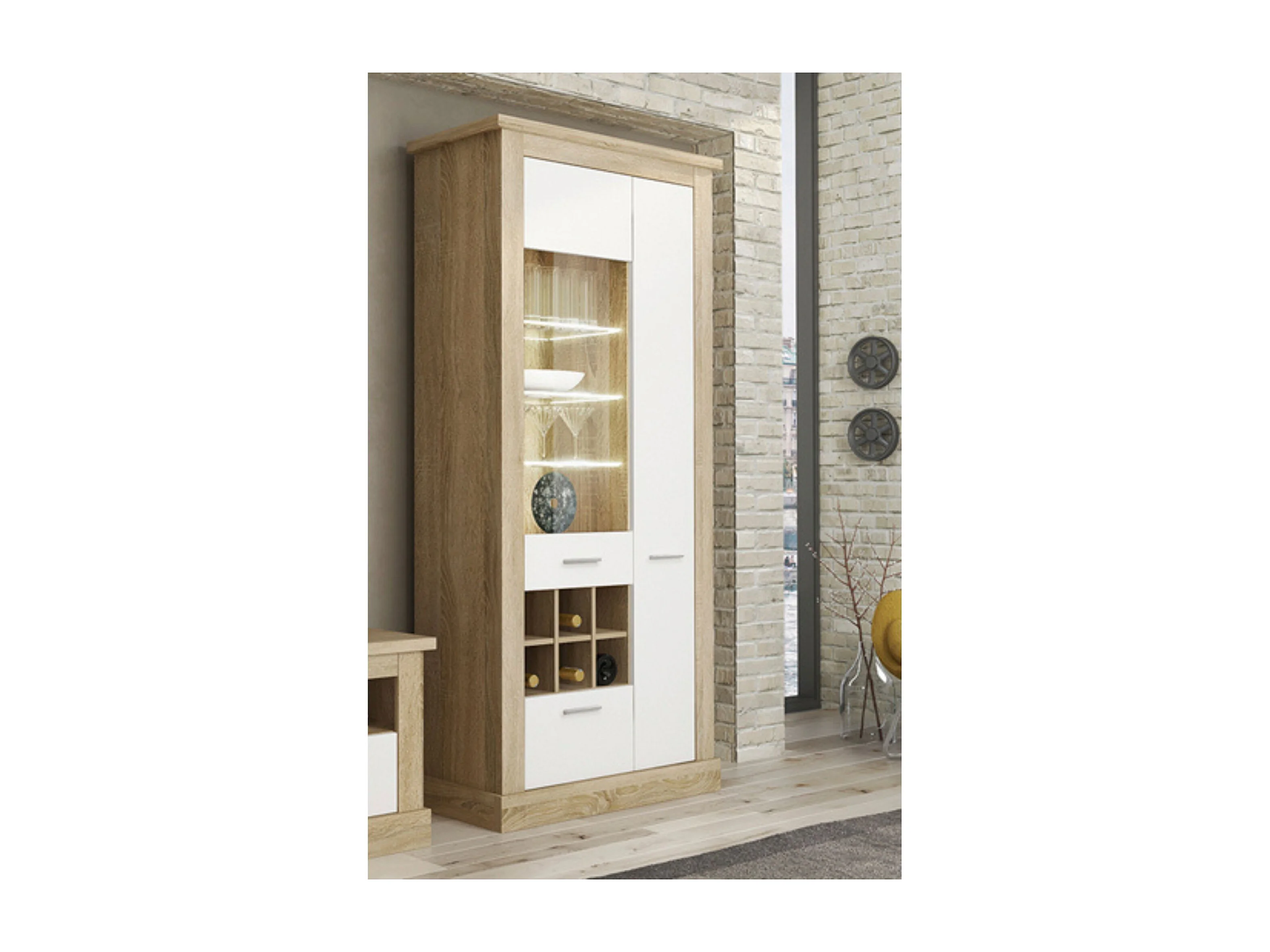 Mueble de Comedor, Mueble Televisión, Acabado en Blanco y Cambria, Medidas: 276 cm (Ancho) x 201,6 cm (Alto) x 41,8 cm (Fondo)