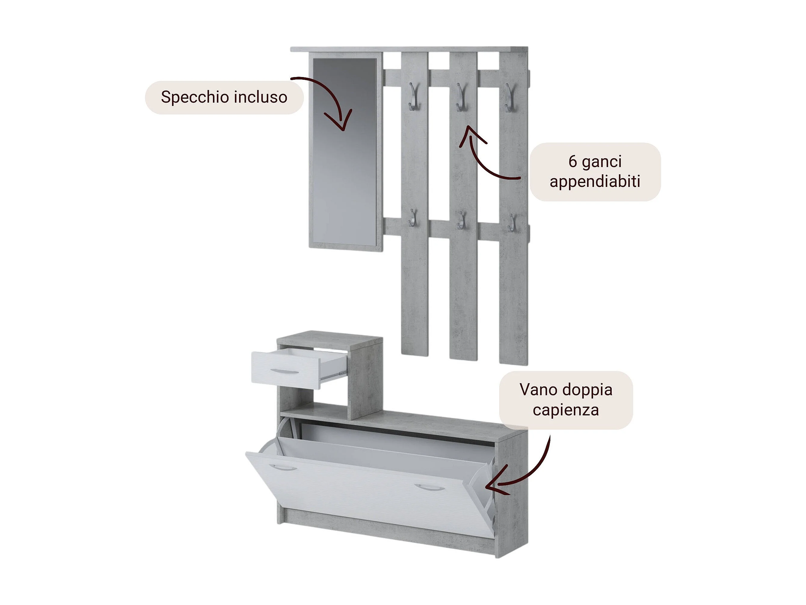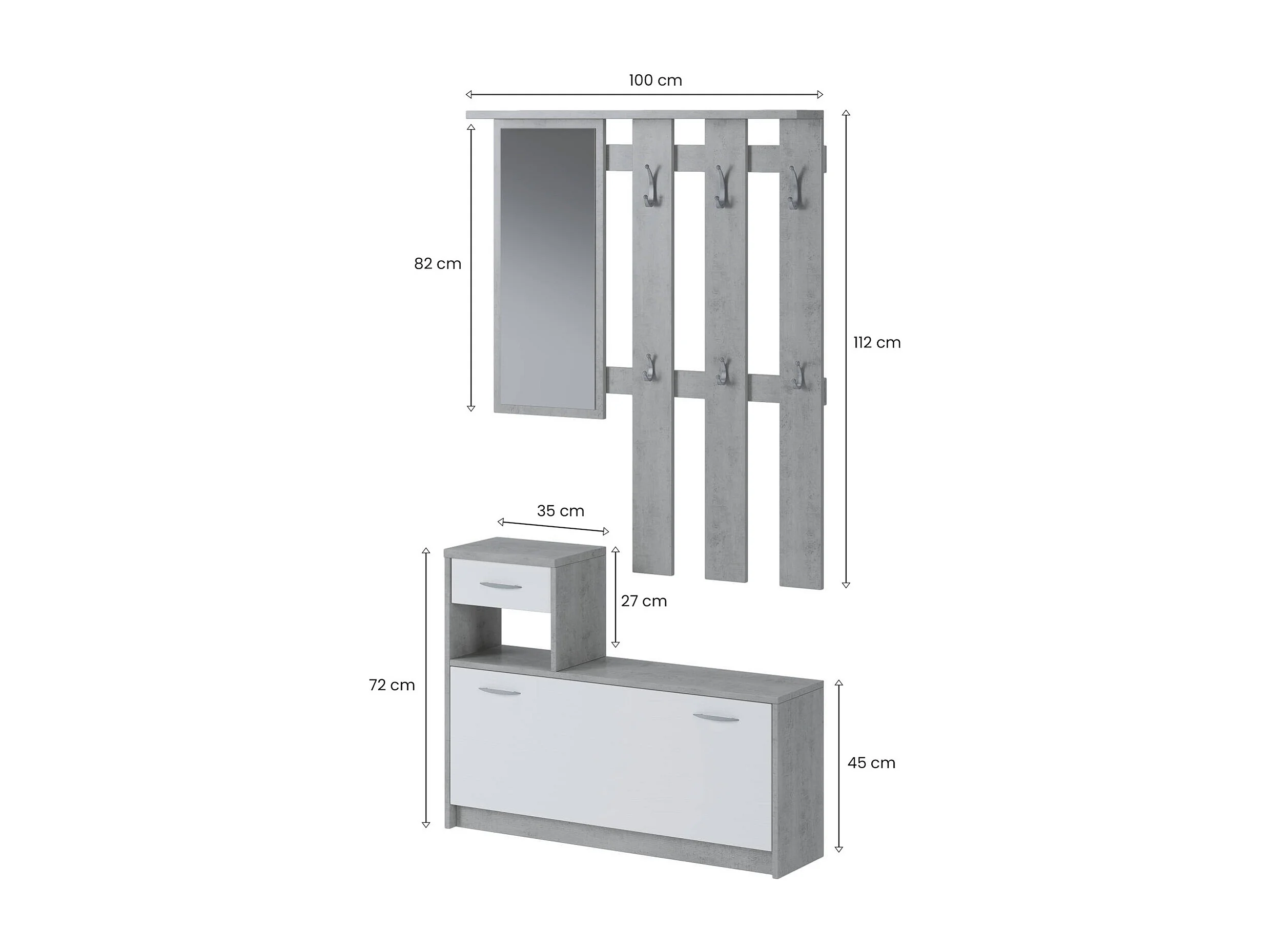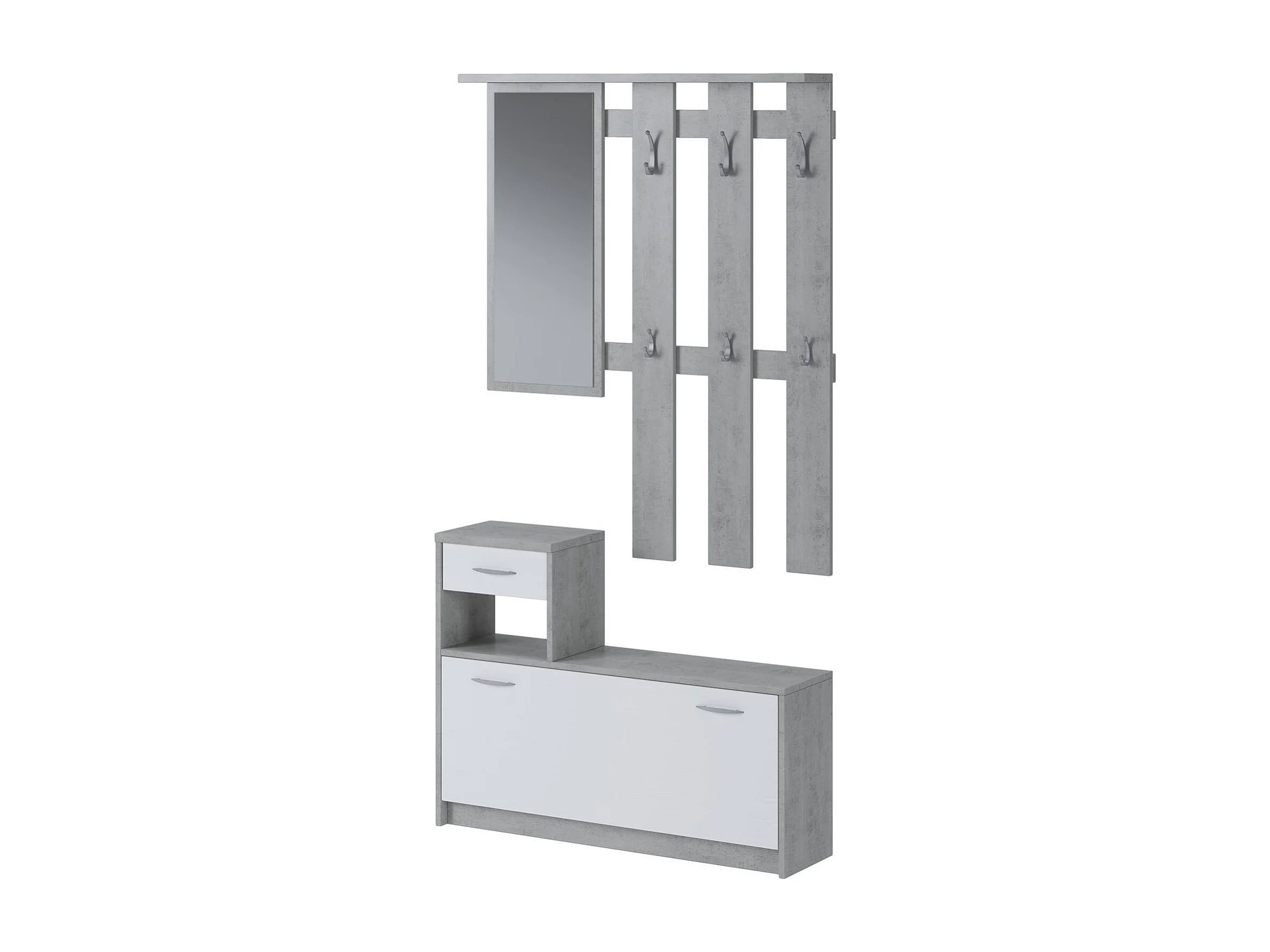 Muebles de entrada 0, Recibidor moderno con espejo, Mueble con zapatero, Mueble multifunción, 100x25h180 cm, Blanco y Cemento