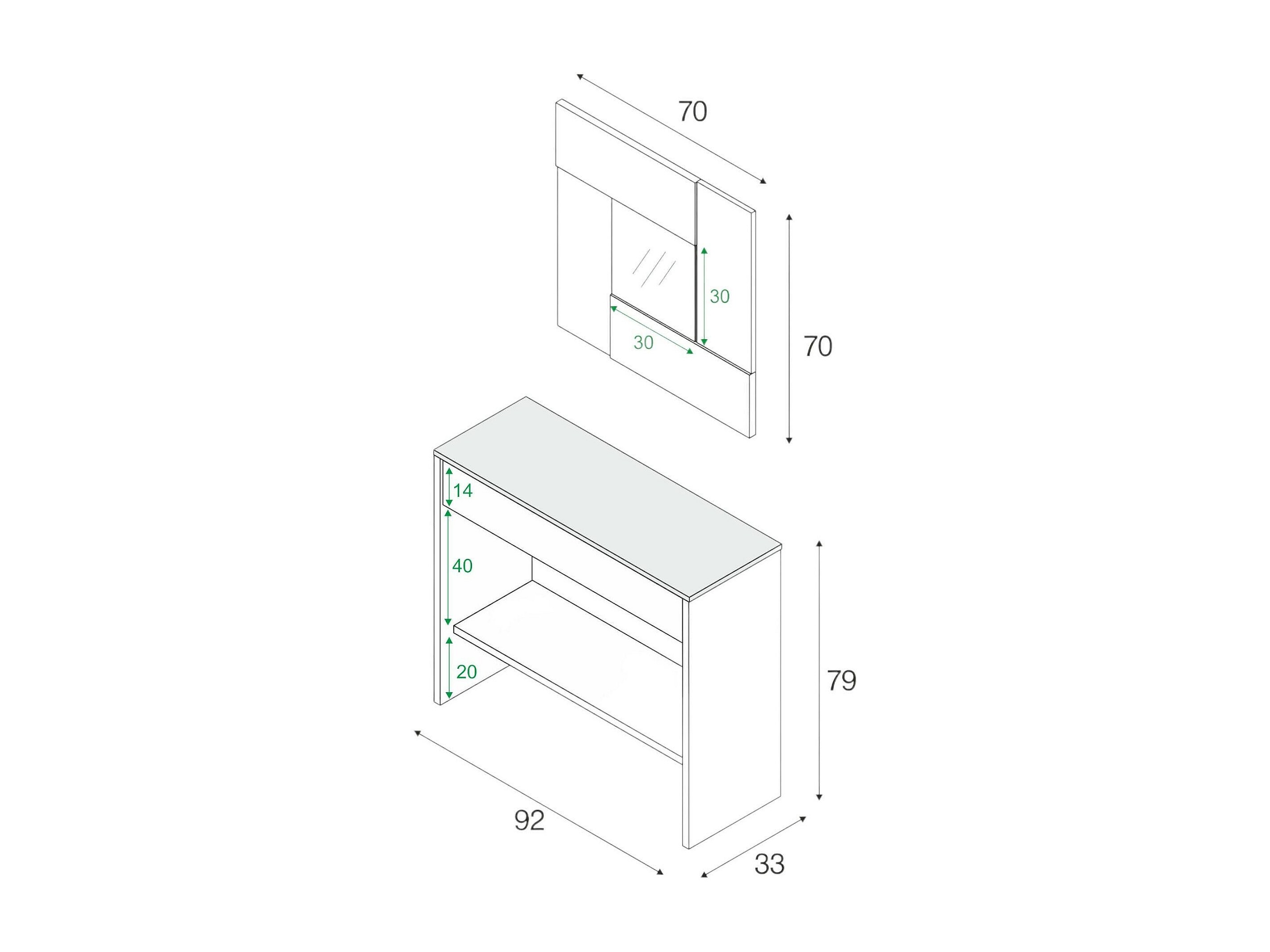 MEDIDAS EN CM - Mueble entrada: Largo: 92 Ancho: 33 Alto: 79 - Capacidad cajón: 84x25h10 - Espejo: 70x2,5h70