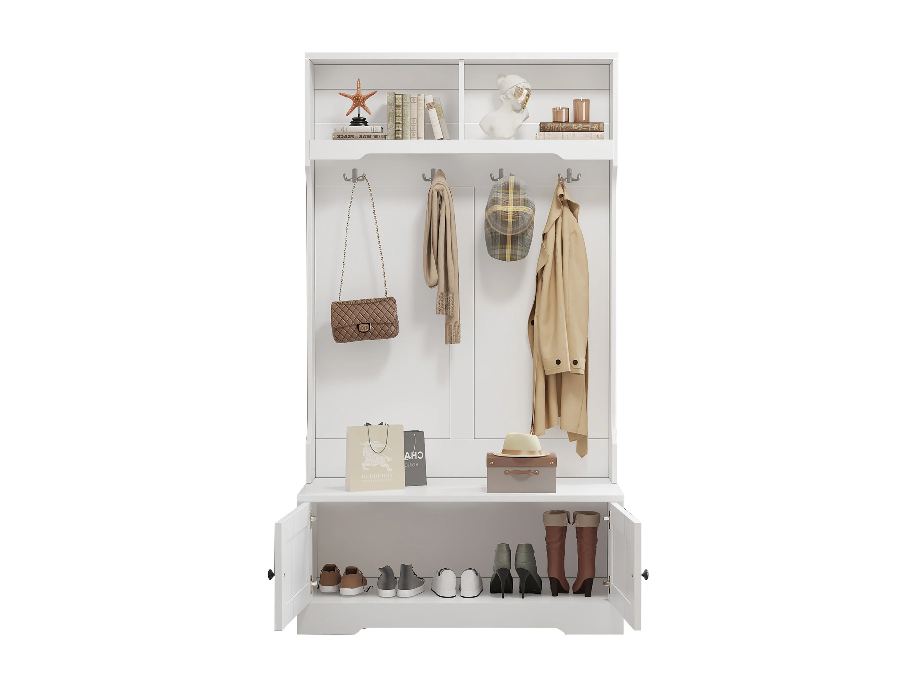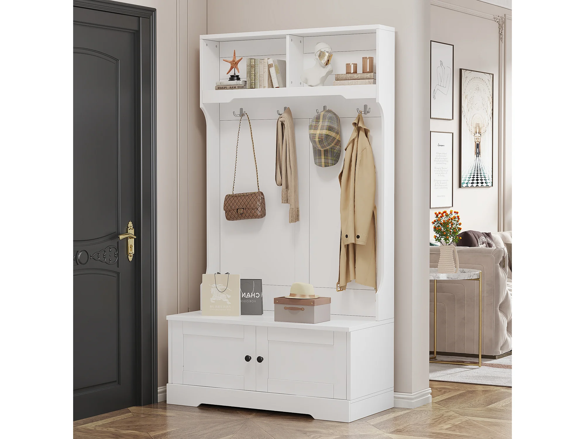 Mueble de entrada de madera blanca con banco de almacenaje, guardarropa, perchero 101x183 cm