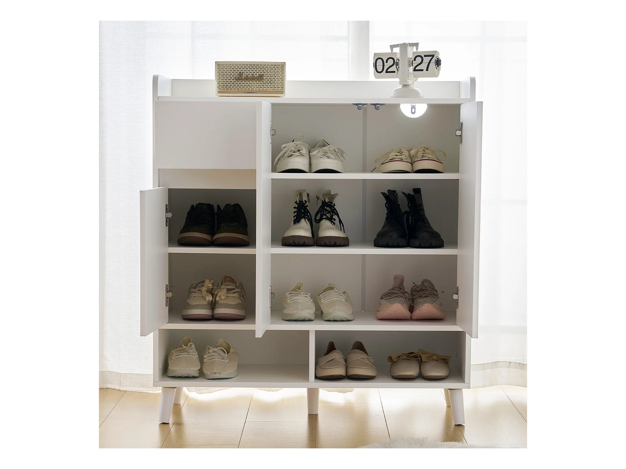 Zapatero de MDF blanco mate 3 estantes con entrada de cajón bajo 75x37x110 cm