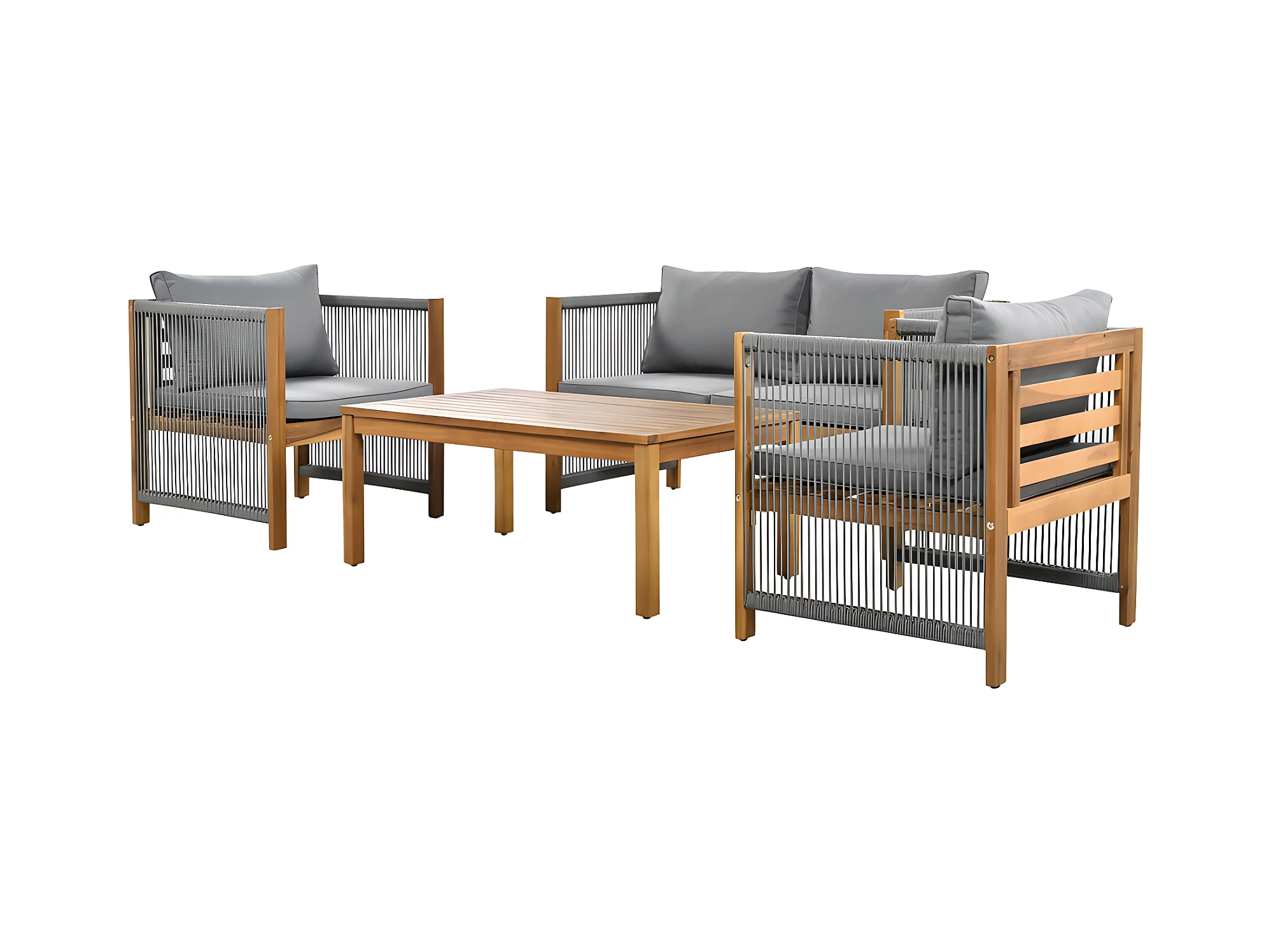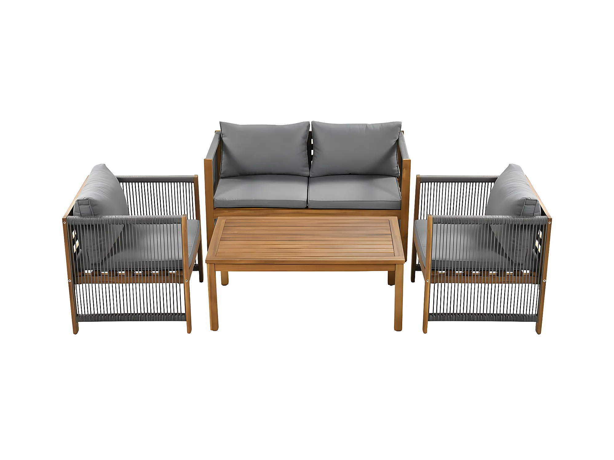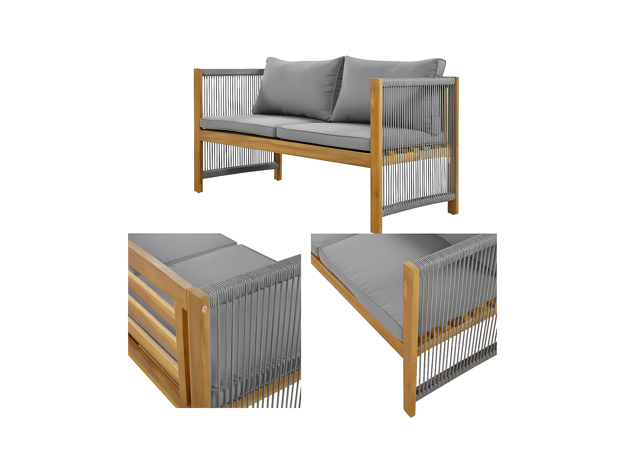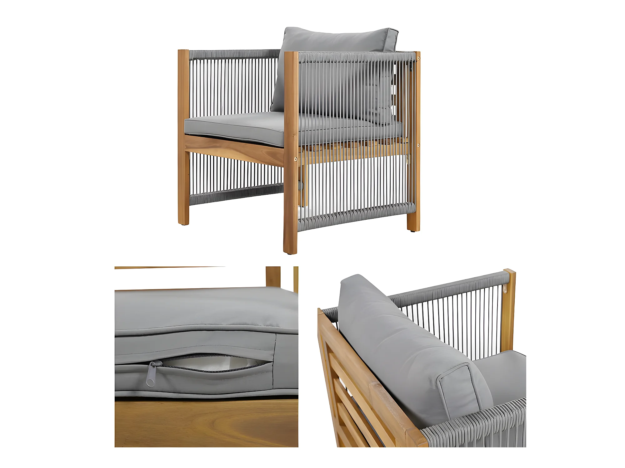 Mobiliario de jardín de acero de 4 plazas - sofá, 2 sillones y mesa de centro - en cuerda tejida y madera de acacia - Gris