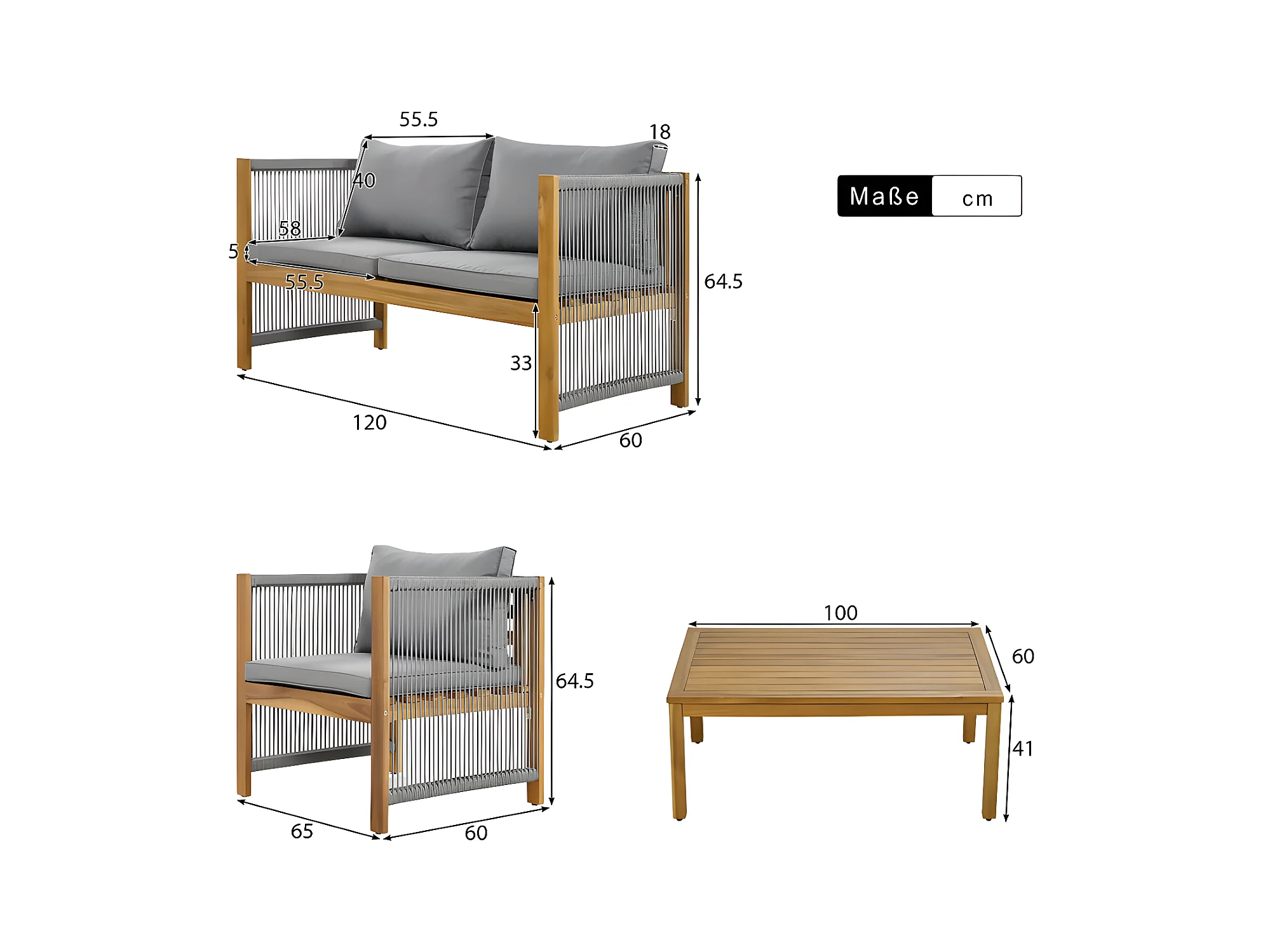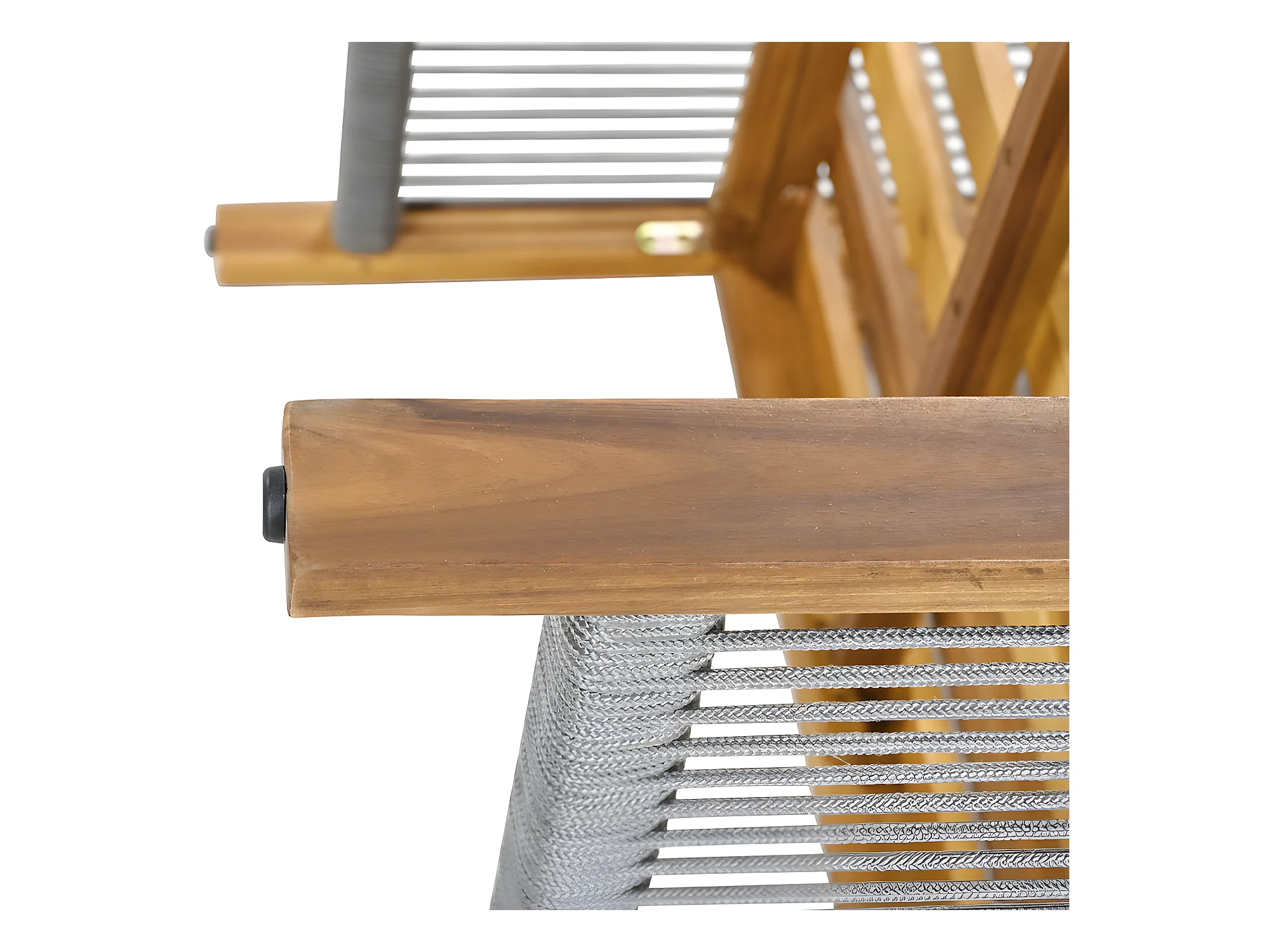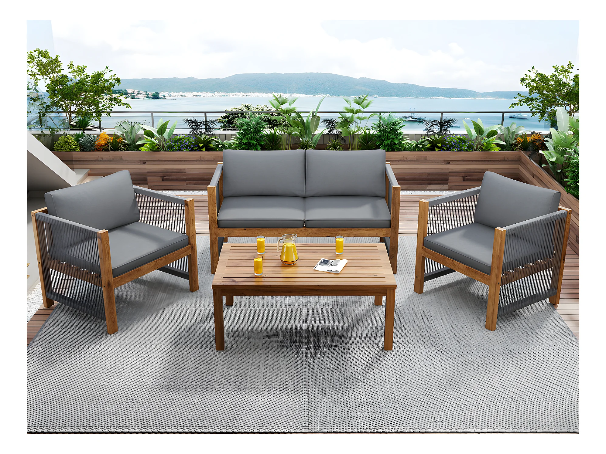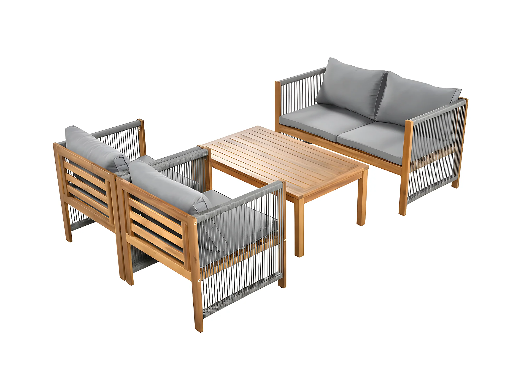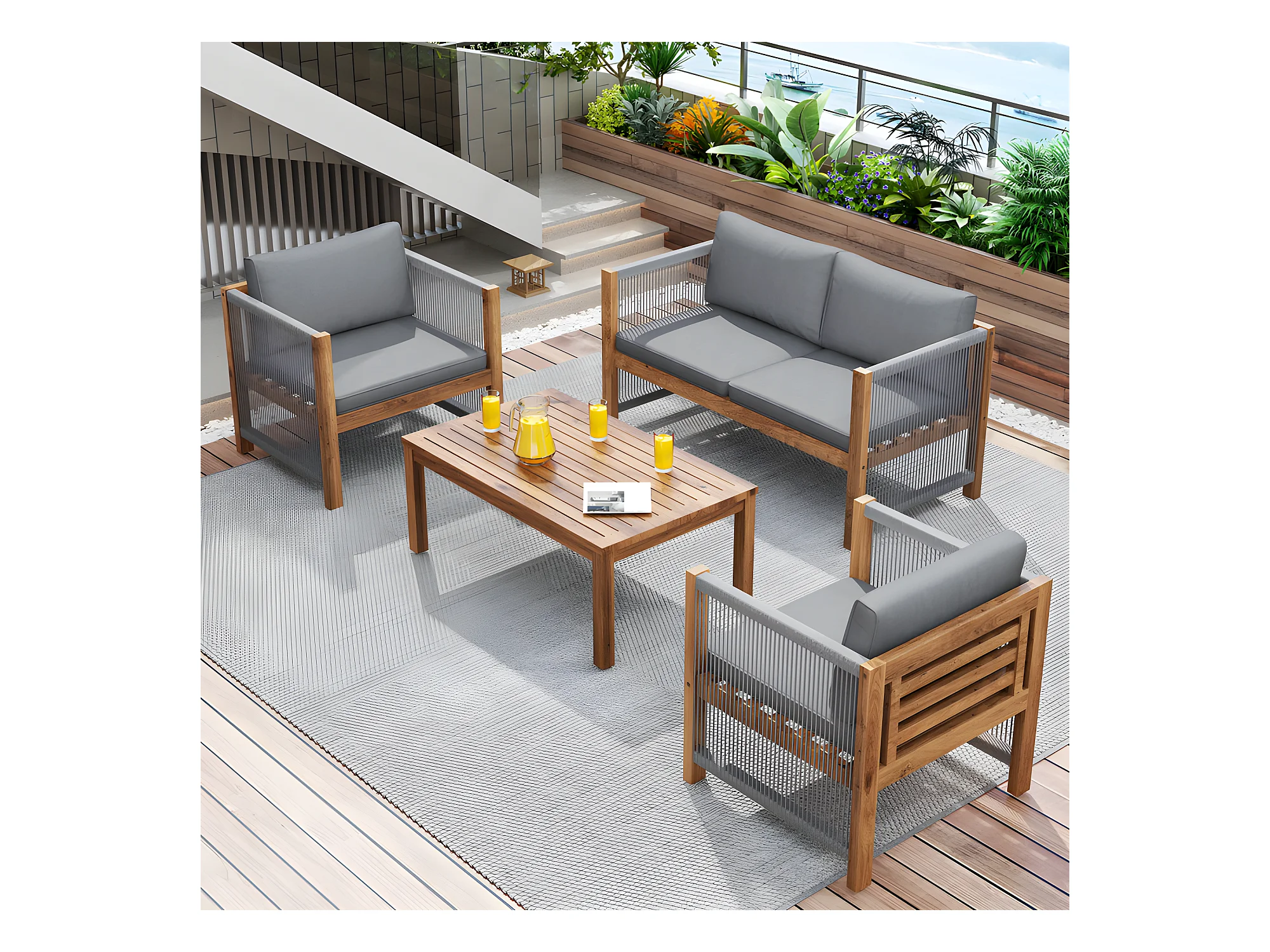 Mobiliario de jardín de acero de 4 plazas - sofá, 2 sillones y mesa de centro - en cuerda tejida y madera de acacia - Gris