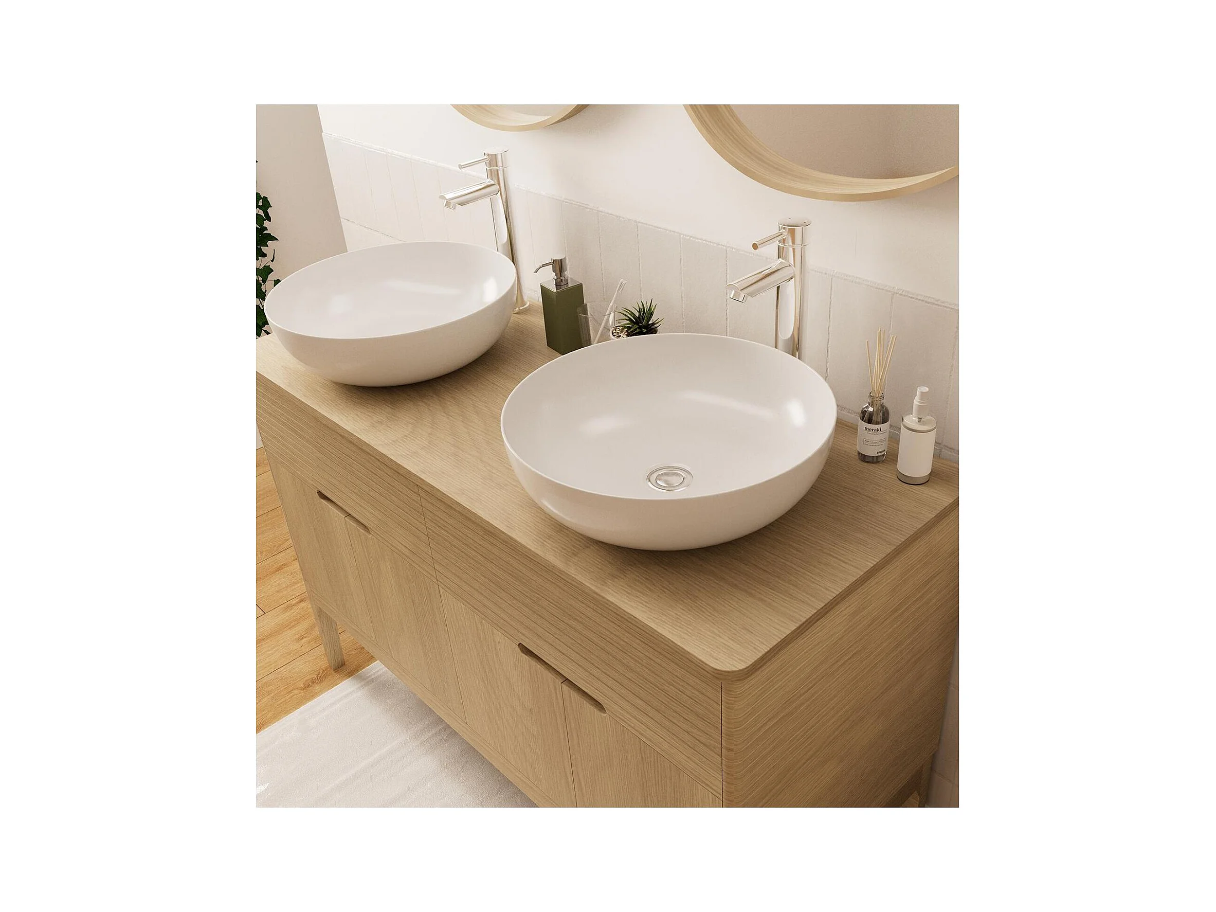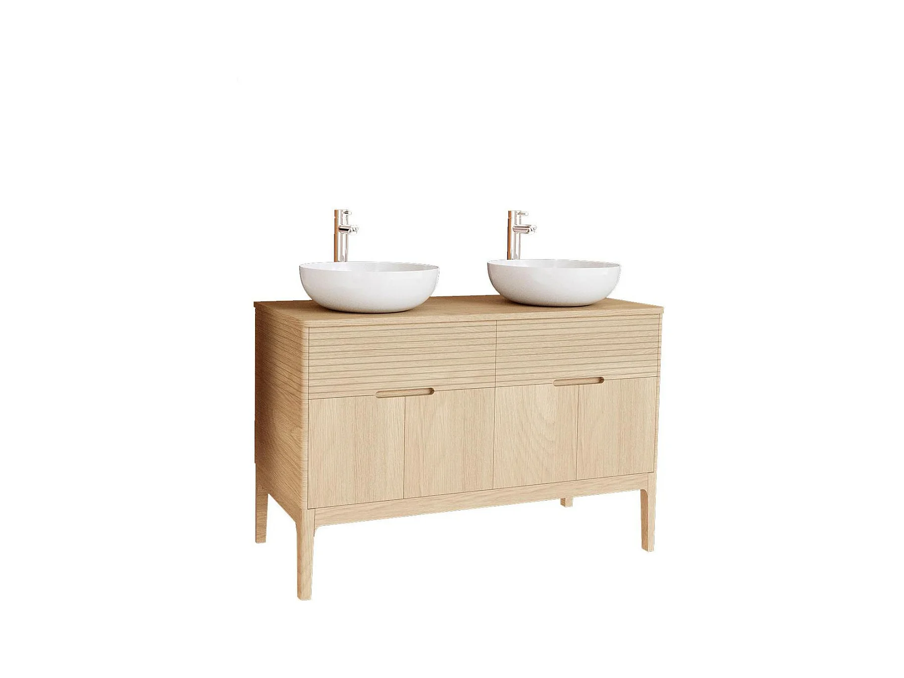 Mueble de pared SORRENTO de 120 cm con doble seno y encimera de madera, lavabos y grifería